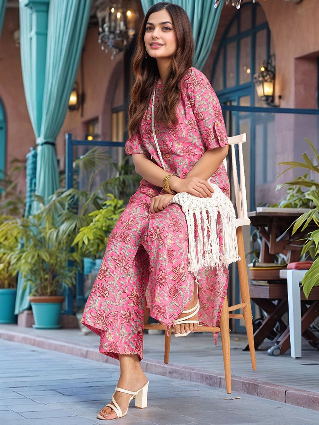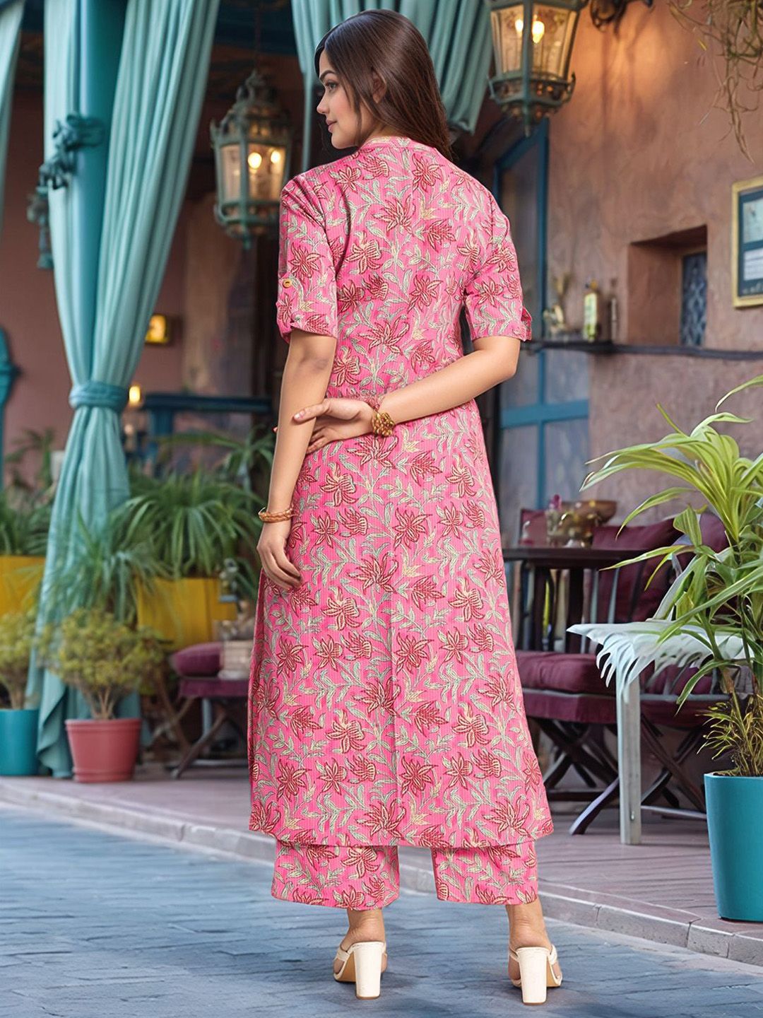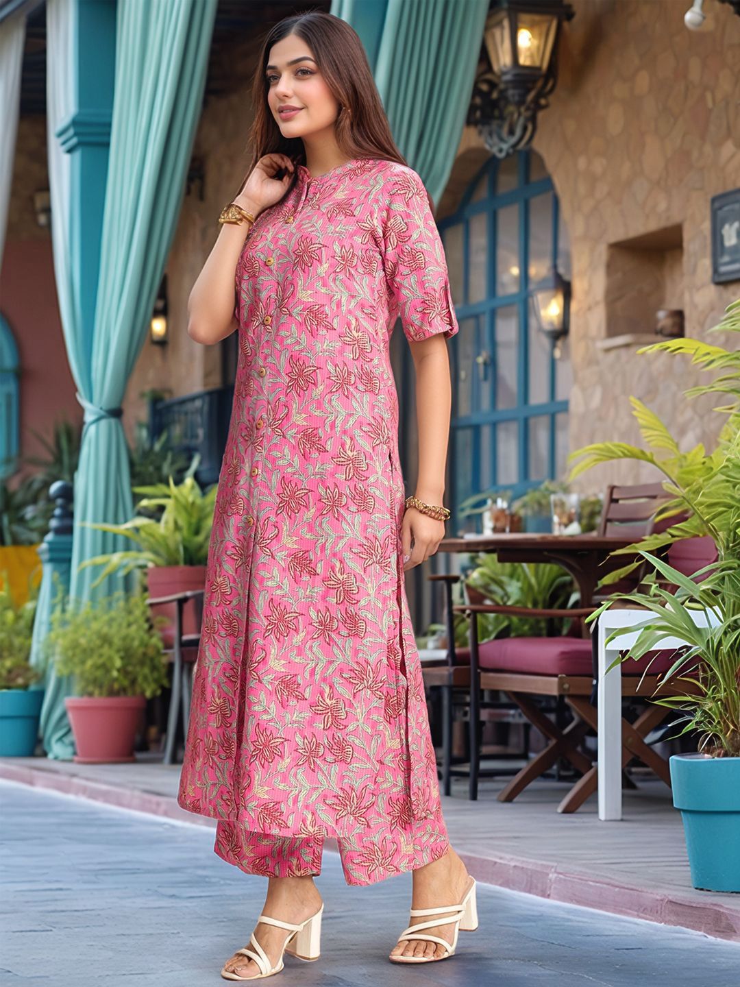 Aaghnya Floral Printed Mandarin Collar Straight Kurta With Trousers