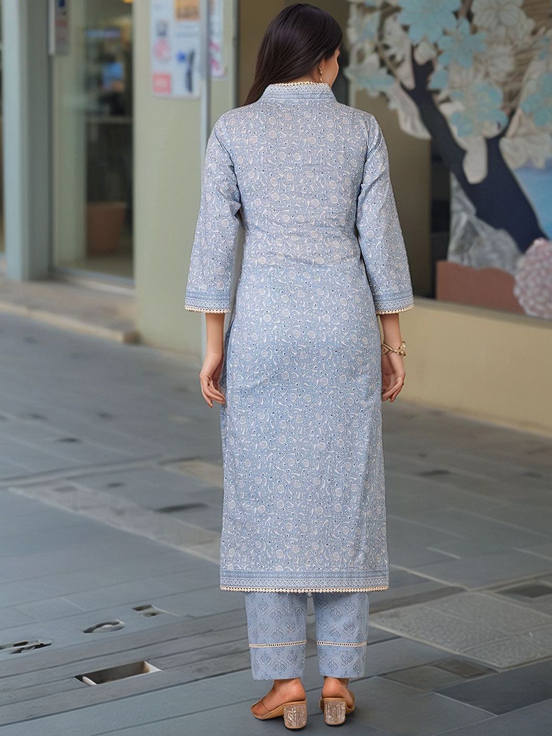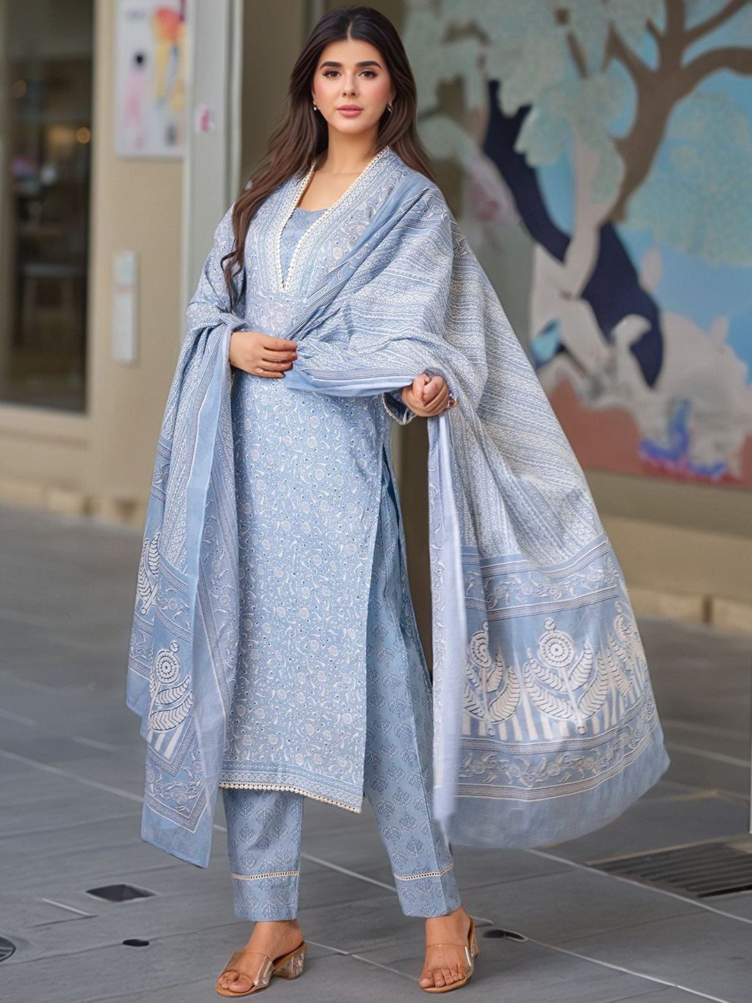 Aaghnya Floral Printed V-Neck Straight Kurta With Trousers & Dupatta