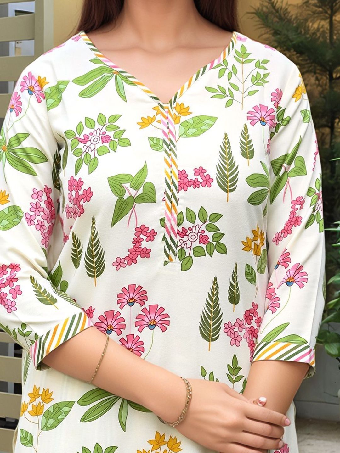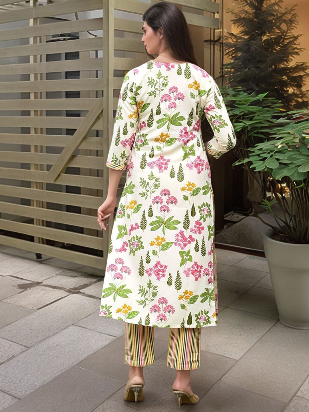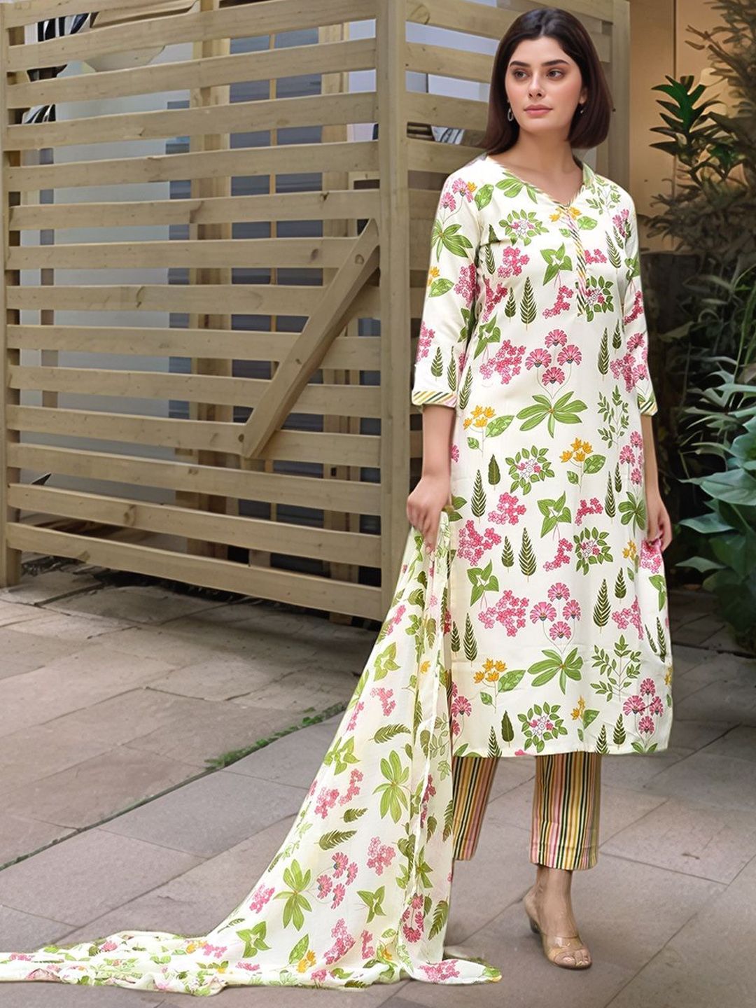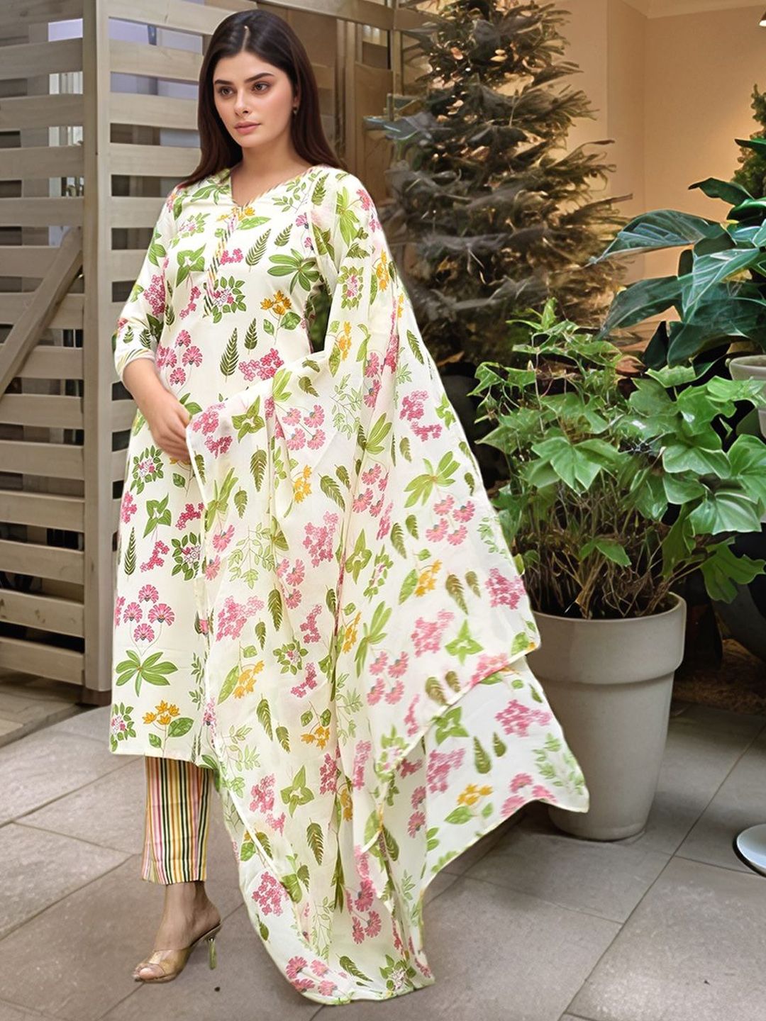 Aaghnya Floral Printed V-Neck Straight Kurta With Trousers & Dupatta