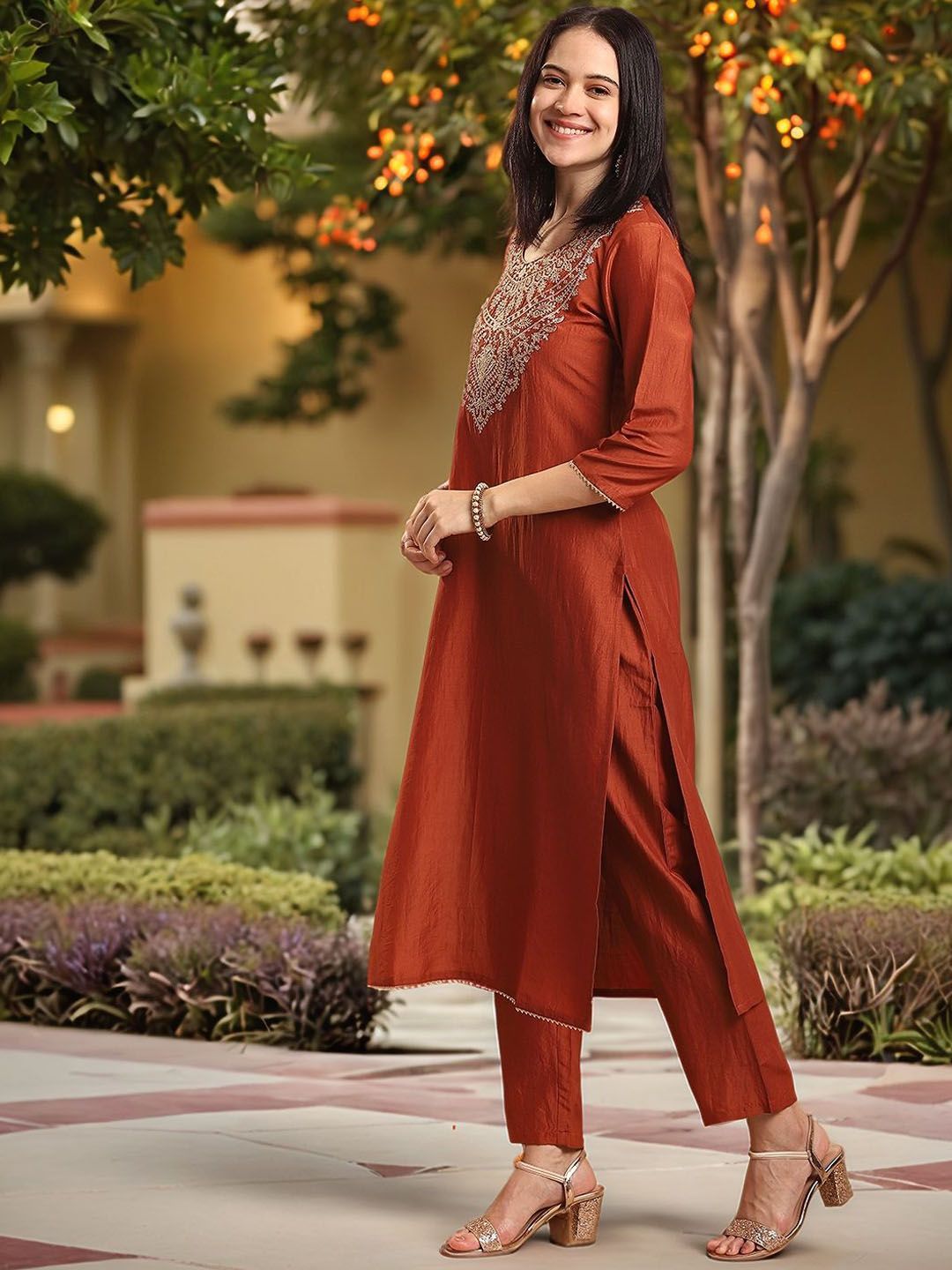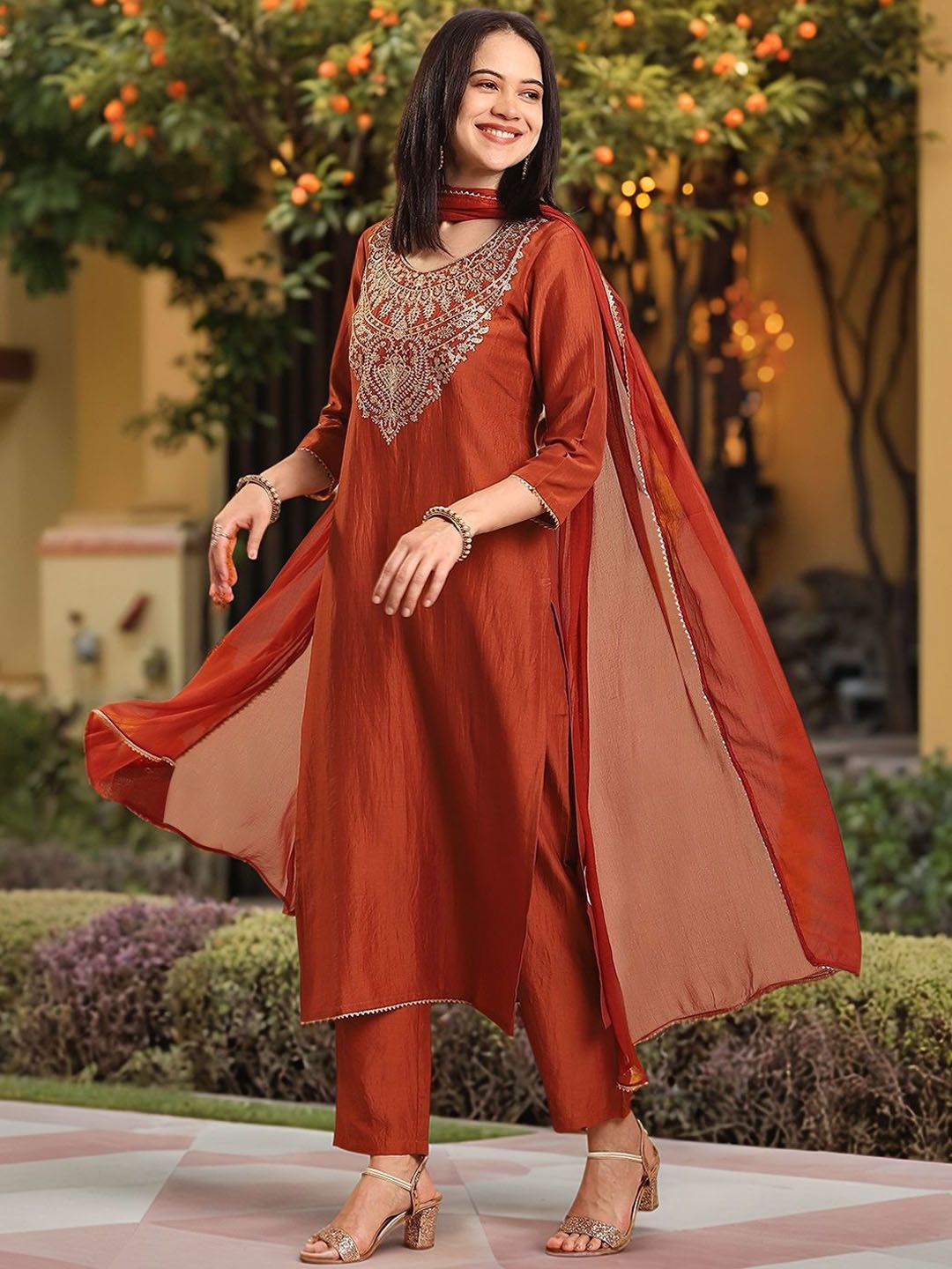 Aaghnya Floral Yoke Design Round Neck Thread Work Kurta with Trouser & Dupatta