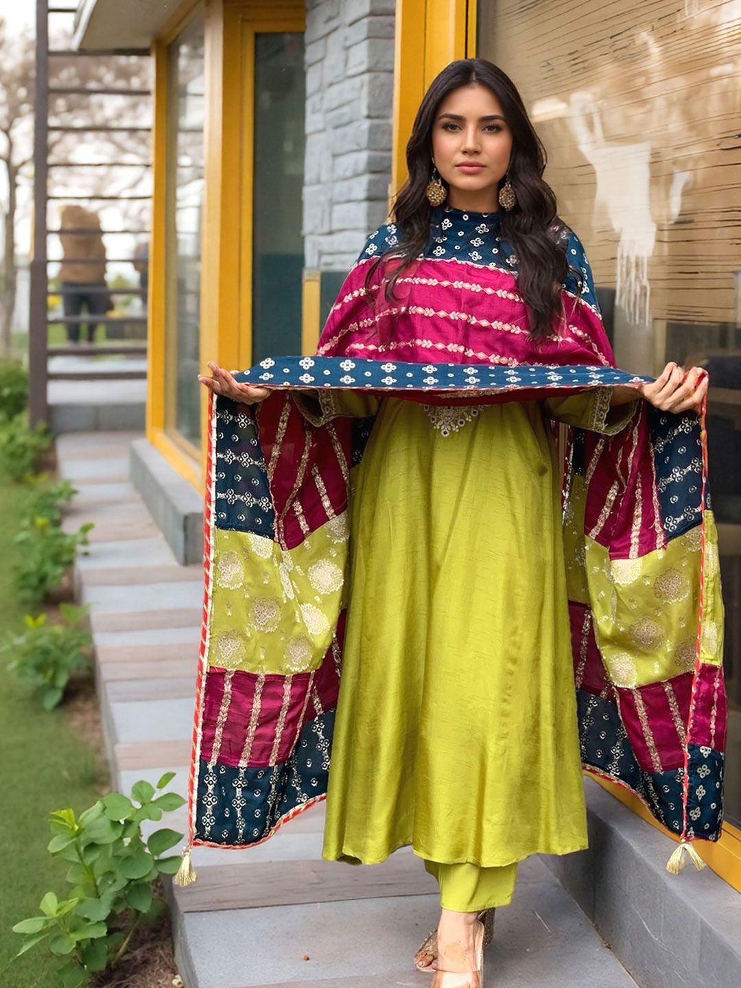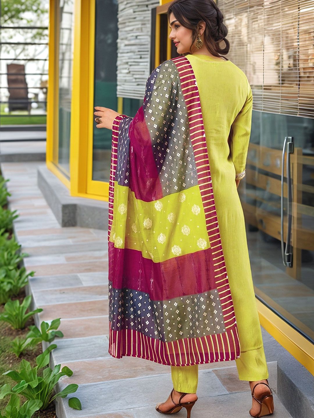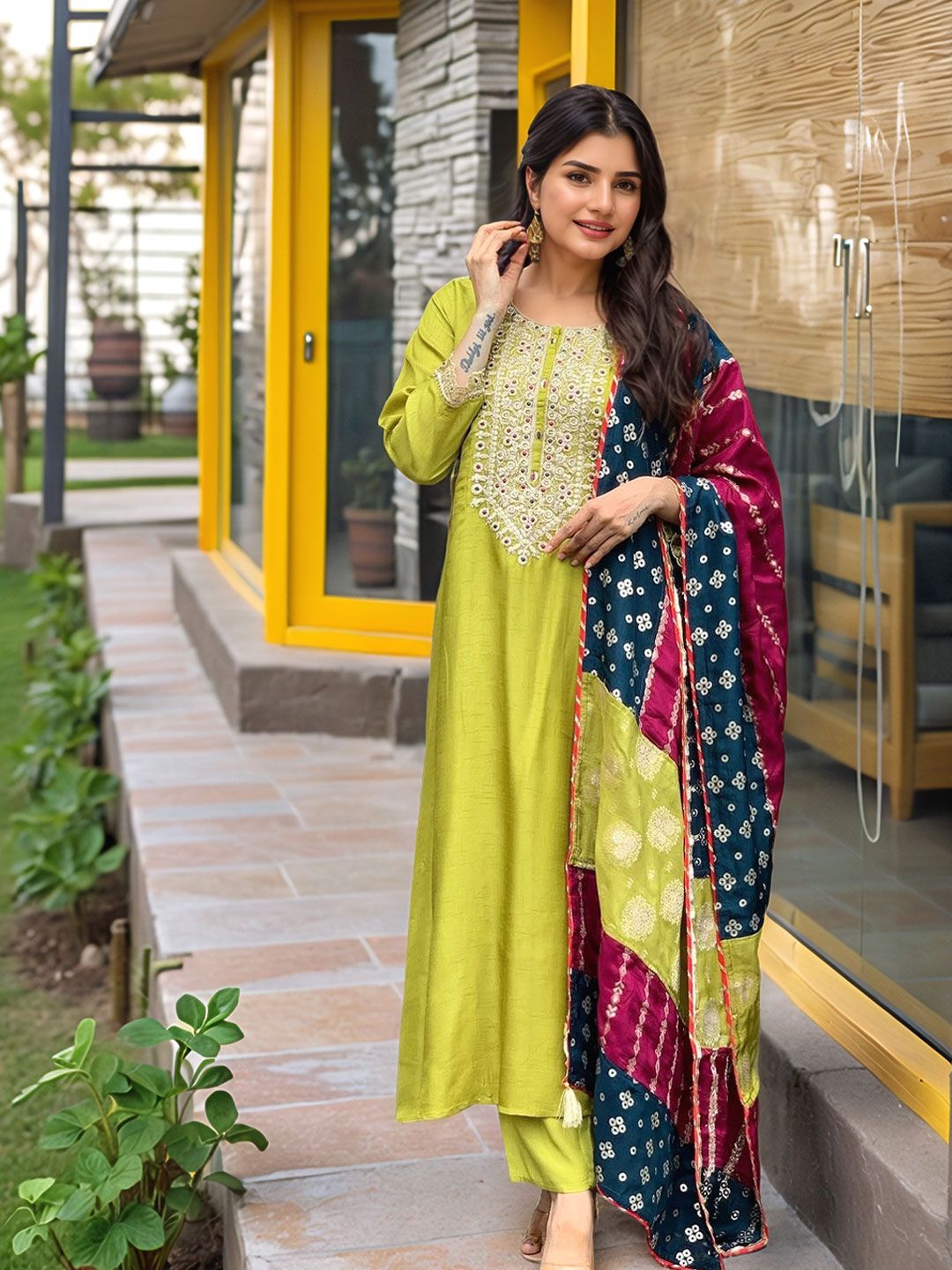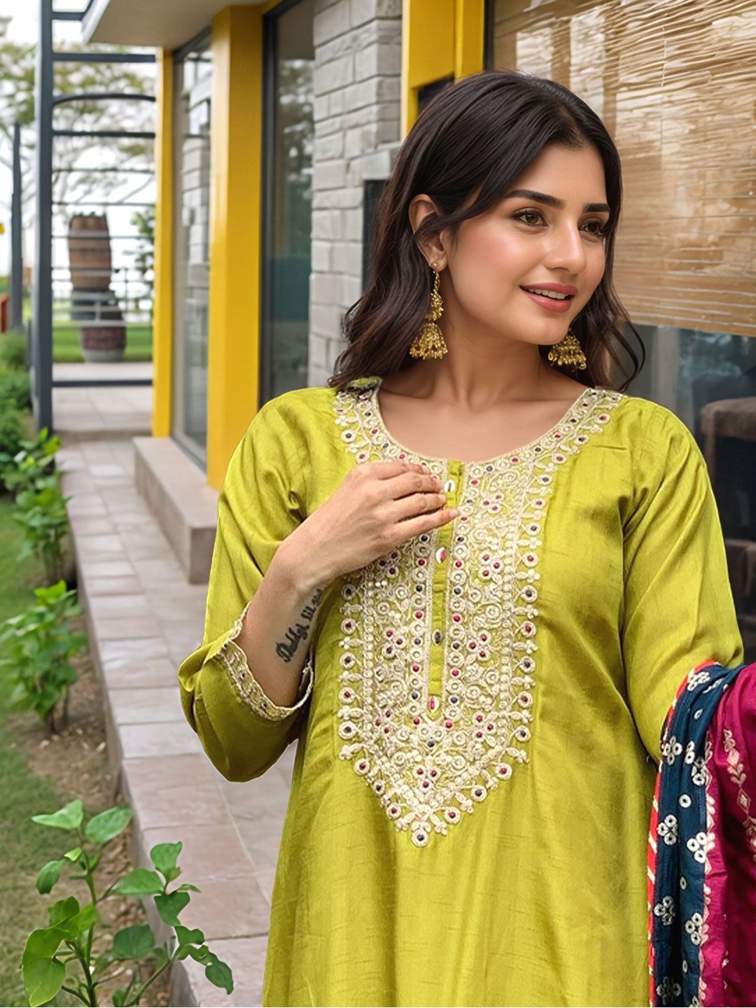 Aaghnya Floral Yoke Design Round Neck Thread Work Straight Kurta With Trousers & Dupatta