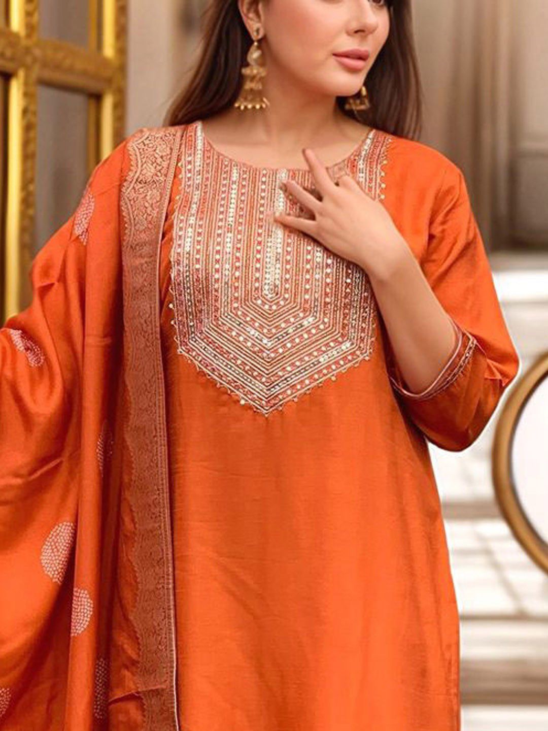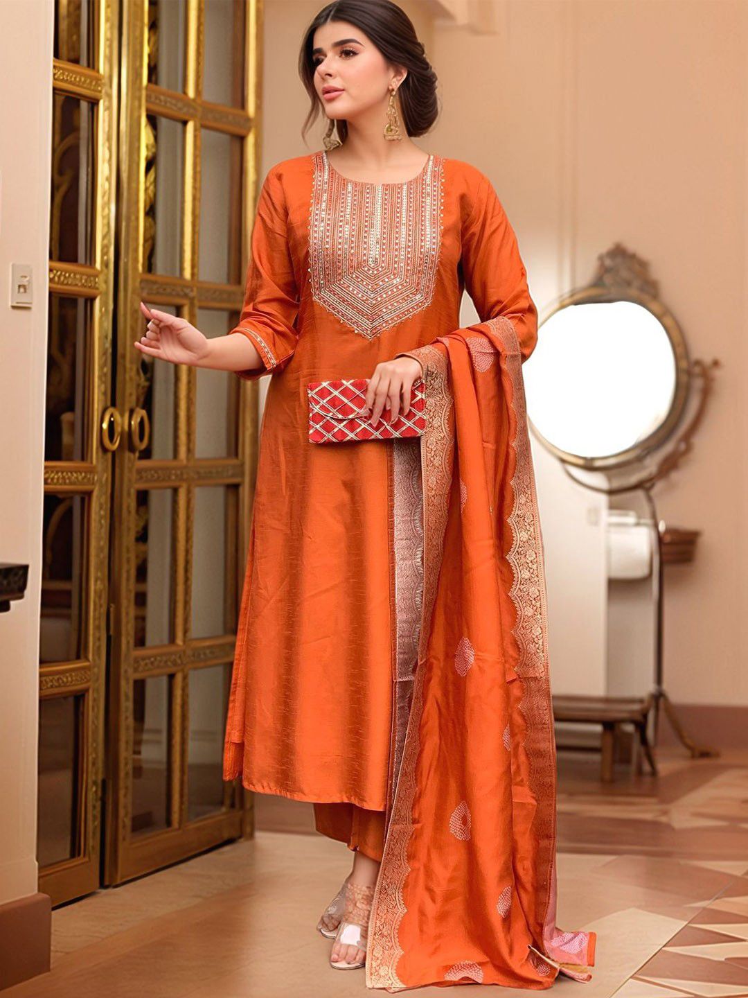 Aaghnya Geometric Embroidered Round Neck Kurta With Trousers & Dupatta