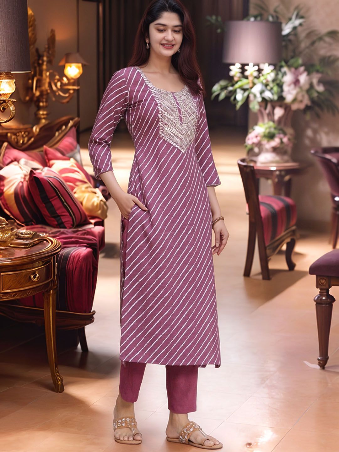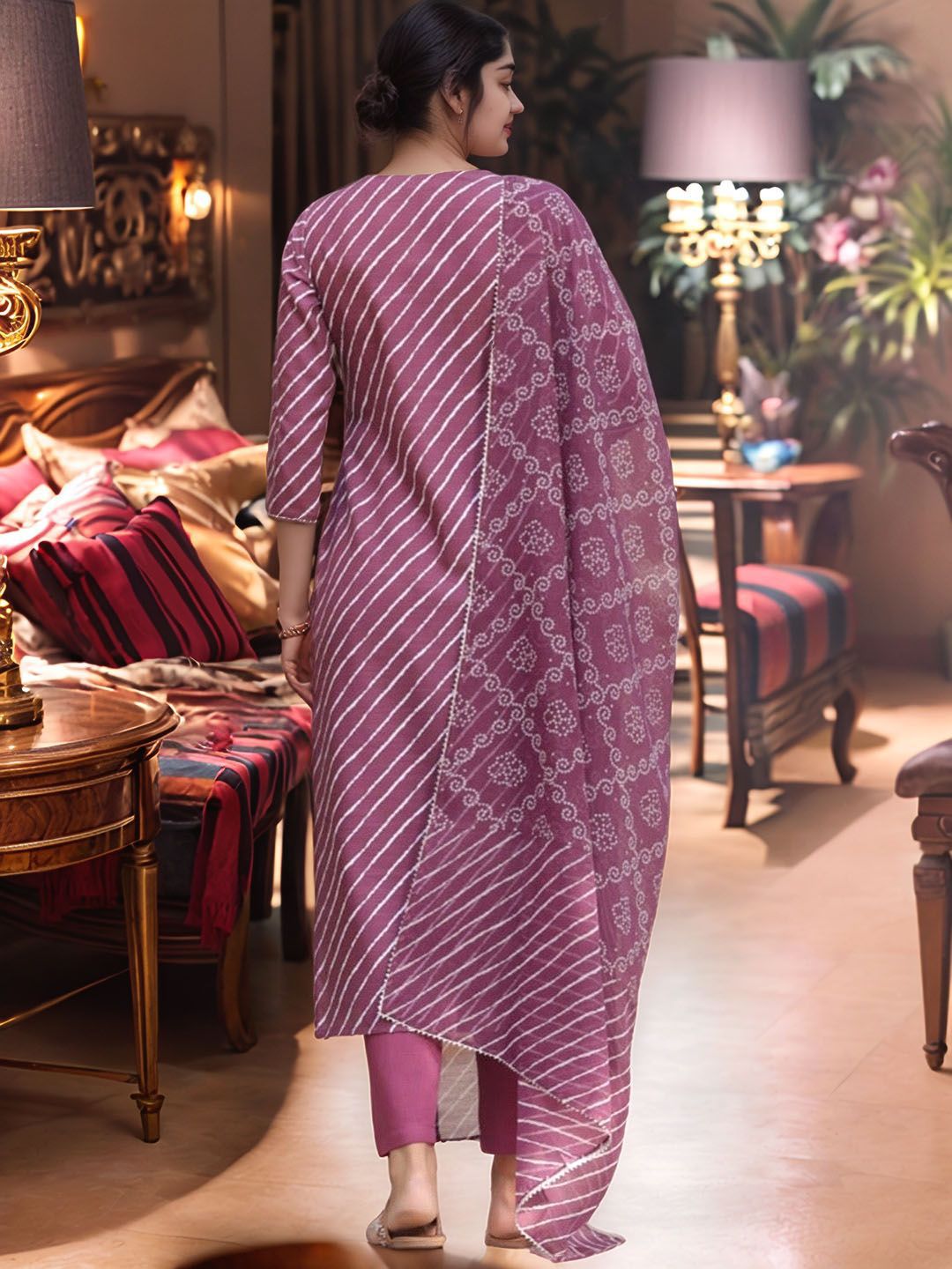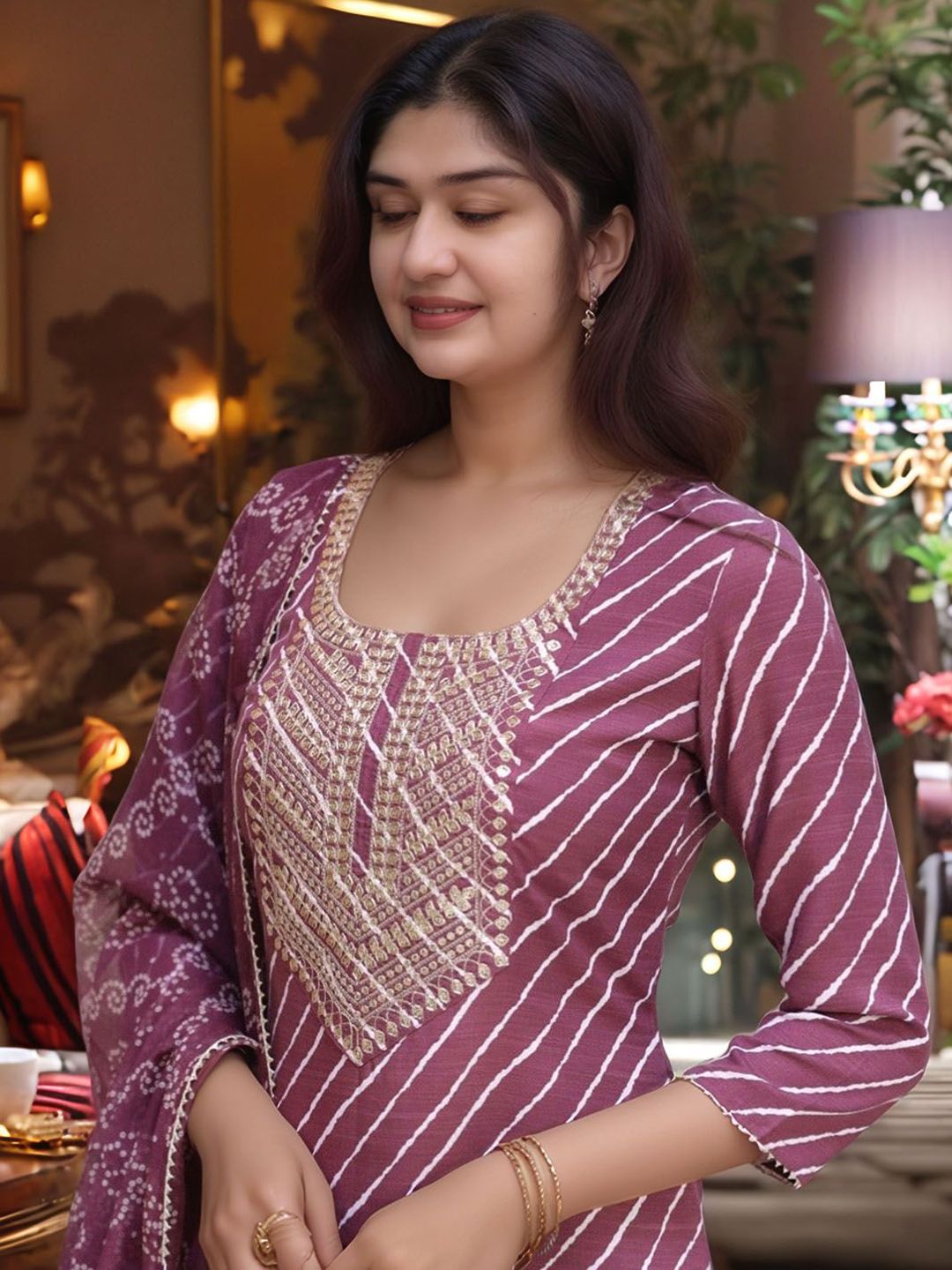 Aaghnya Leheriya Printed Round Neck Thread Work Straight Kurta with Trousers & Dupatta