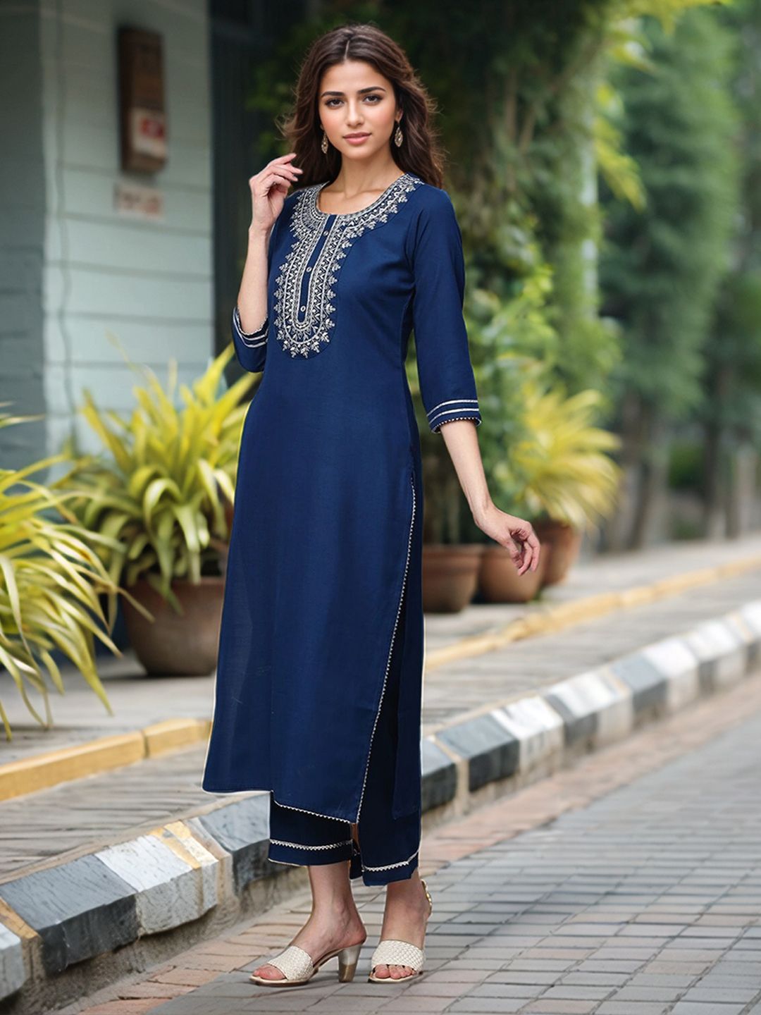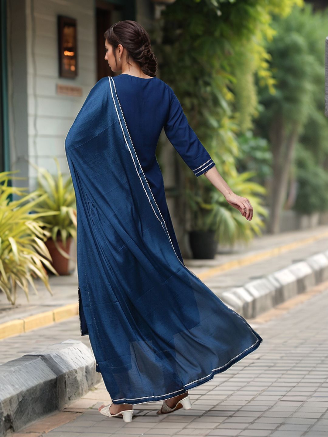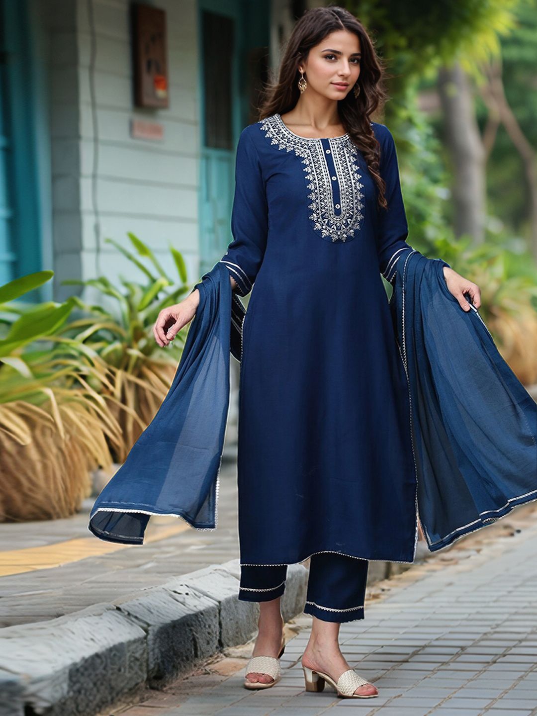 Aaghnya Women Ethnic Motifs Embroidered Kurta with Trousers & With Dupatta Kurta Sets