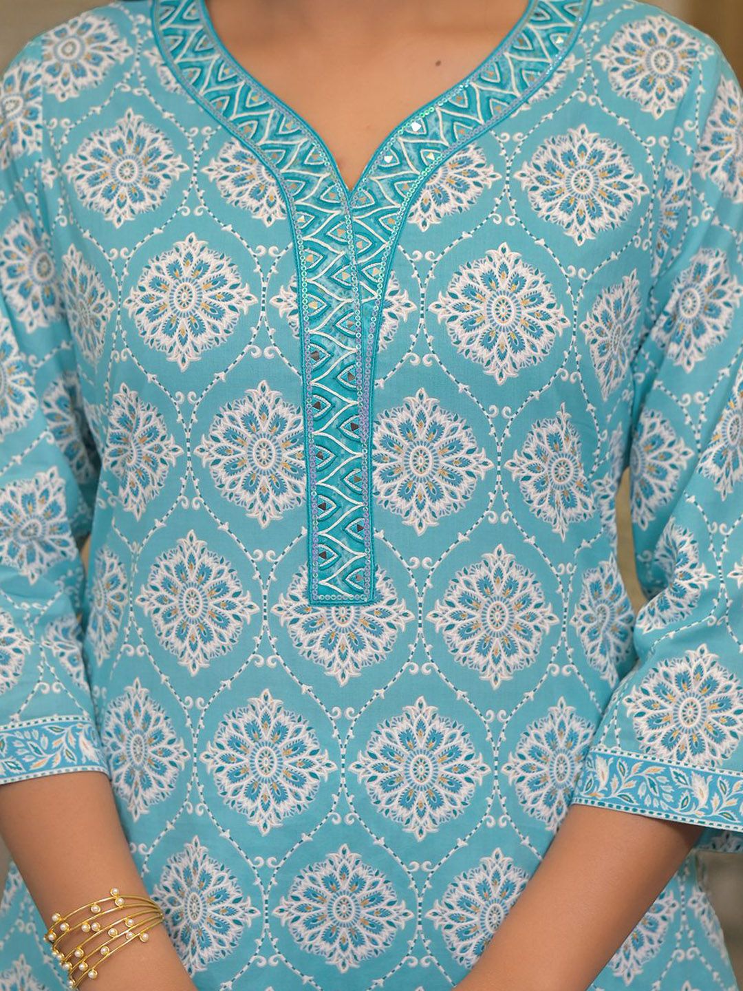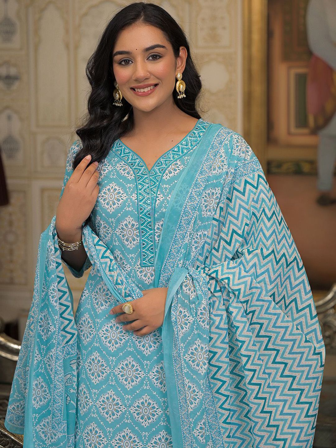 AARDRAA Floral Printed V-Neck Pure Cotton Straight Kurta With Trousers & Dupatta