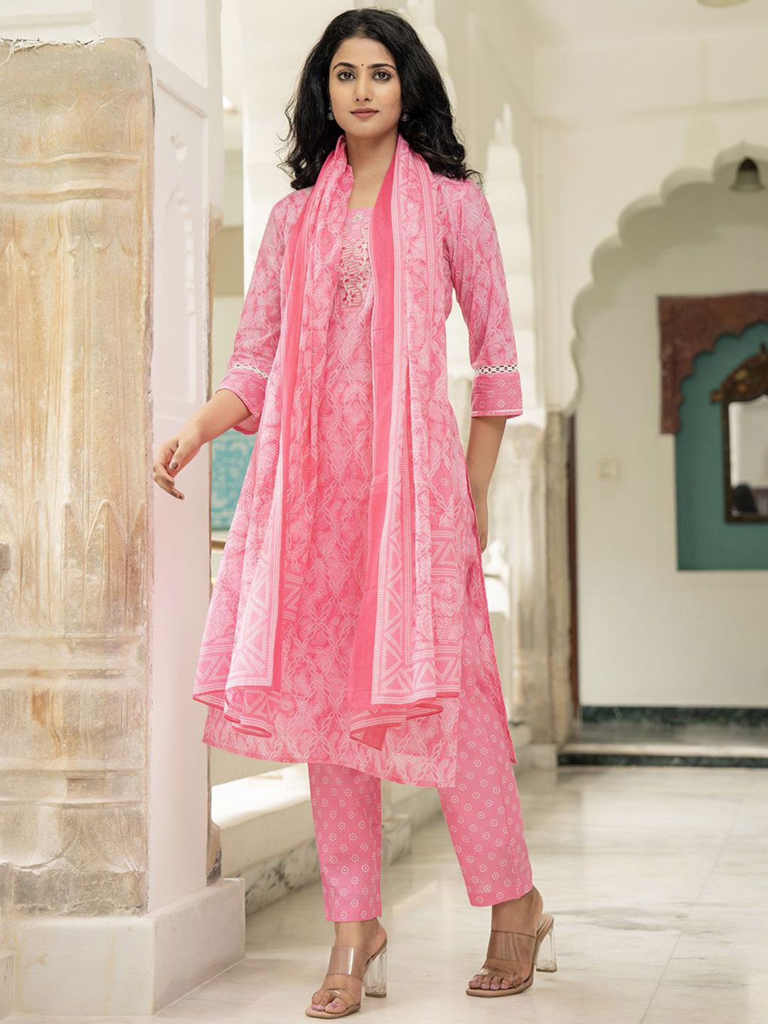 AARDRAA Floral Printed V-Neck Pure Cotton Straight Kurta with Trousers & Dupatta