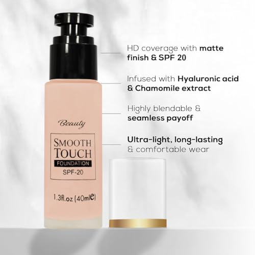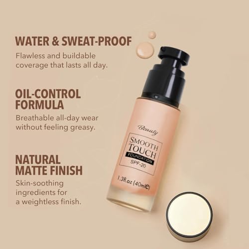 [FULL COVERAGE] Our foundation offers buildable coverage, allowing you to customize the level of coverage you desire, from medium to full, to effortlessly conceal imperfections. [MATTE FINISH] Say goodbye to shine with our matte formula. It controls oil and minimizes the appearance of pores, leaving your skin looking smooth and shine-free. [LIGHTWEIGHT TEXTURE] Despite its full coverage, our foundation feels lightweight on the skin, allowing for comfortable all-day wear without feeling heavy or cakey. [BLURS IMPERFECTIONS] Our formula contains light-diffusing ingredients that help blur the appearance of fine lines, wrinkles, and other imperfections, creating a smooth and even complexion. [BROAD SPECTRUM SPF 20] Our foundation is formulated with broad-spectrum SPF 20 to provide protection against both UVA and UVB rays, shielding your skin from the harmful effects of sun exposure, including premature aging and sunburn.