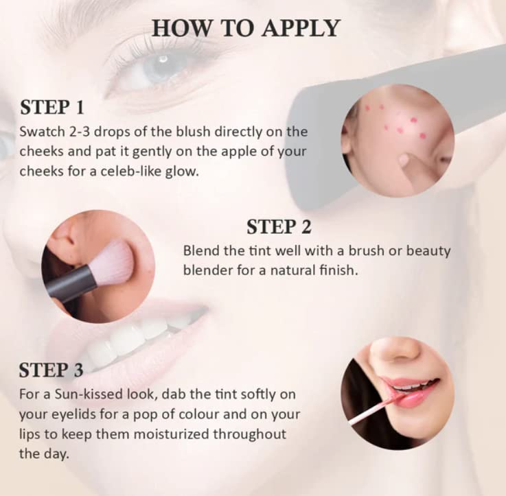 VITAMIN C Vitamin C boosts the production of collagen, leading to removing wrinkles and sagging of skin. It makes skin firmer and smooth and even skin tone. HEMPSEED OIL Hempseed oil is a proven ingredient to moisturize the skin without clogging pores. In addition to moisturizing and calming the skin irritations, hempseed oil has anti-aging properties too. RESULTS - ORIENTED FORMULA Infused with a unique formula of rich natural constituents ensures to protect the skin from any irritation. The formula is made to suit all skin types without showing any side effects. This Liquid Blusher Tint ensures to provide a subtle glow that lasts throughout the day