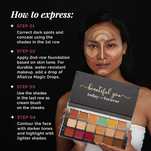 All-in-One Makeup Palette: Aflairza One For All (18 Shades) Face Makeup Palette includes foundation, concealer, contour, and blush—everything you need in just one compact and convenient palette. Blendable & Long-Lasting: Highly blendable formula with a matte finish ensures seamless application and all-day wear, perfect for professional or daily use. Flawless Foundation: Features 6 foundation shades to suit fair, medium, and deep skin tones, creating a smooth and even base for any makeup look. Complete Concealer Coverage: Includes 6 concealer shades to hide blemishes, dark circles, and imperfections, providing a radiant and flawless finish. Blush & Contour Perfection: Enjoy 3 blush shades for a natural to bold flush and 3 contour shades to sculpt and define your features for a stunning, professional look Defined Contouring: The last three shades in the third line are dedicated to contouring, helping you sculpt and define your features for a stunning, contoured look that enhances your facial structure.