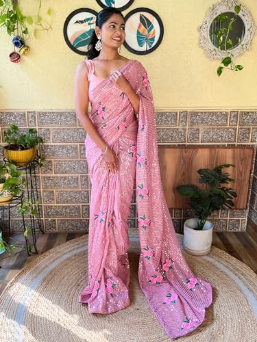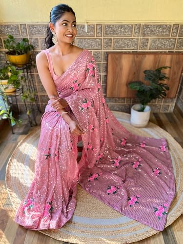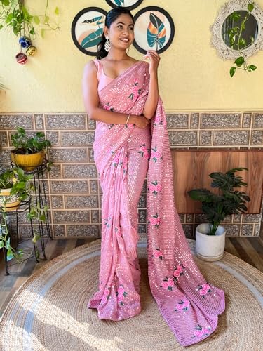 AKHILAM Women's Georgette Grey Embellished Designer Saree With Unstitched Blouse Piece (KESARI1606_KR)