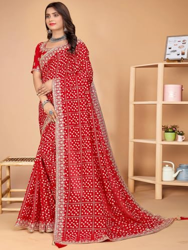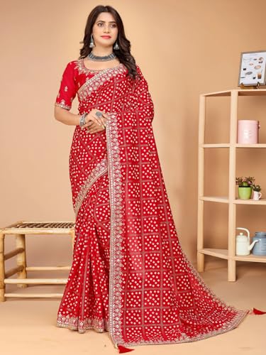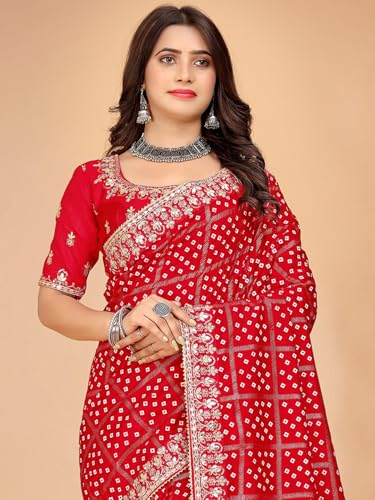 AKHILAM Women's Red Vichitra Silk Bandhani Printed Saree With Unstitched Blouse Piece (ANGEL2006_AG)