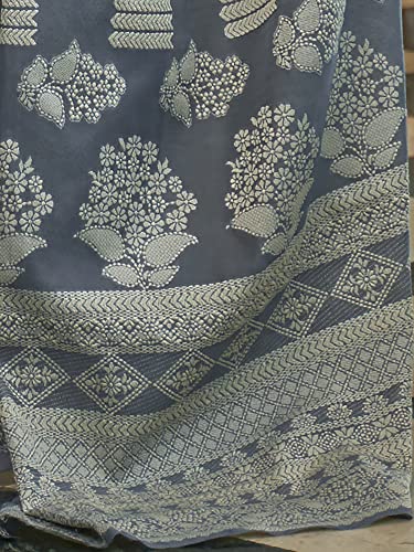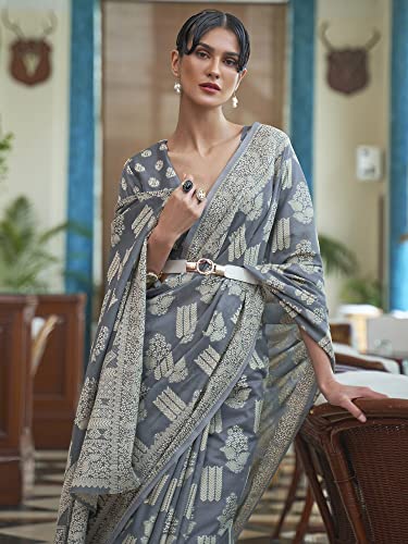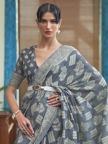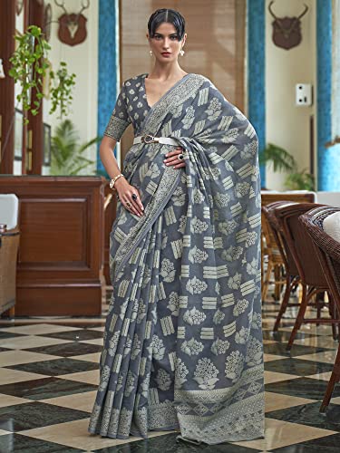 AKHILAM Women's Woven Design Cotton Linen Saree With Unstitched Blouse Piece (Charcoal Grey_KRMA229003)