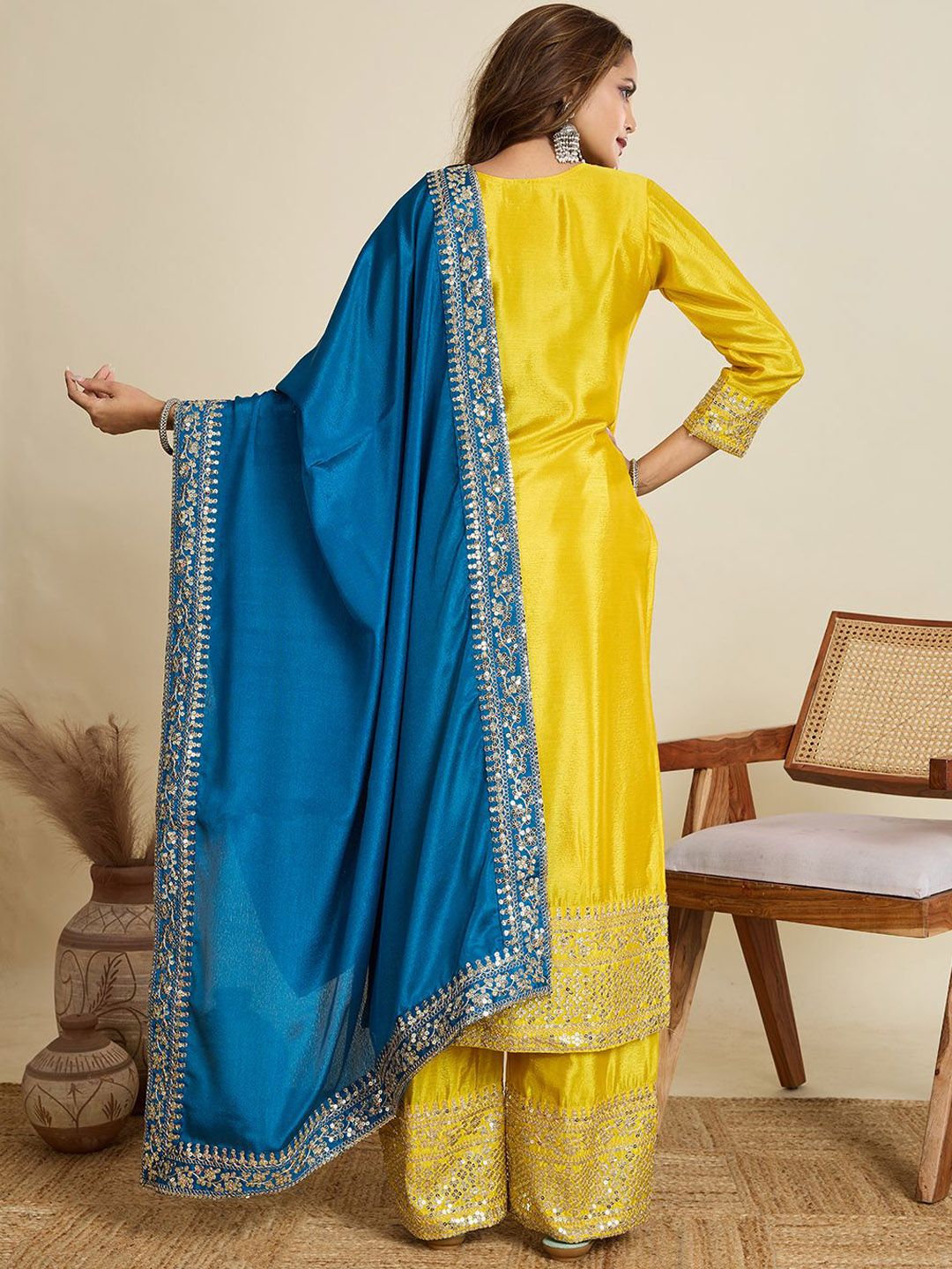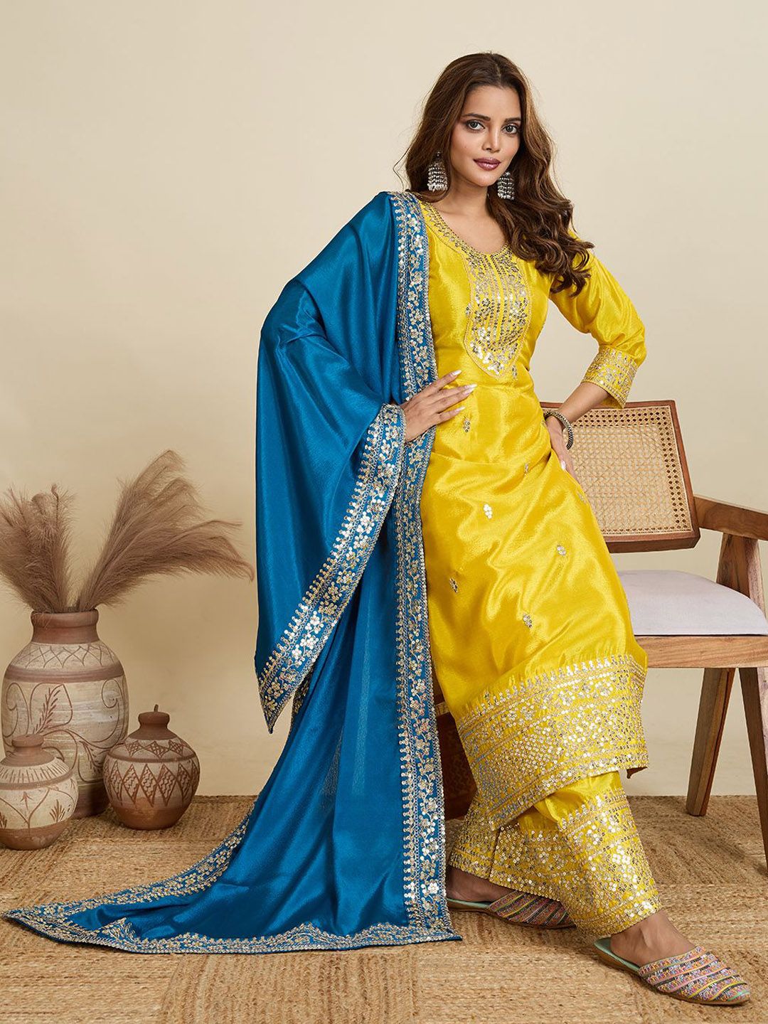 AKSHARAM Women Floral Embroidered Regular Sequinned Kurta & Trousers & Dupatta