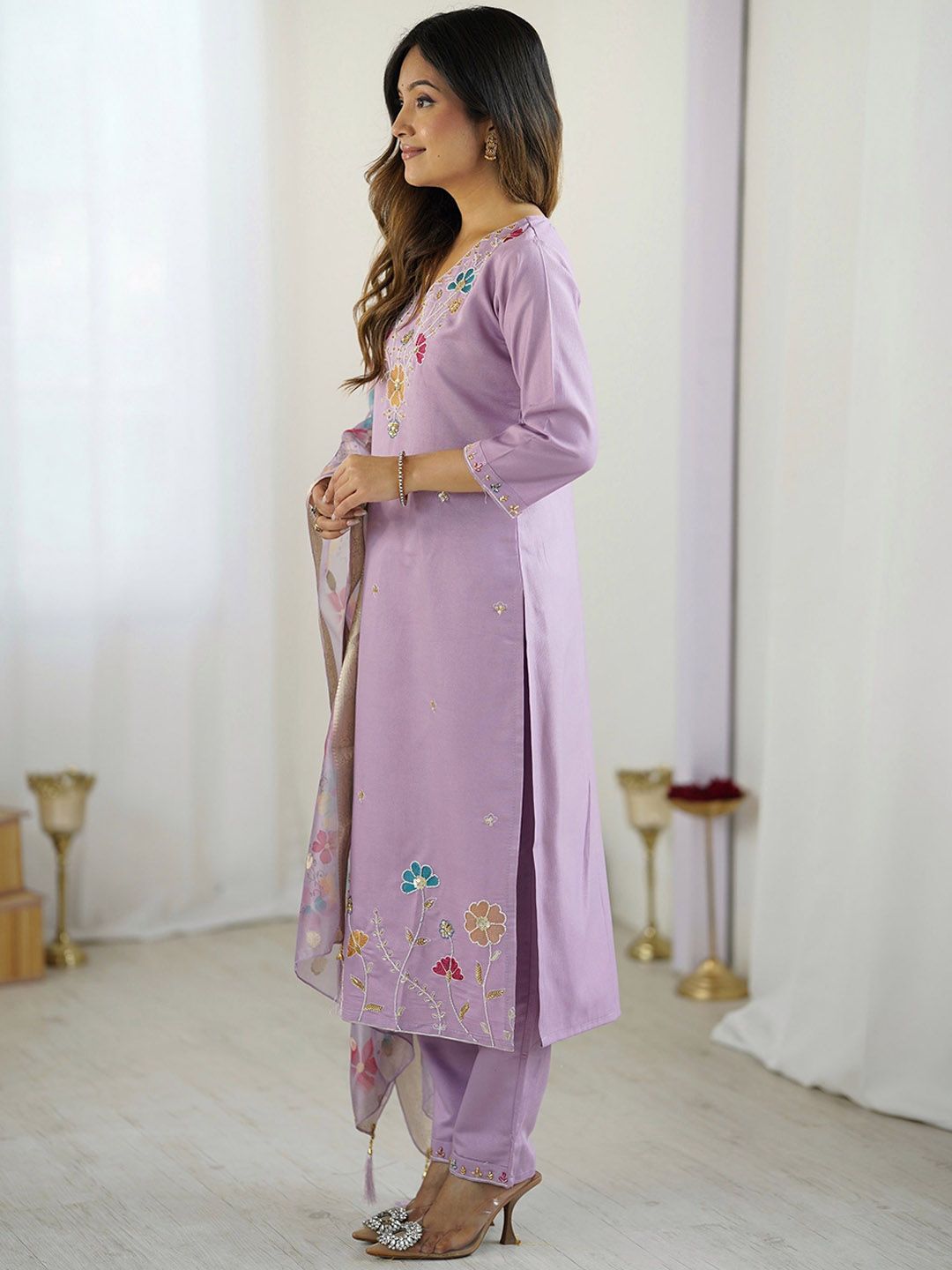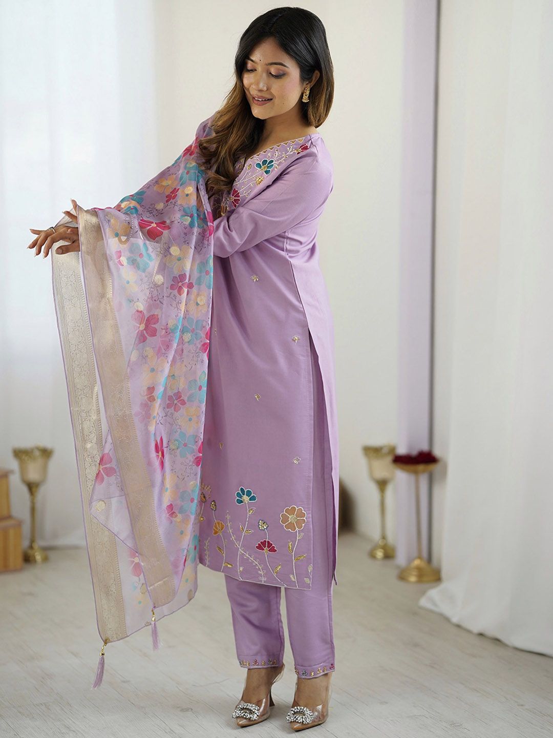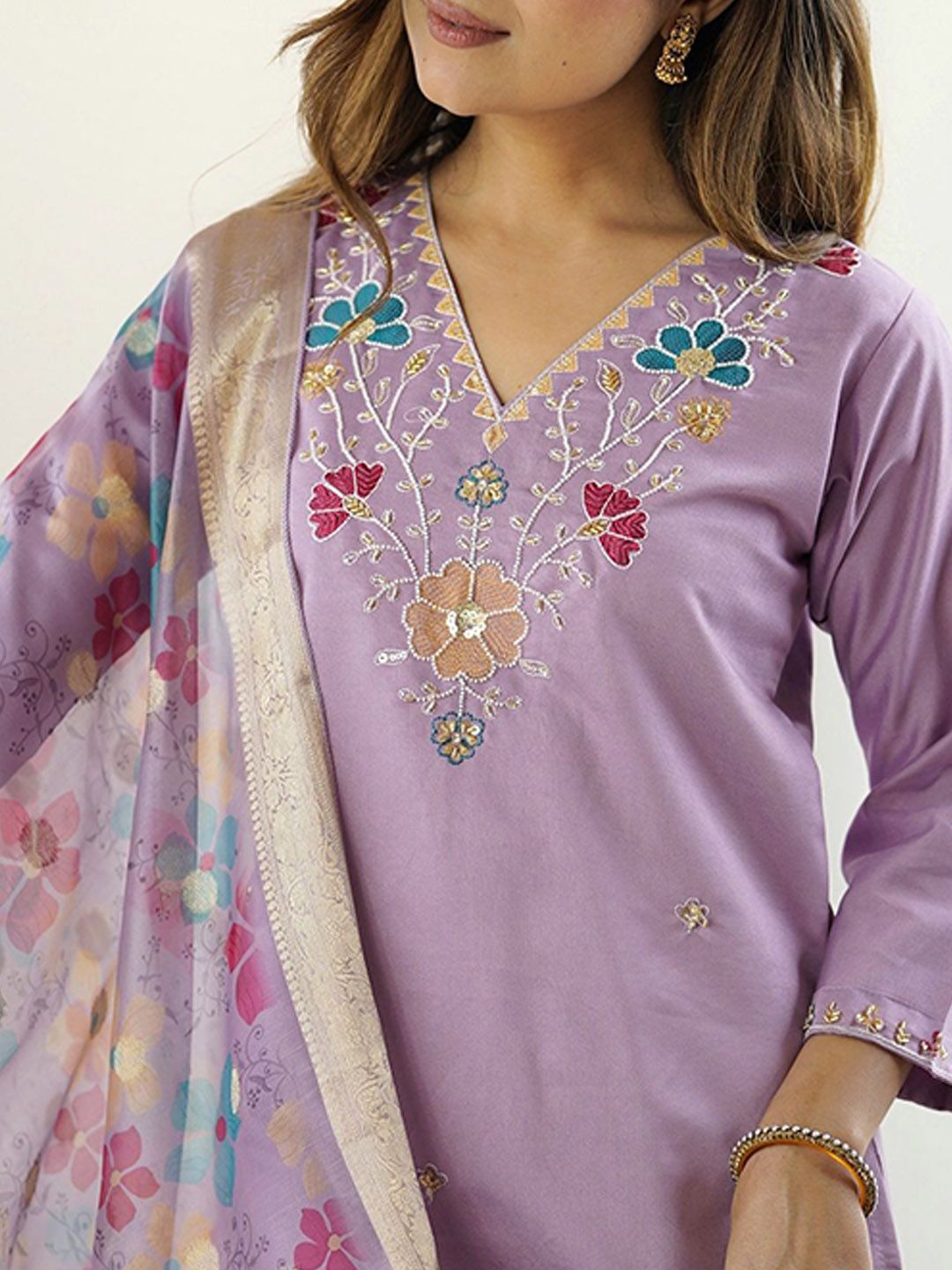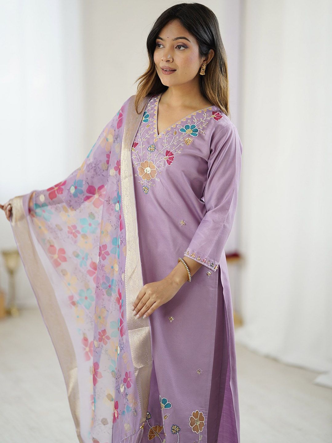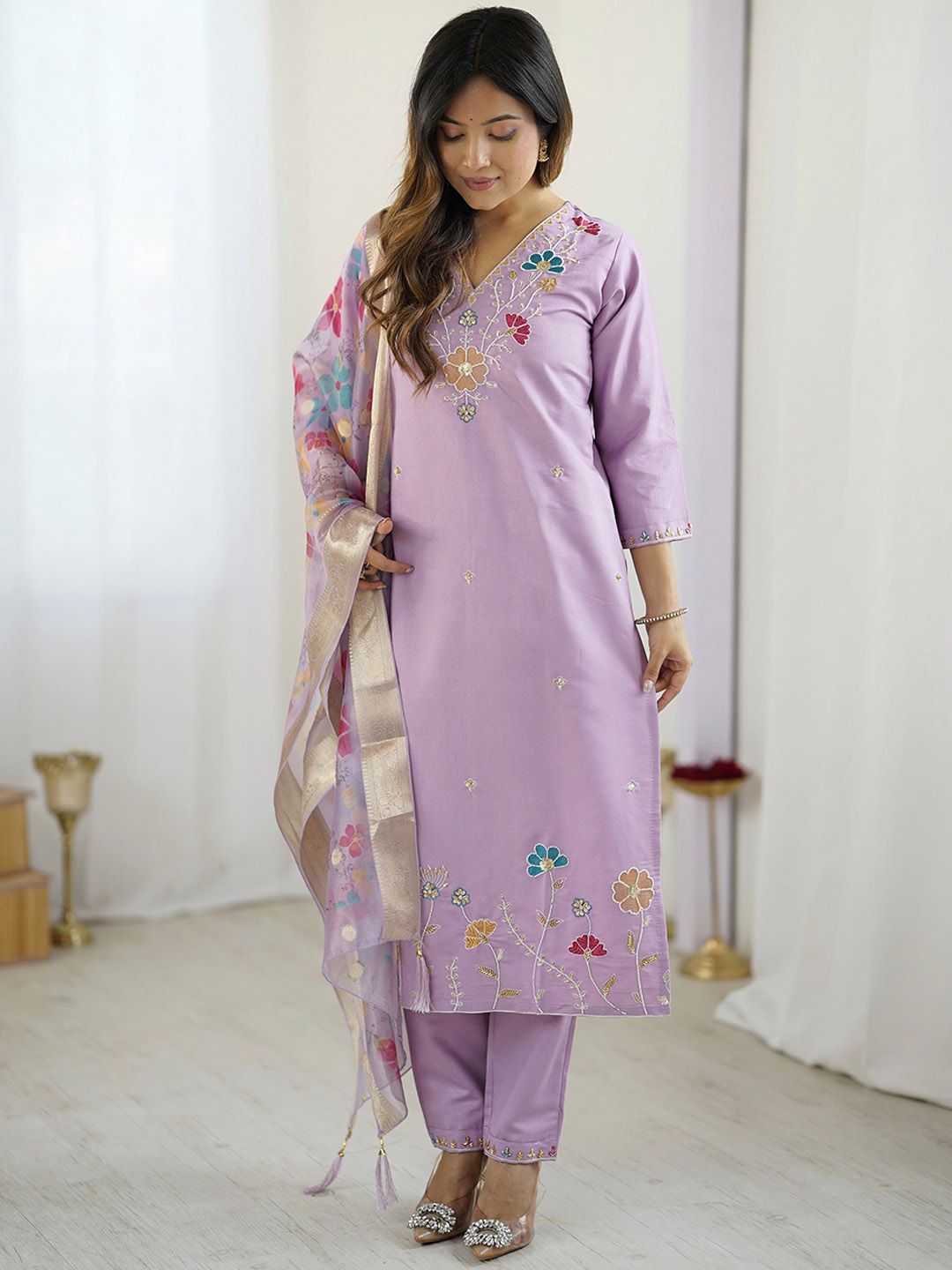 all about you Embroidered V-Neck Beads and Stones Straight Kurta With Trousers & Dupatta