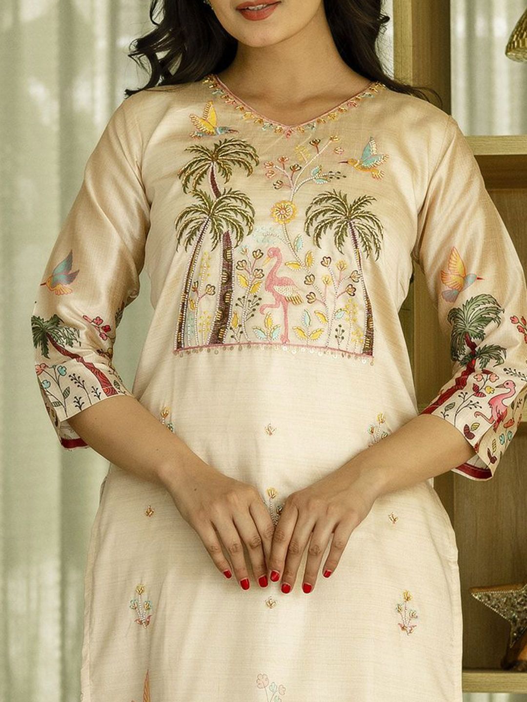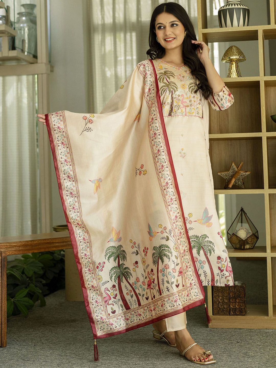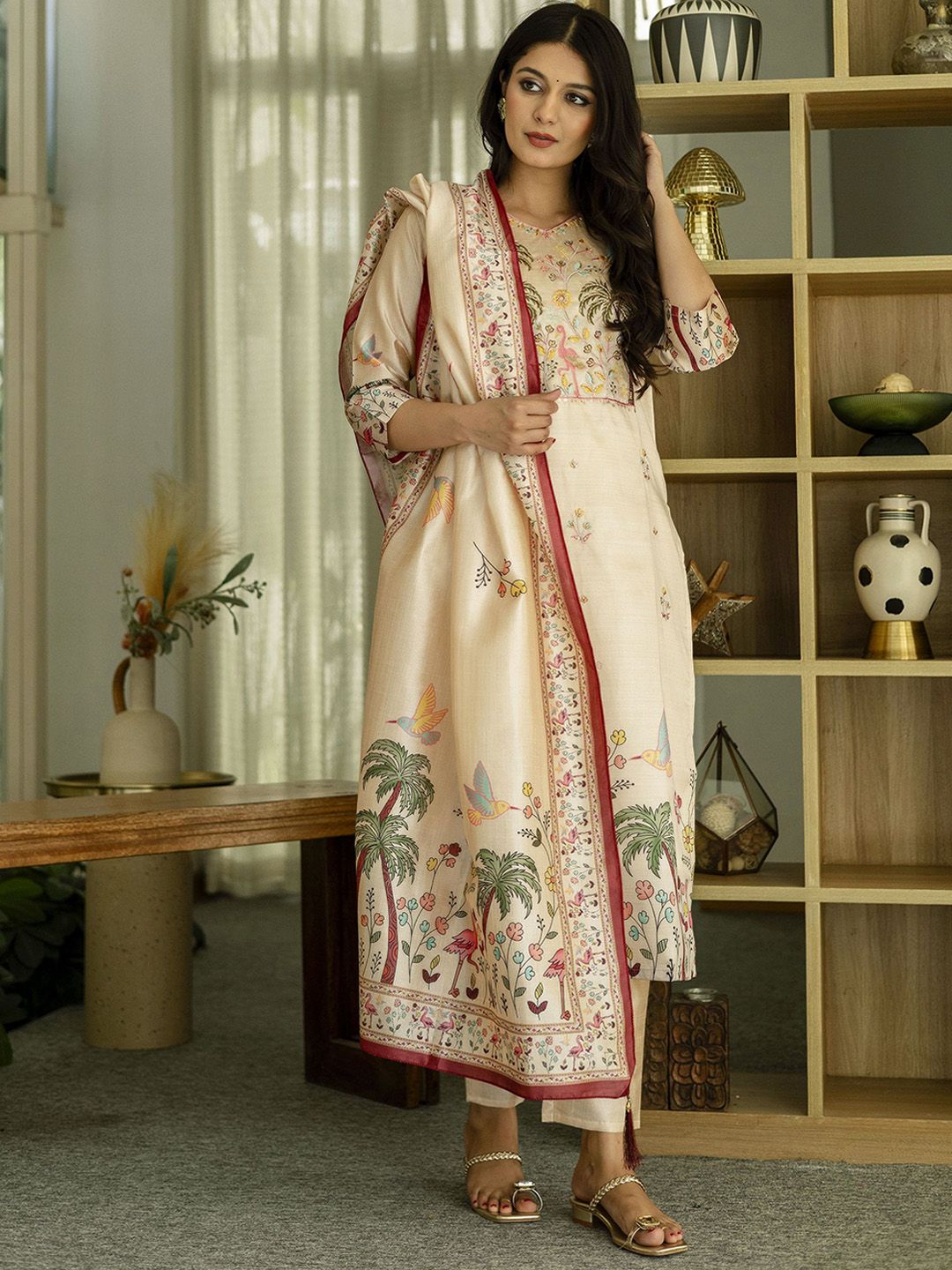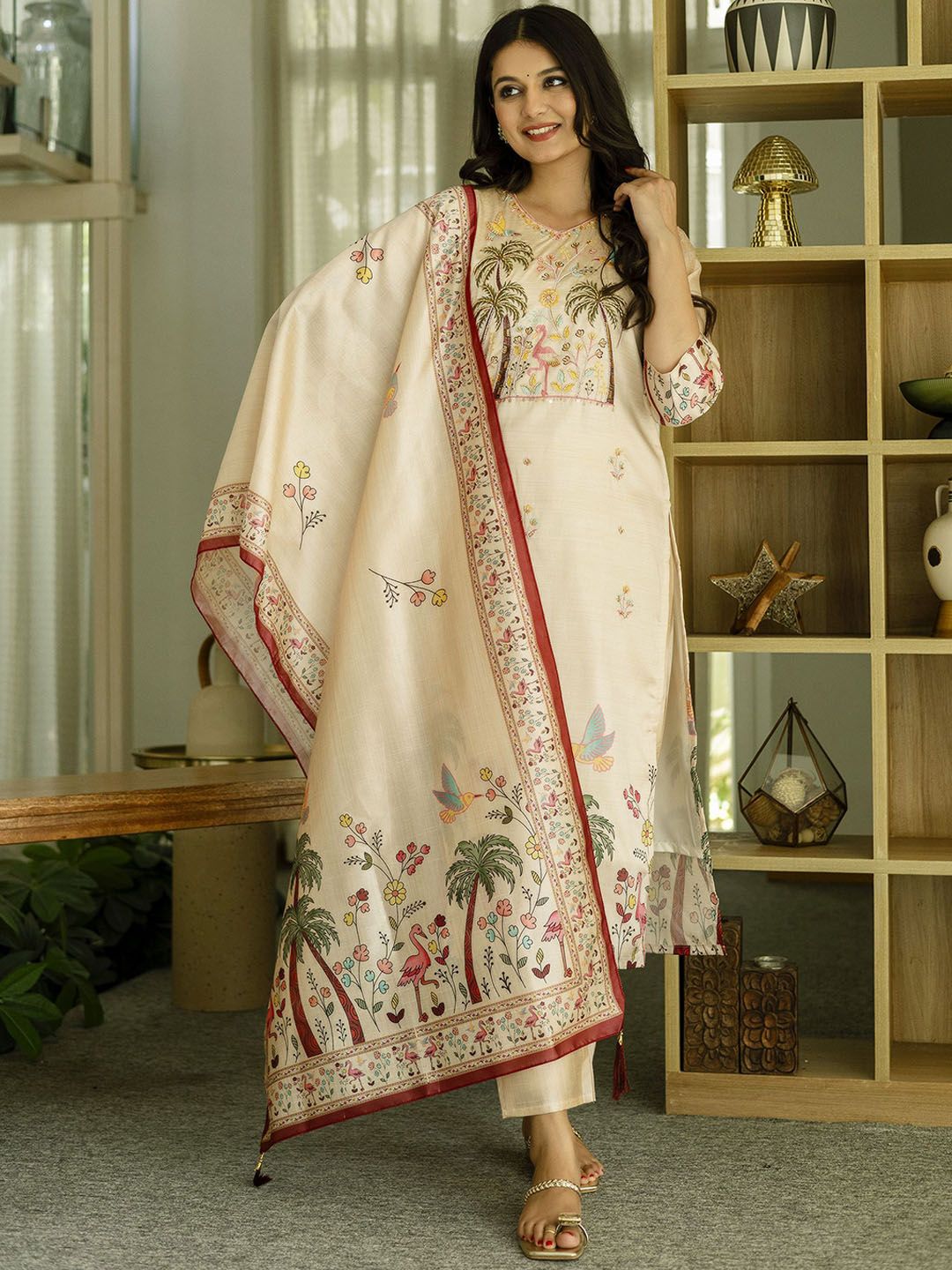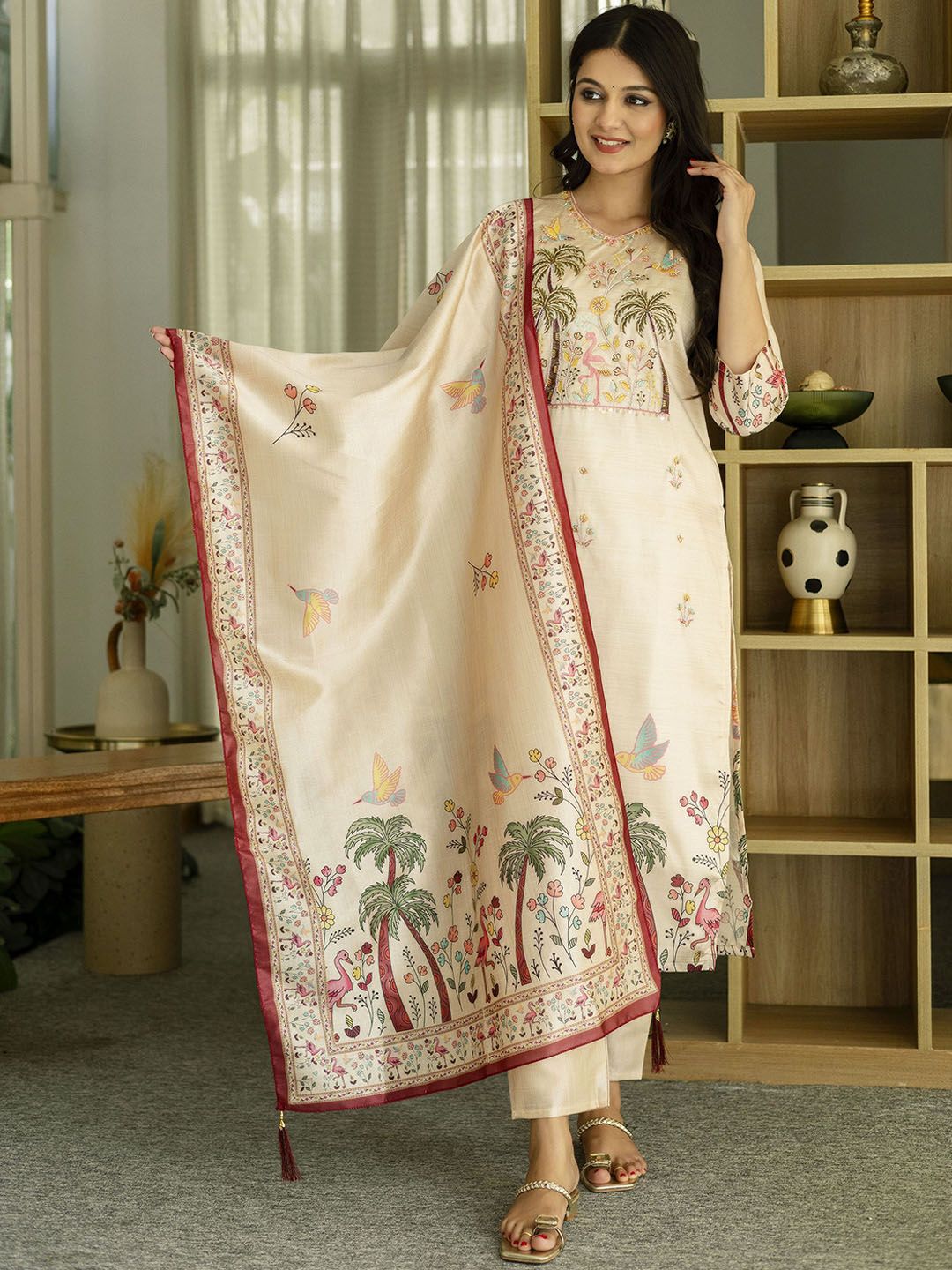 all about you Floral Embroidered V-Neck Sequinned Straight Kurta With Trousers & Dupatta