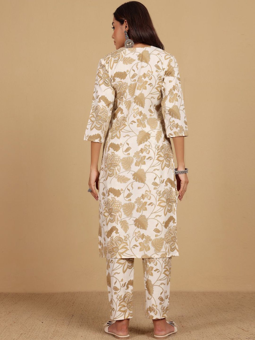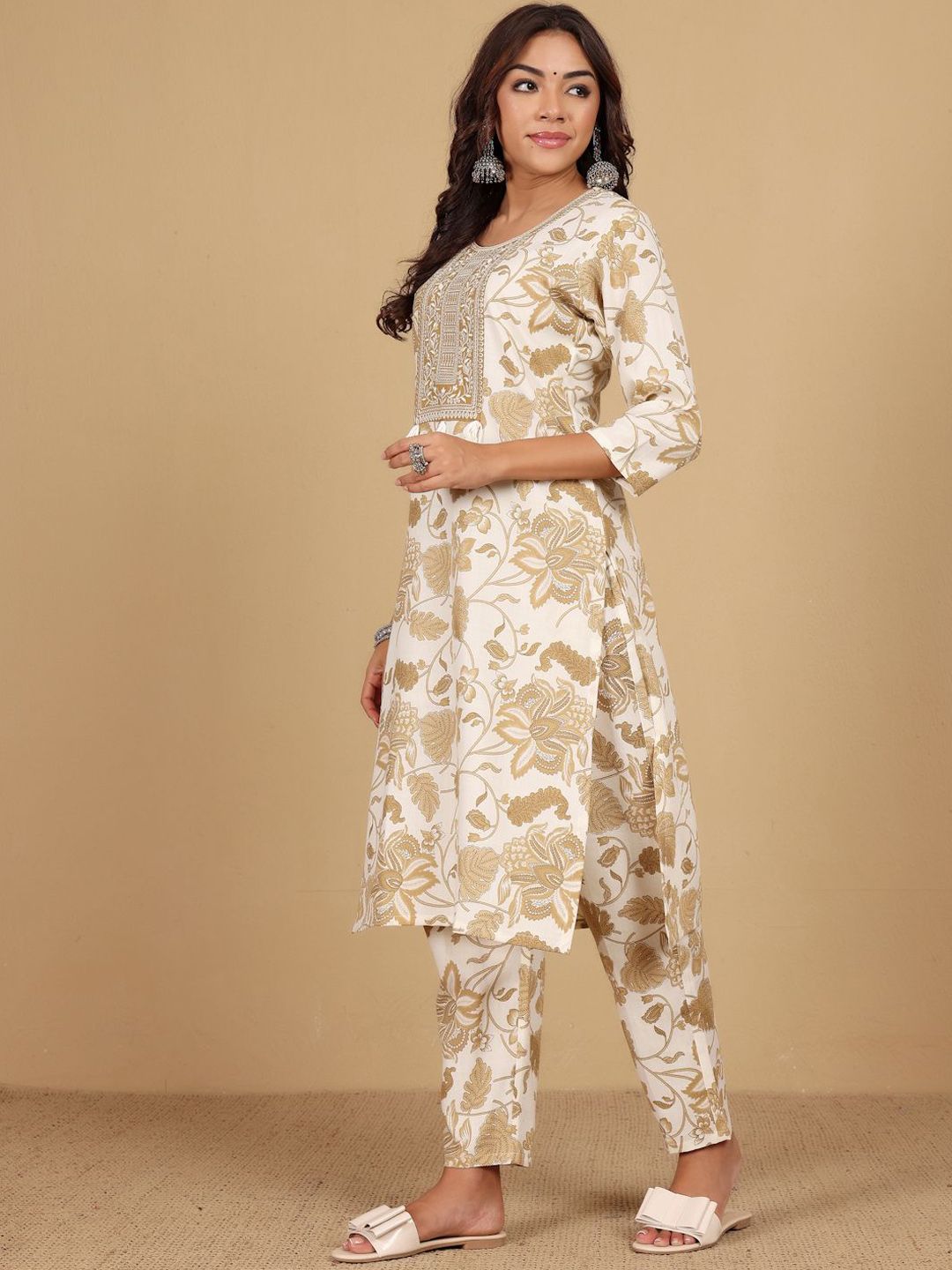 all about you Floral Printed Round Neck Thread Work Straight Kurta with Trouser