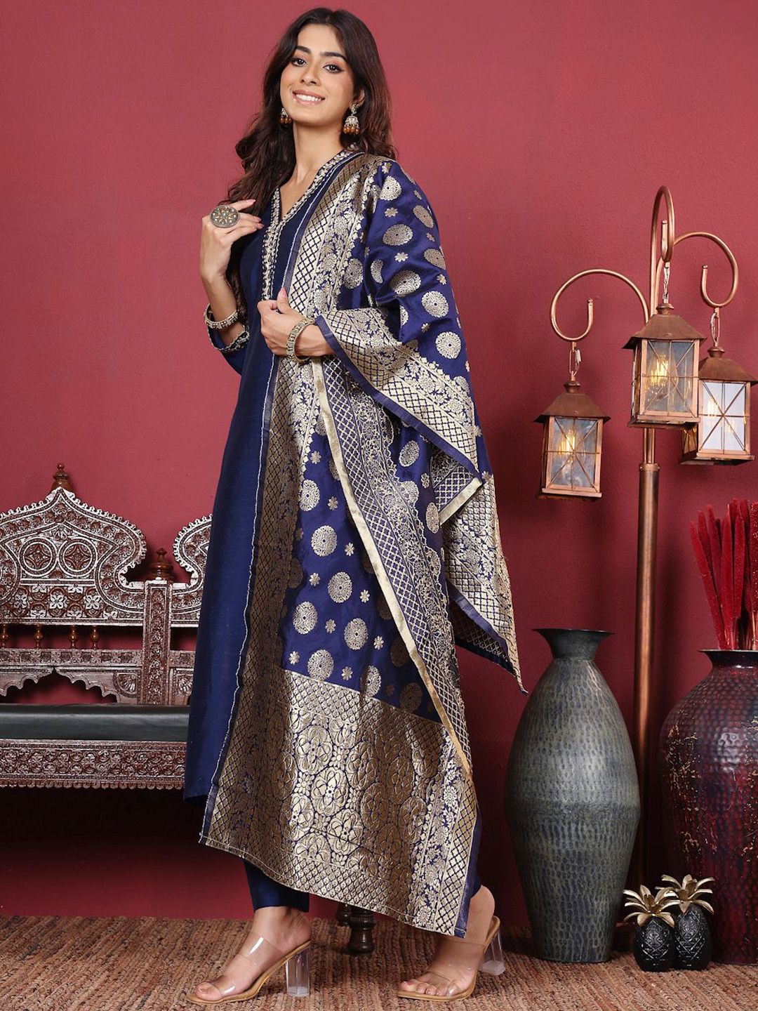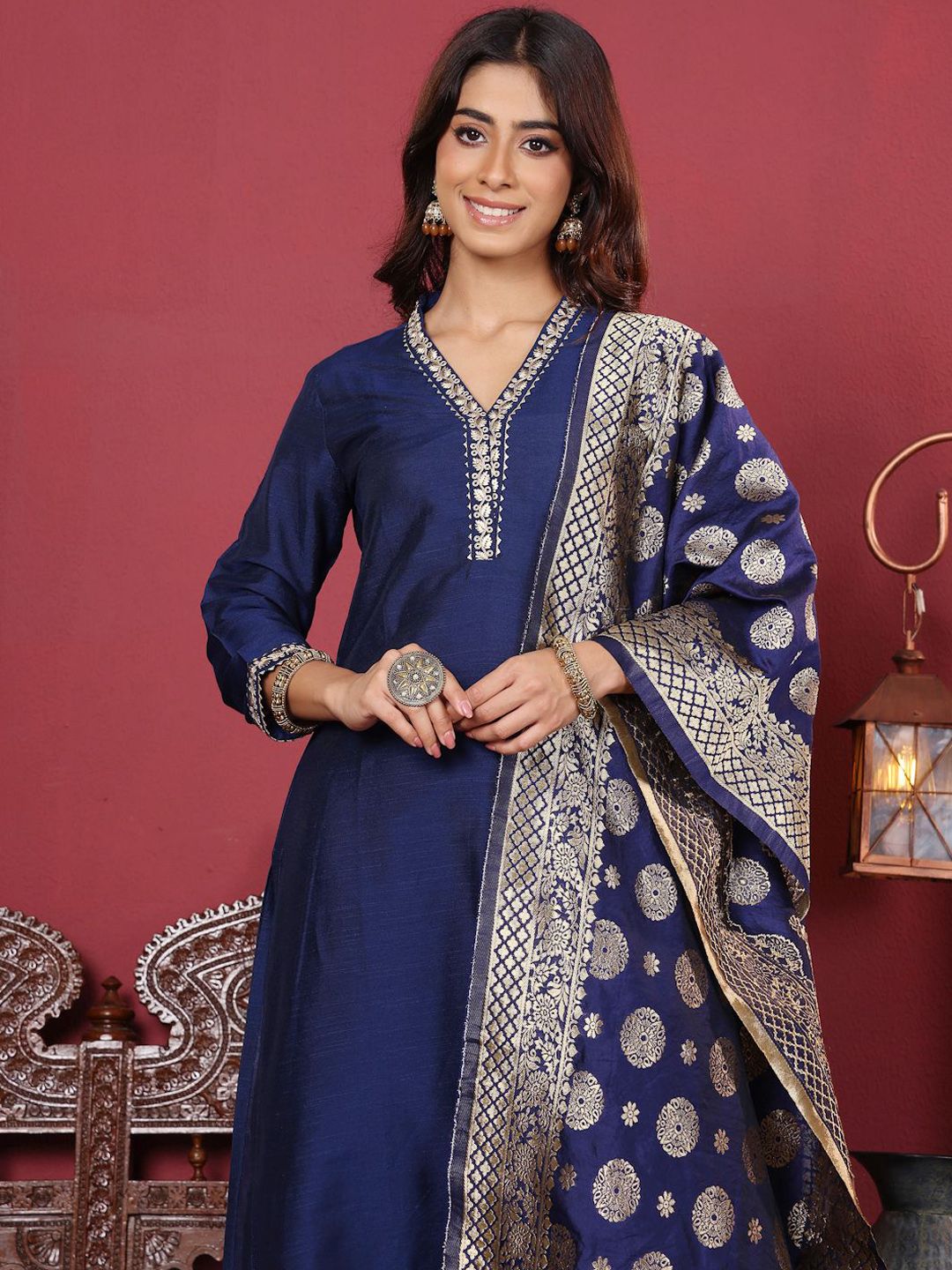 all about you Floral Yoke Design V-Neck A-Line Kurta With Trousers & Dupatta