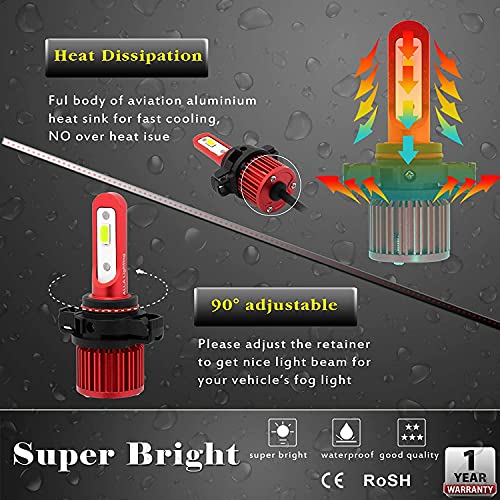 (Set of 2) LED Chips: Equipped with high quality 12pcs high power customized CSP SMD per 2504/PSX24W LED bulb.Each LED bulb is about 2600 lumens, total 5200 lumens for both PSX24W 2504 LED fog light bulbs. Plug-n-Play, Easy Installation. Waterproof: IP67. Non-polarity LED bulbs. Color: 3000K amber yellow; Powered by Advanced Bright LED Circuitry Technology; Working Voltage: 12V~18VDC. Working Power: 12W/bulb; Application: used for upgrading auto cars, trucks' fog lights bulbs or daytime running light ( DRL) lamps for much more brightness and safer driving at rainy, fogy, or snowy days. USA located guaranteed Warranty: One year manufacturer defect. Cross reference number: 12276, PSX24W, 2504, etc.