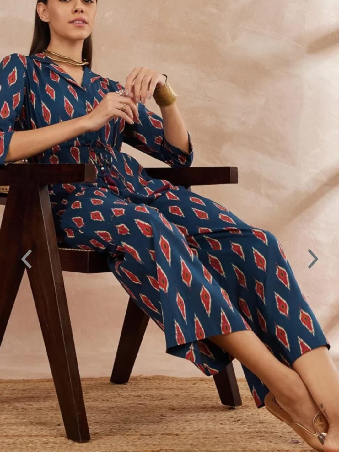The ANGIYA Women Blue Cotton Printed Long Sleeves Jumpsuit is designed to offer both style and comfort. With its premium quality material and timeless design, this product ensures durability and perfect fit. Perfect for various occasions, whether casual or semi-formal, it brings out a unique flair that adds charm to your wardrobe. Don't miss out on this versatile and must-have item!