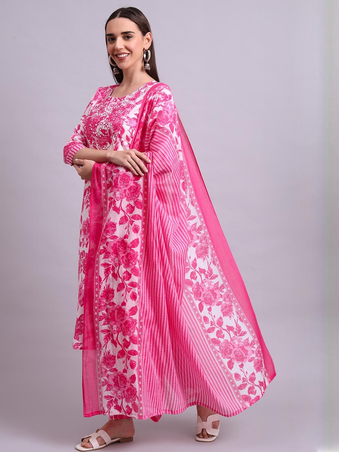 Angkor Women Pink Floral Printed Pure Cotton Kurta with Trousers & With Dupatta