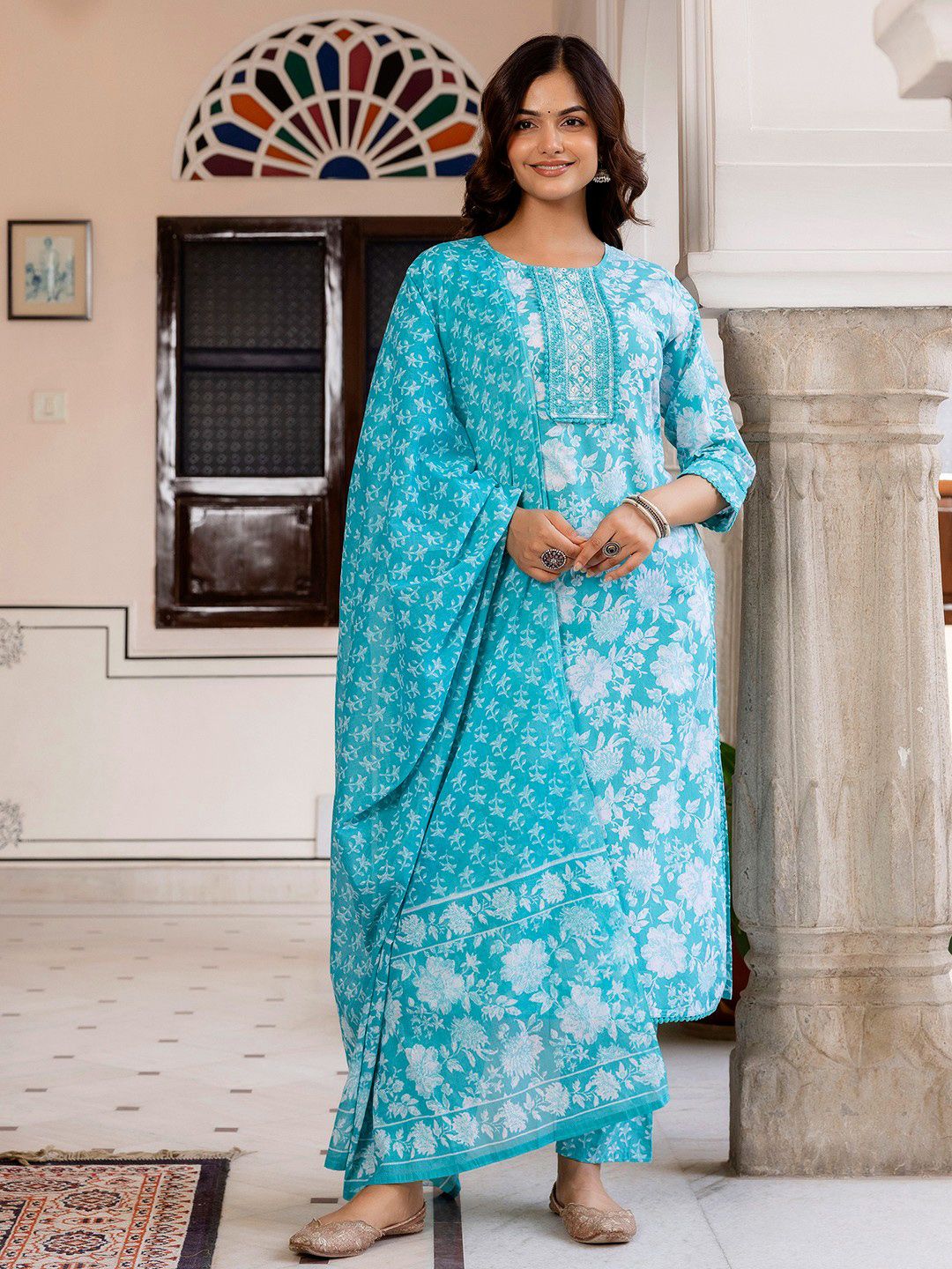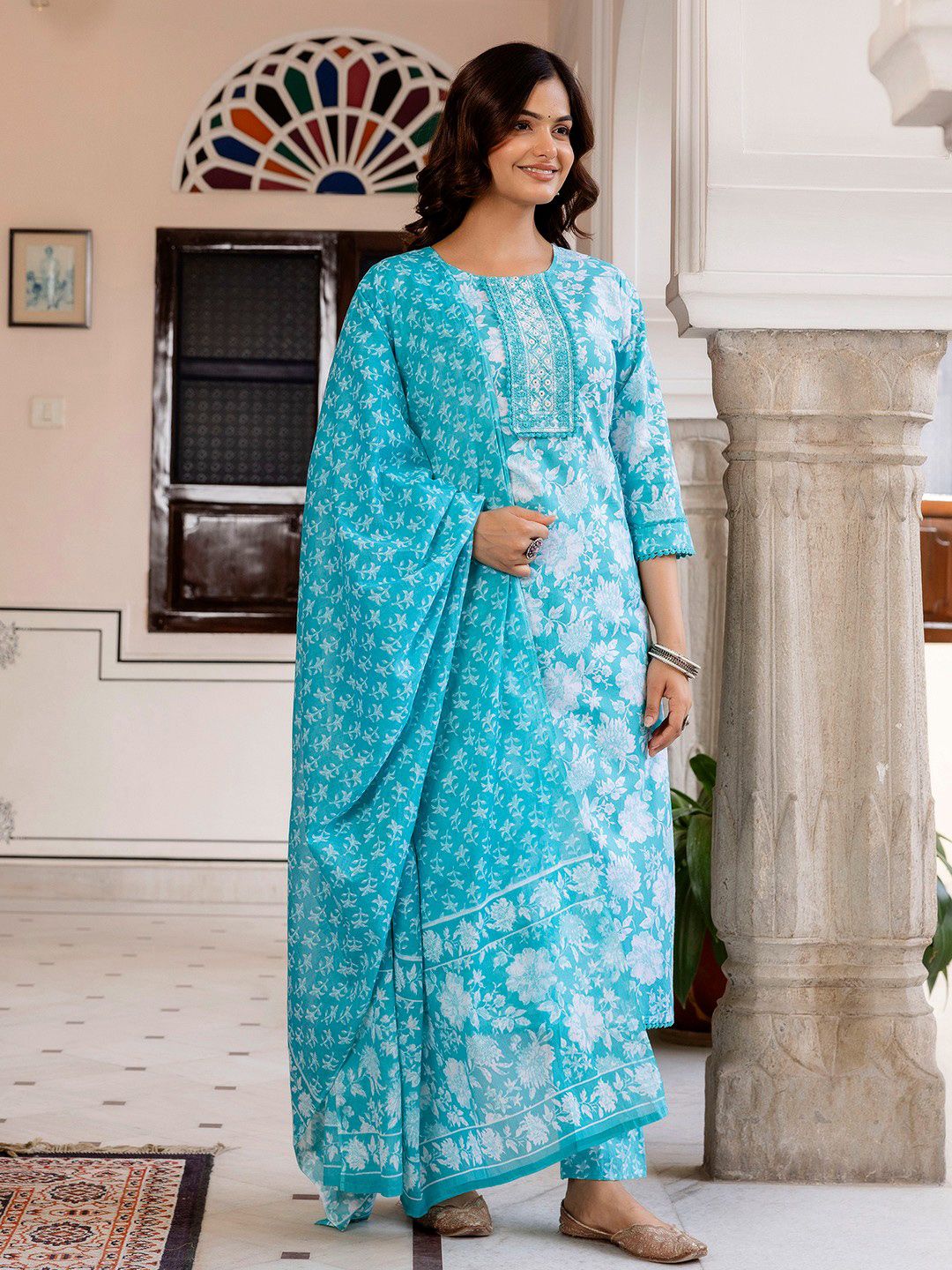 Anouk Ethnic Motifs Embroidered Thread Work Pure Cotton Kurta with Palazzos & Dupatta