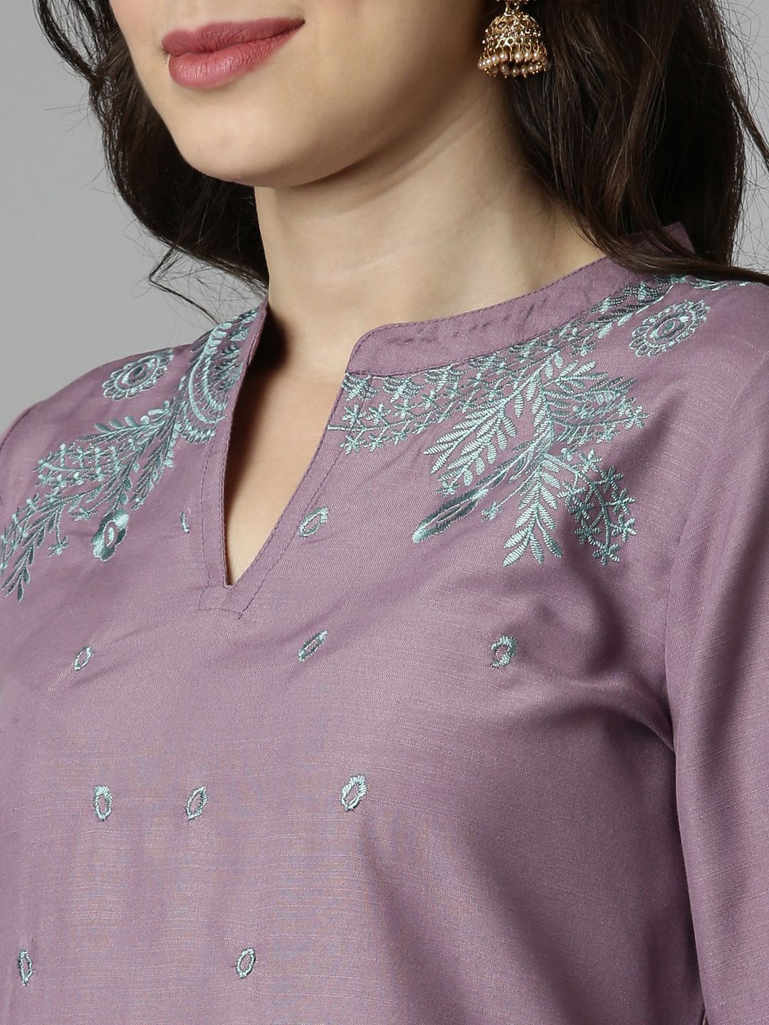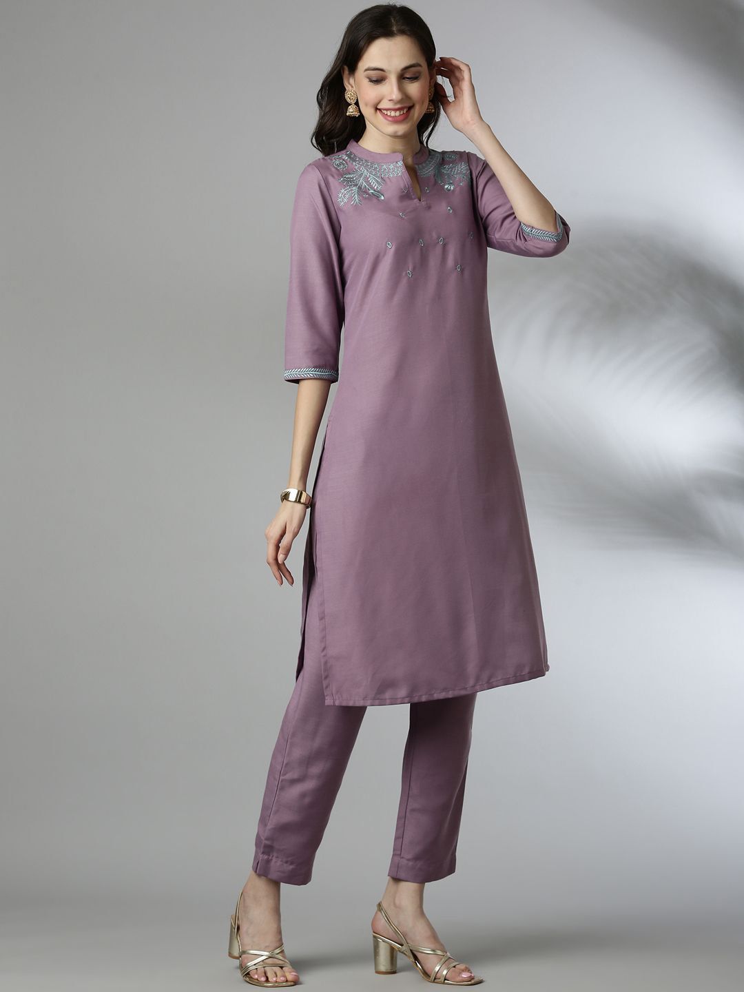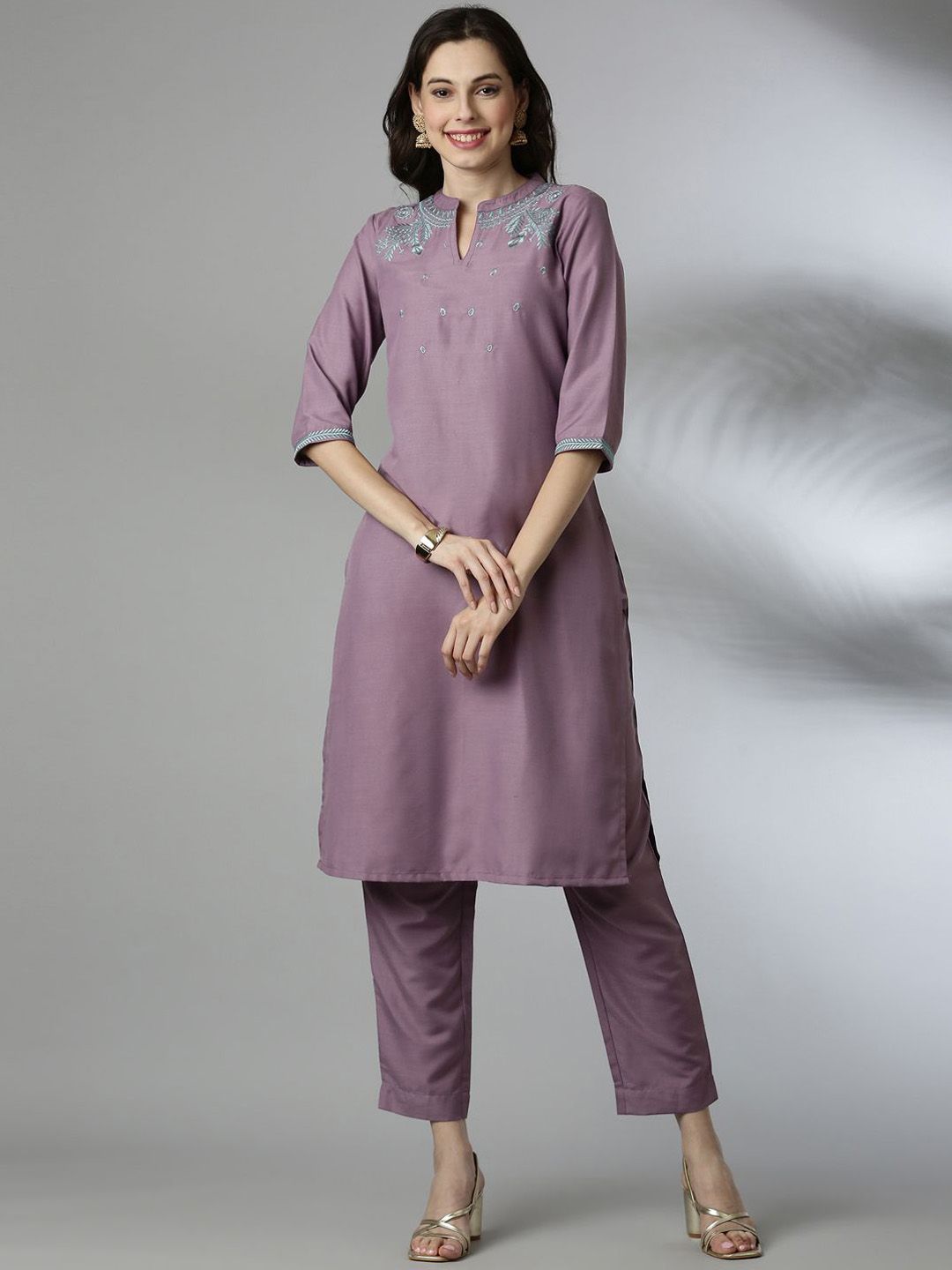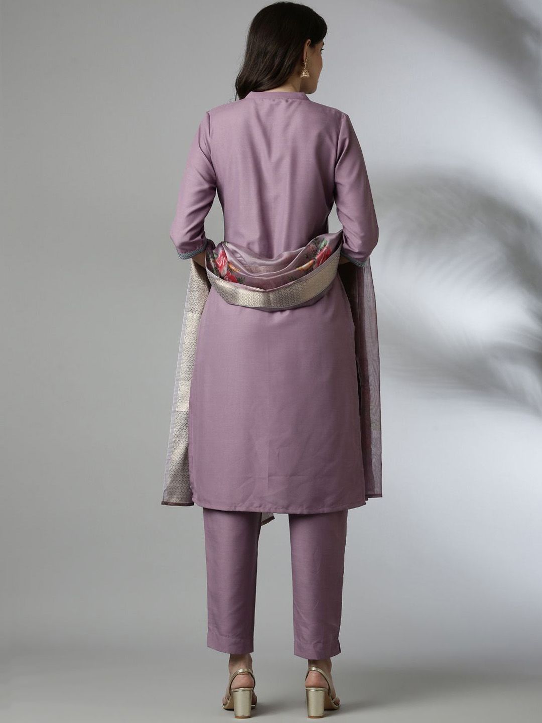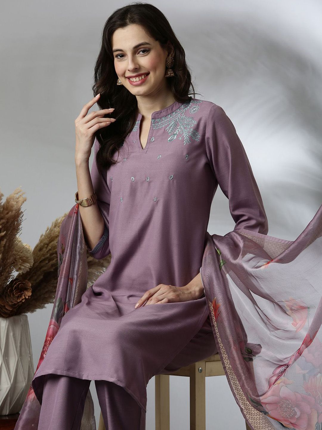 Anouk Floral Embroidered Mandarin Collar Straight Kurta with Trousers & Dupatta