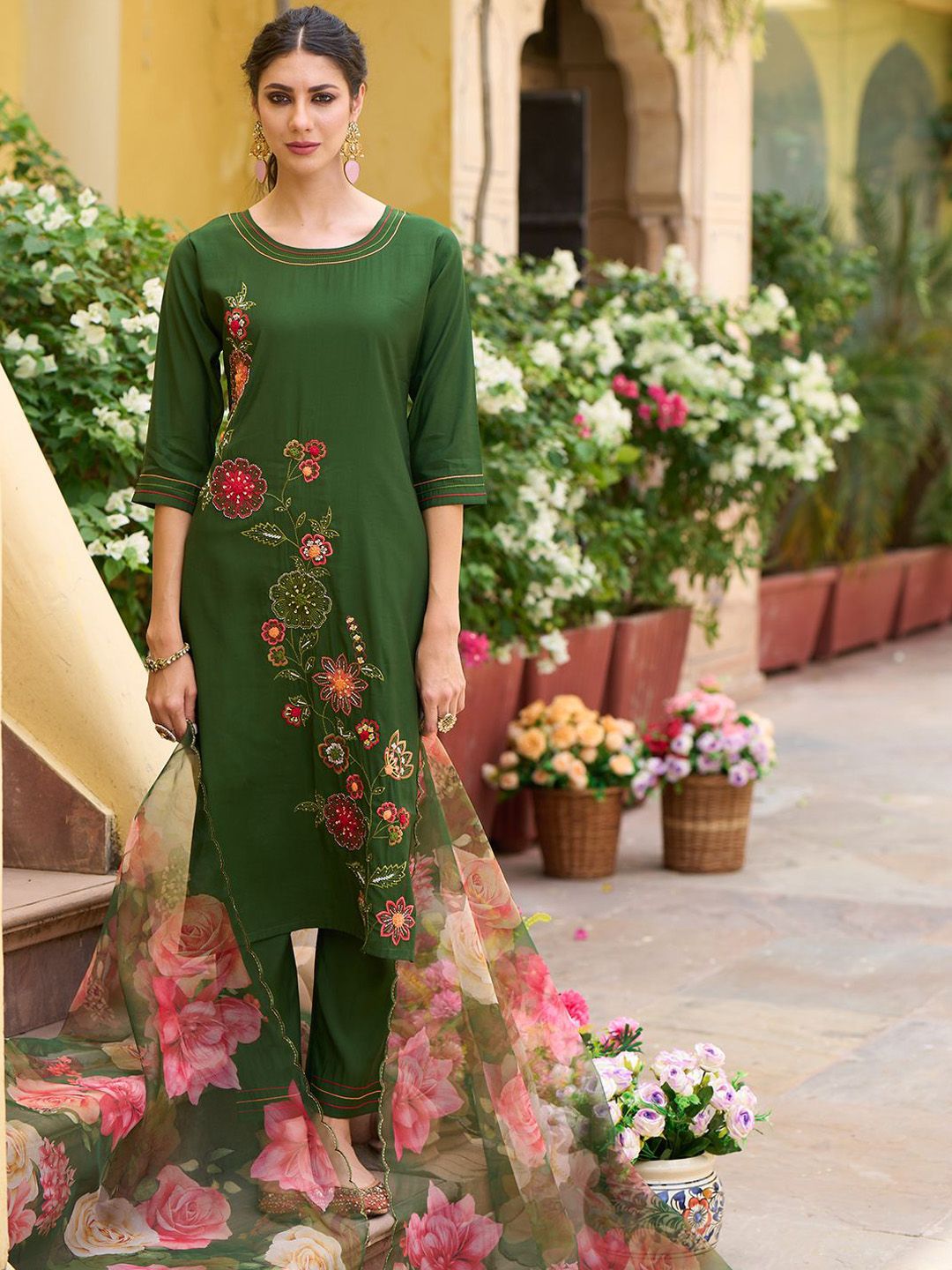 Anouk Floral Embroidered Straight Thread Work Kurta With Trouser & Dupatta