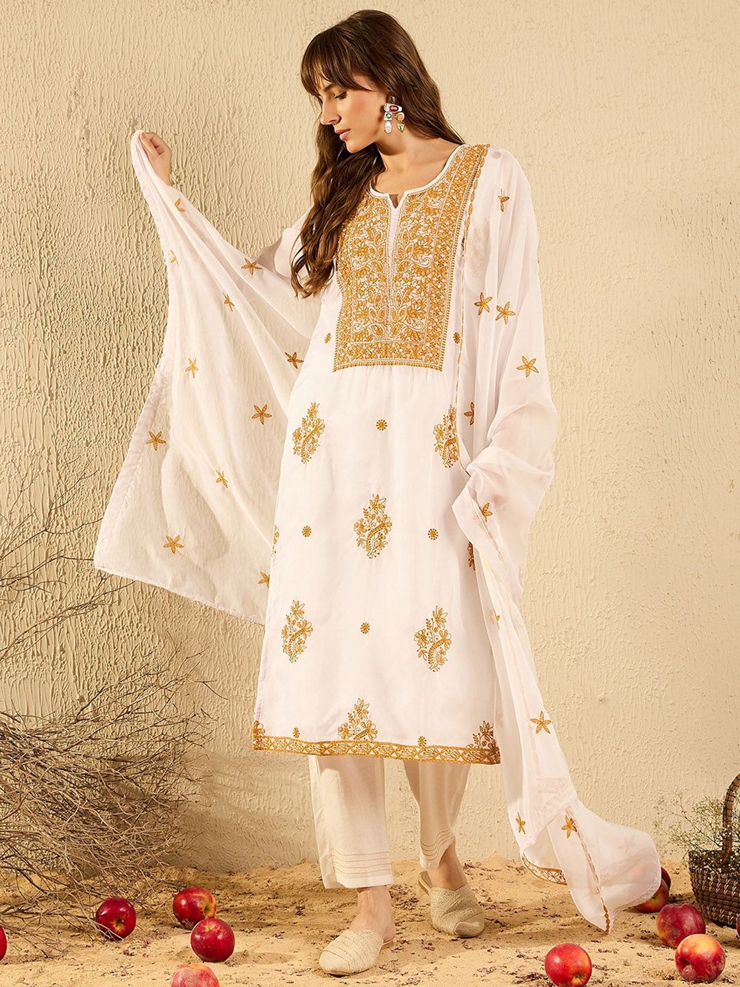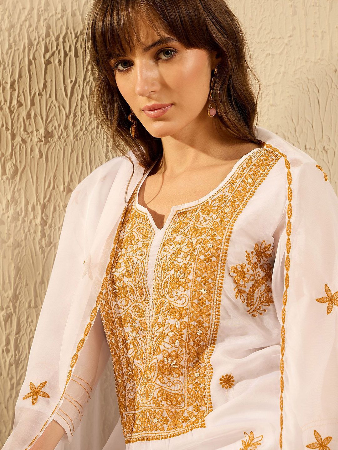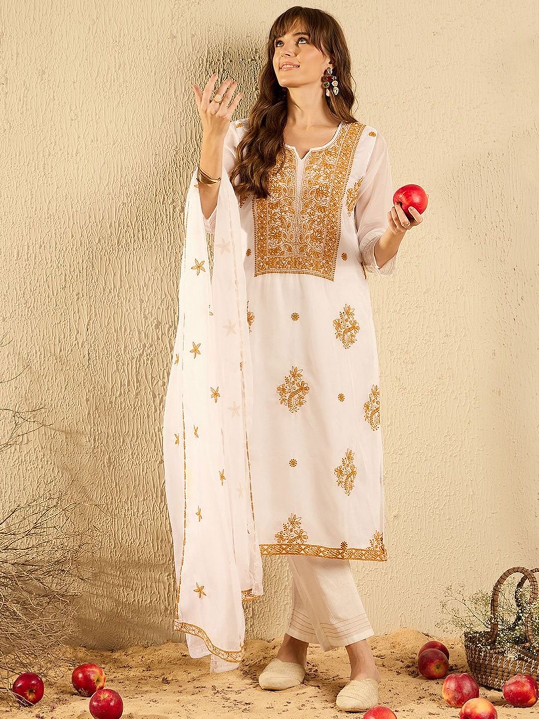 Anouk Floral Embroidered Straight Thread Work Organza Kurta With Trouser & Dupatta