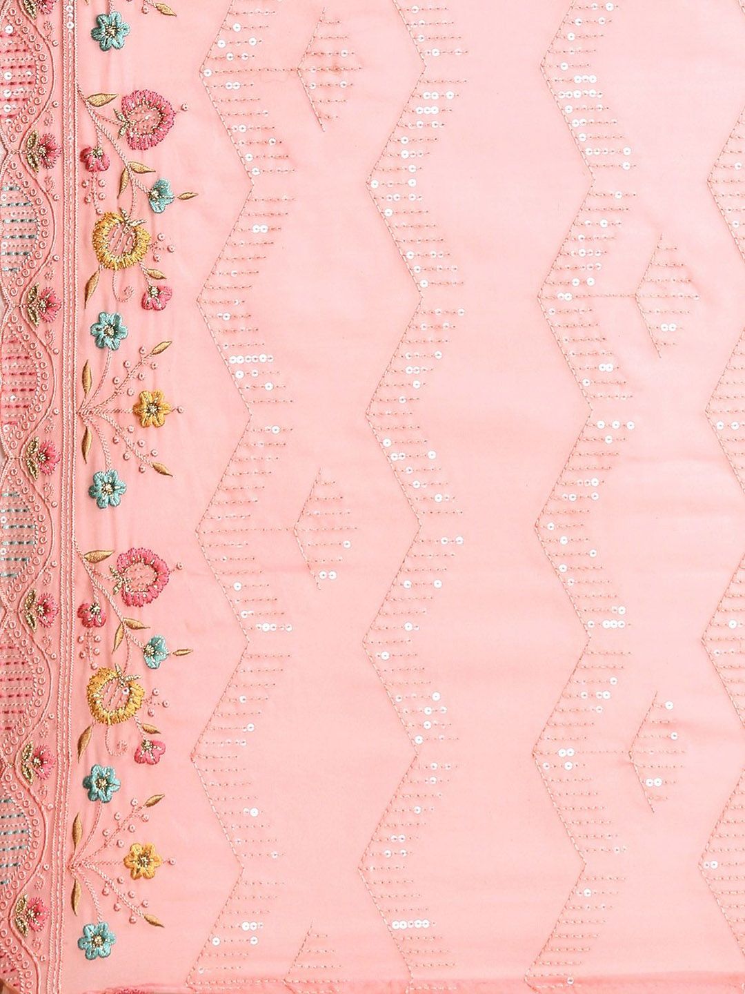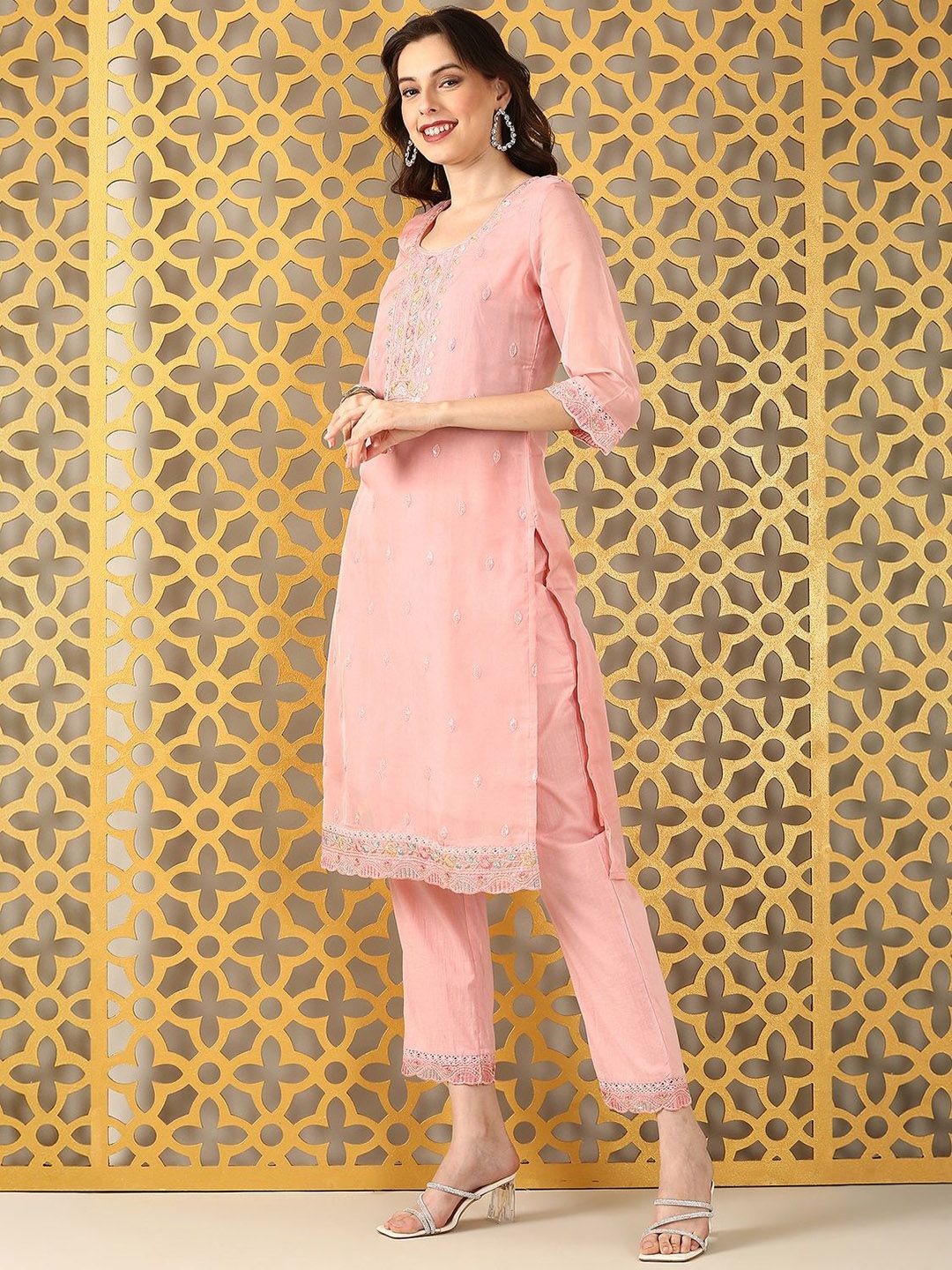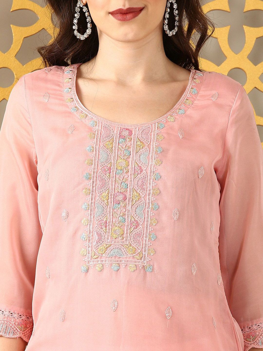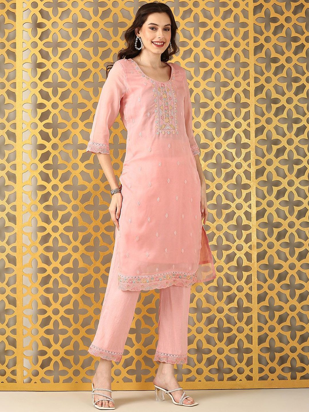 Anouk Floral Embroidered Thread Work Organza Straight Kurta With Trousers & Dupatta