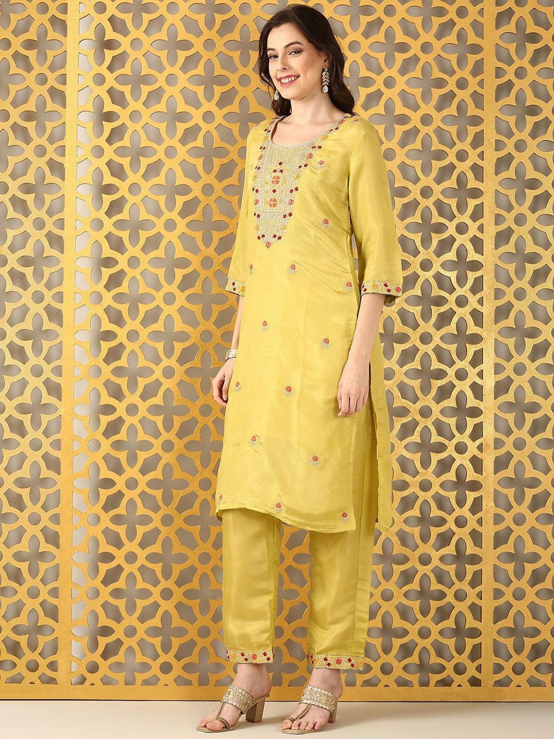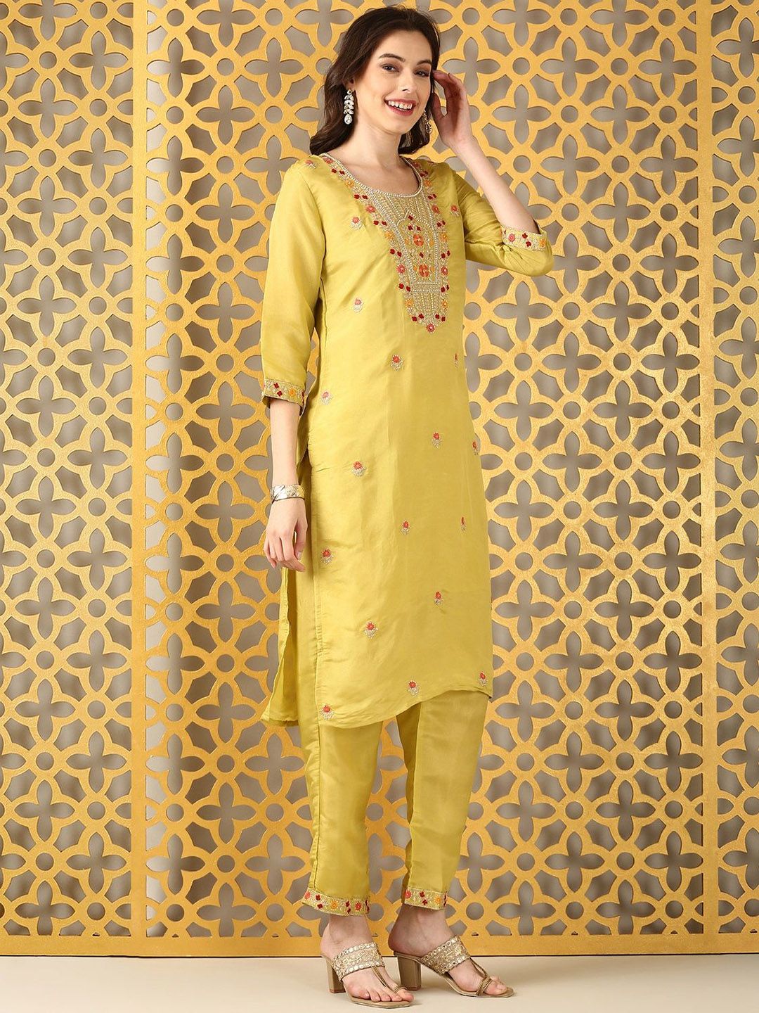Anouk Floral Embroidered Thread Work Straight Kurta With Trousers & Dupatta
