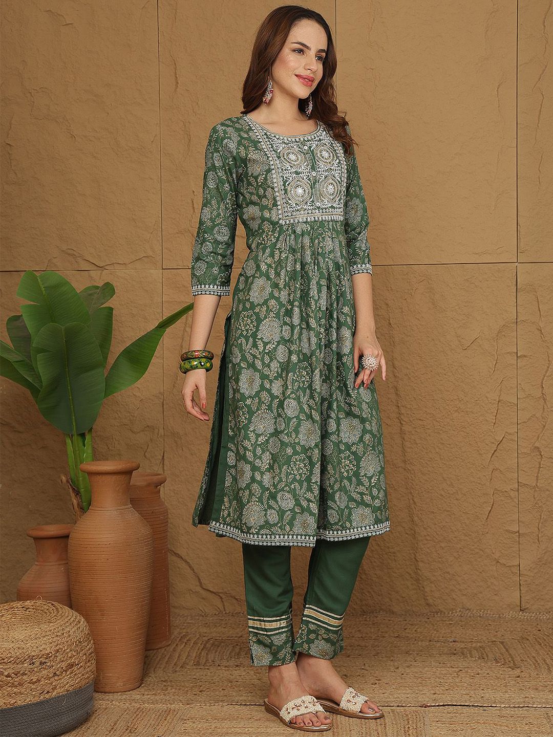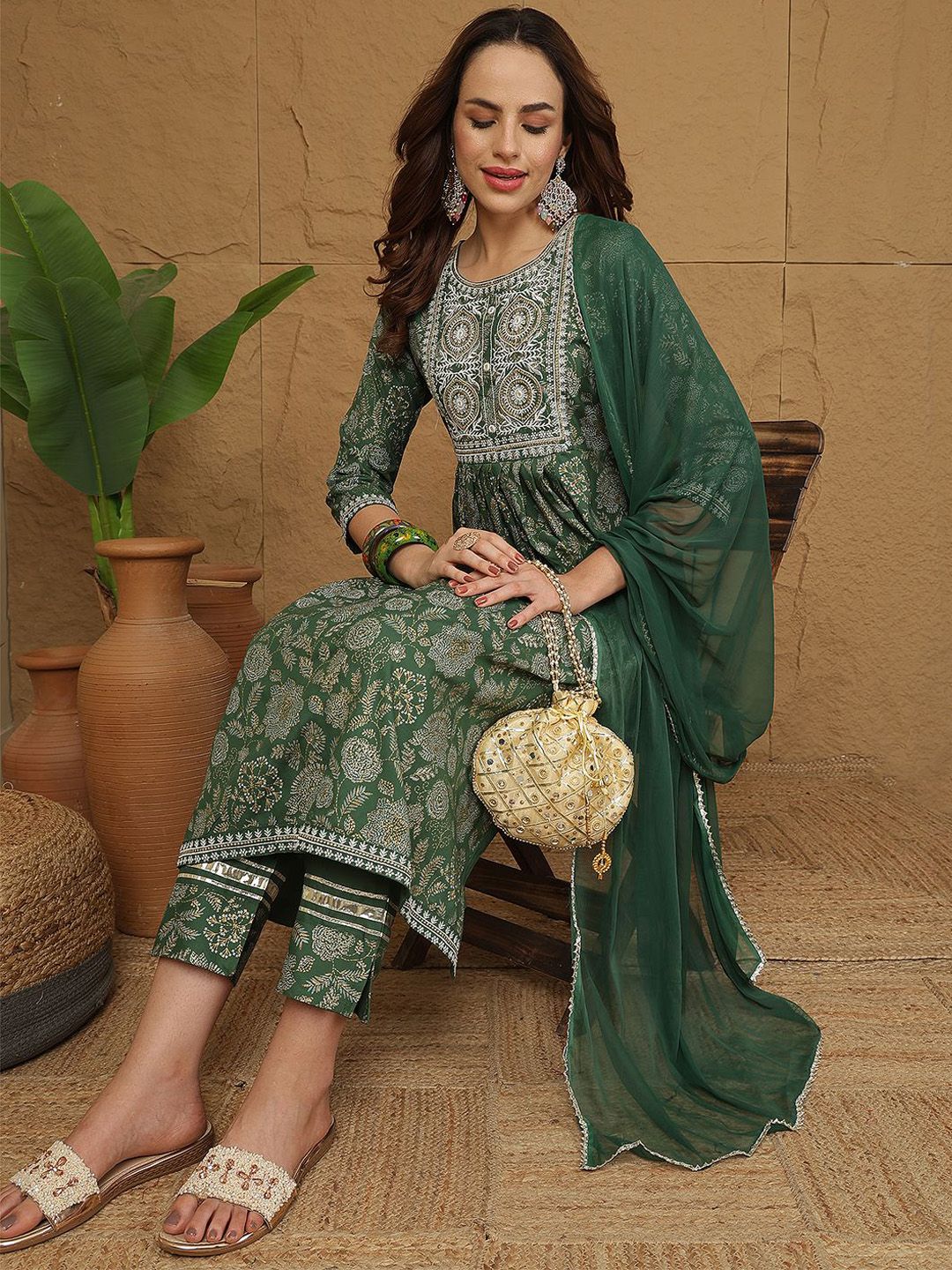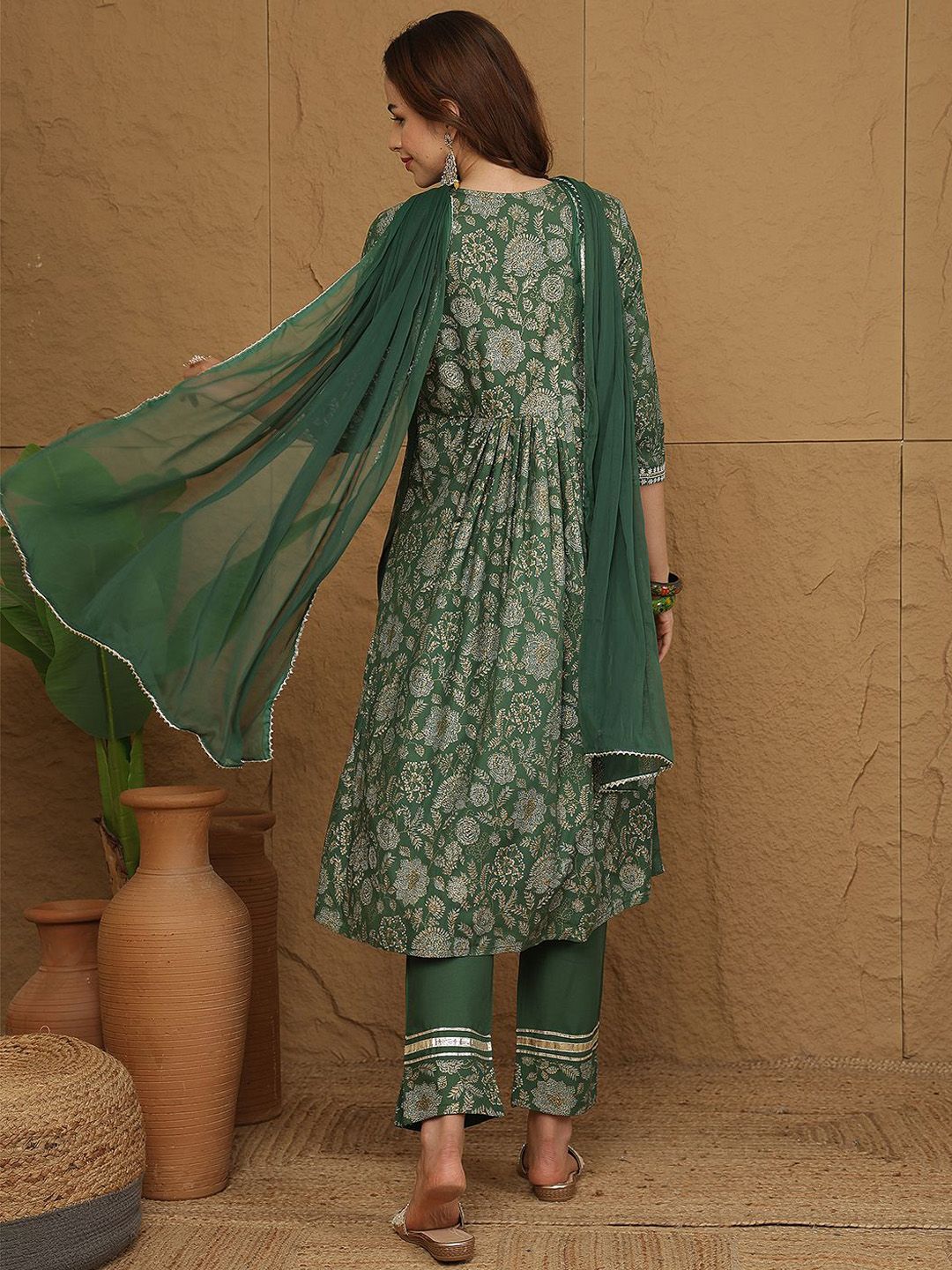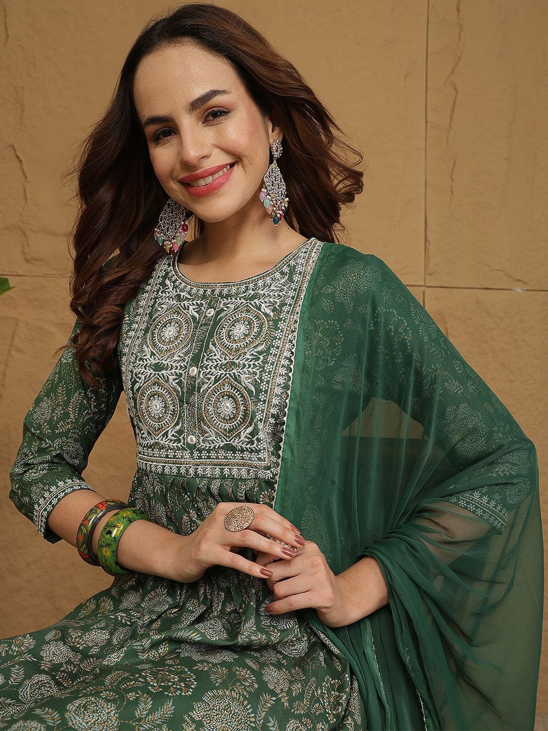 Anouk Floral Printed Mirror Work A-Line Kurta With Trousers & Dupatta