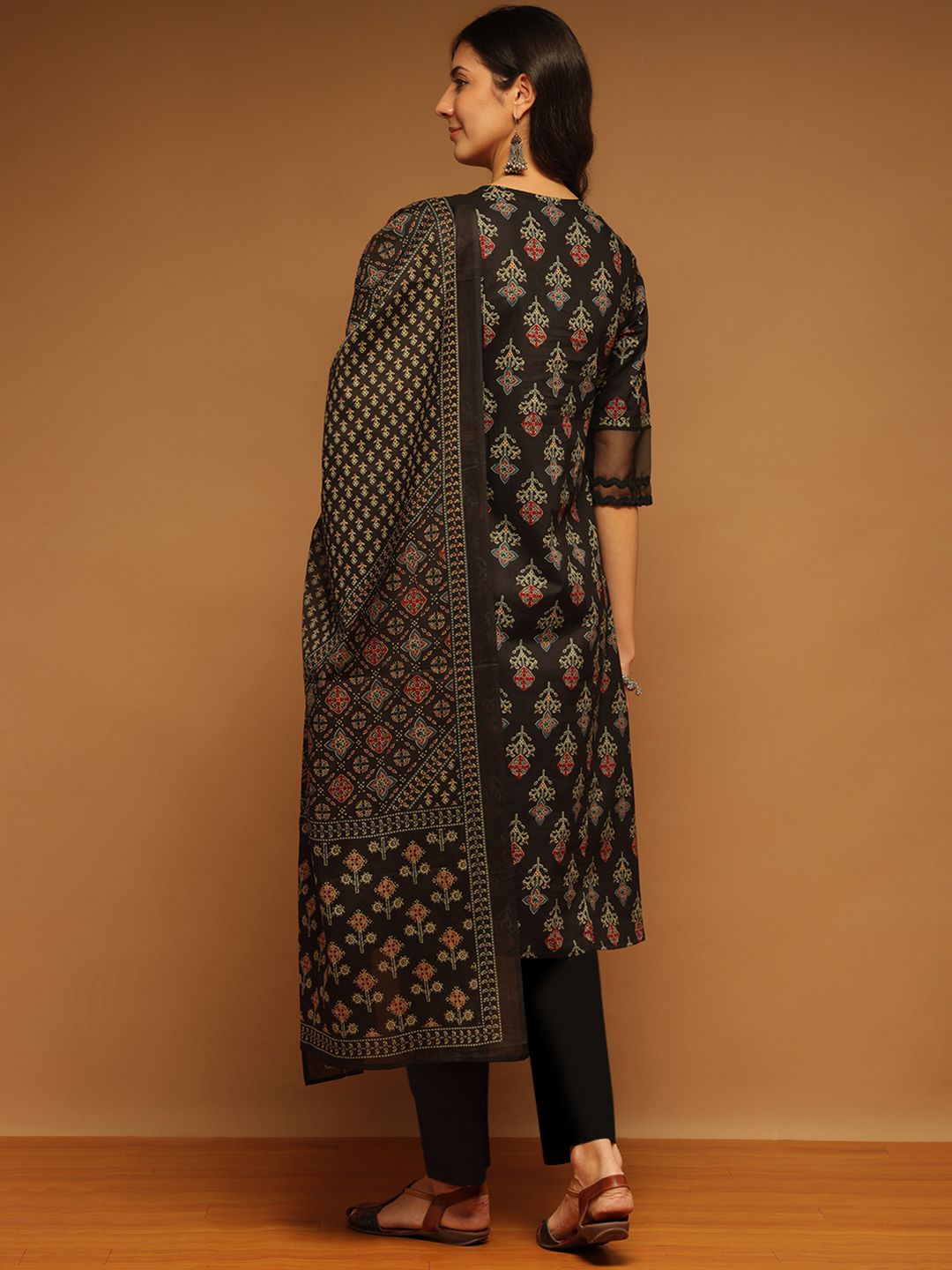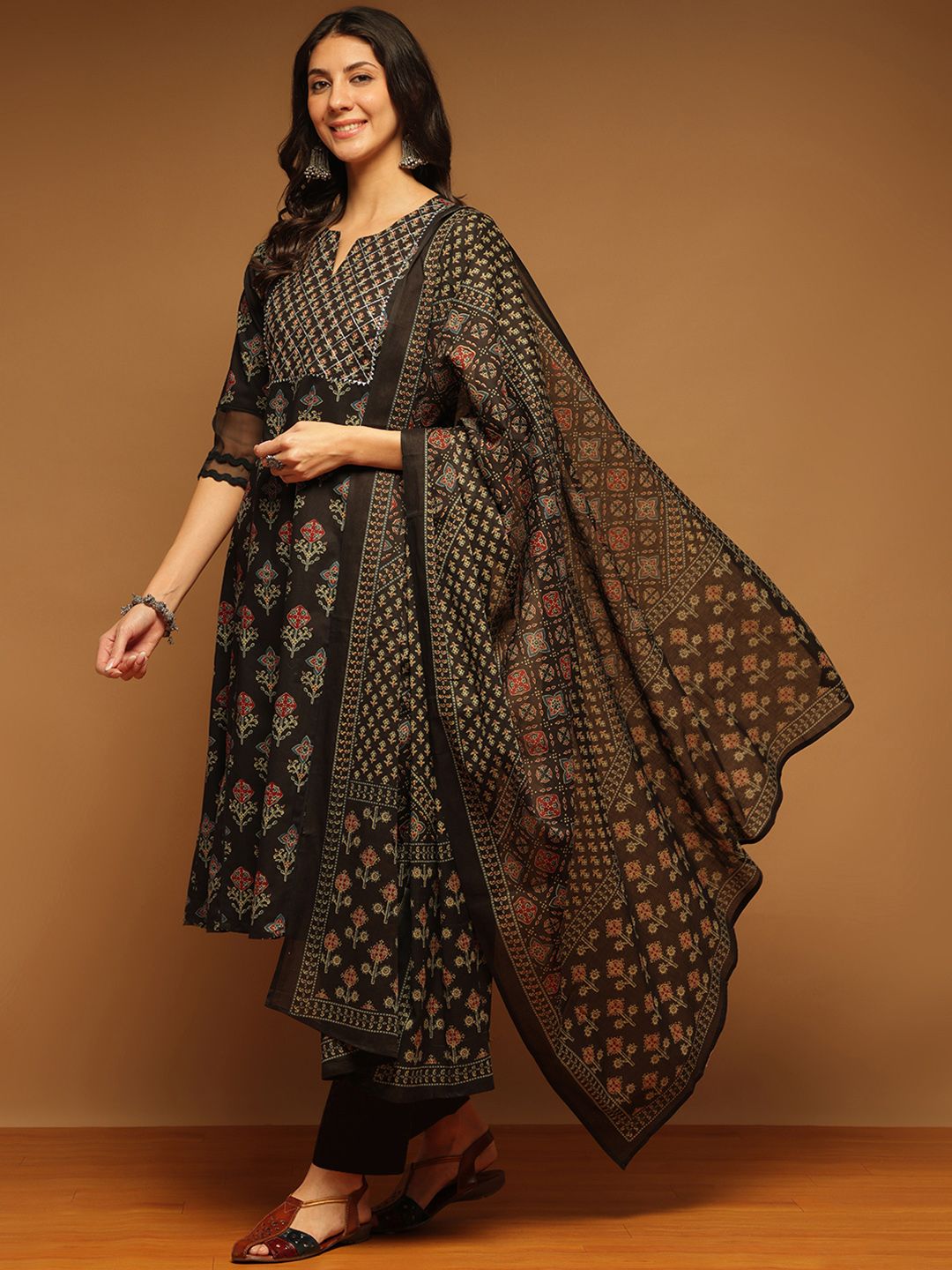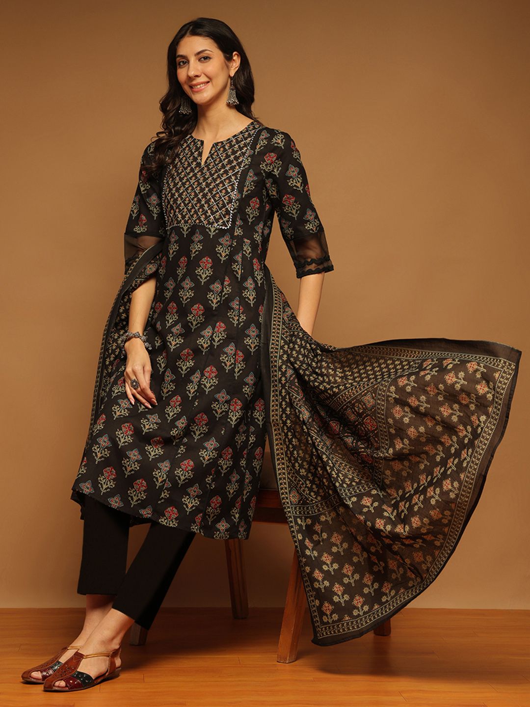 Anouk Floral Printed Notch Neck Pure Cotton A-Line Kurta With Trousers & Dupatta