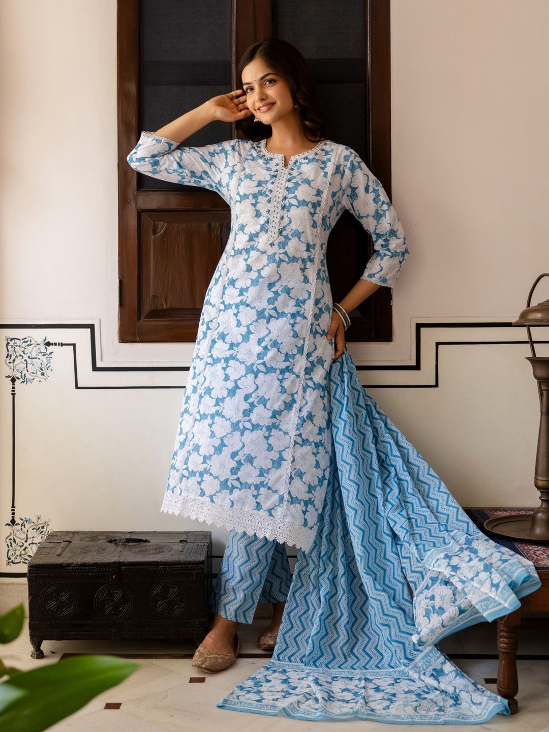 Anouk Floral Printed Notch Neck Regular Pure Cotton Kurta With Trousers & With Dupatta