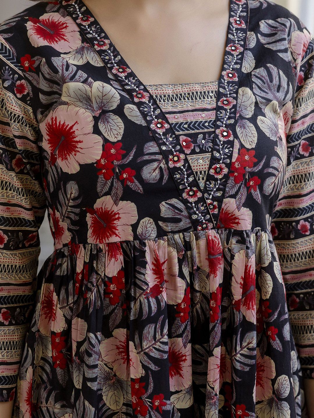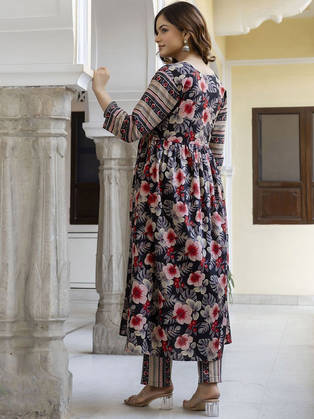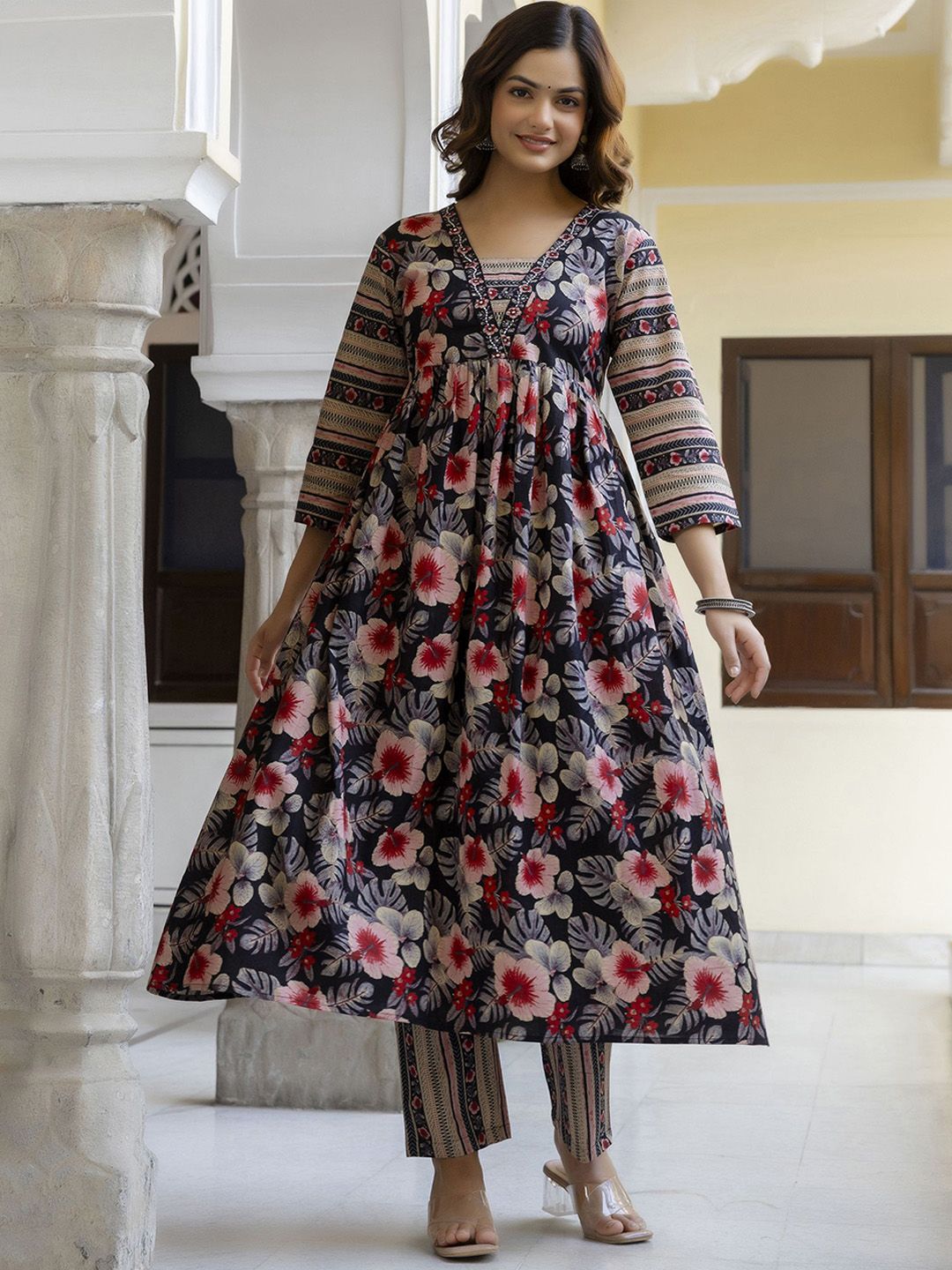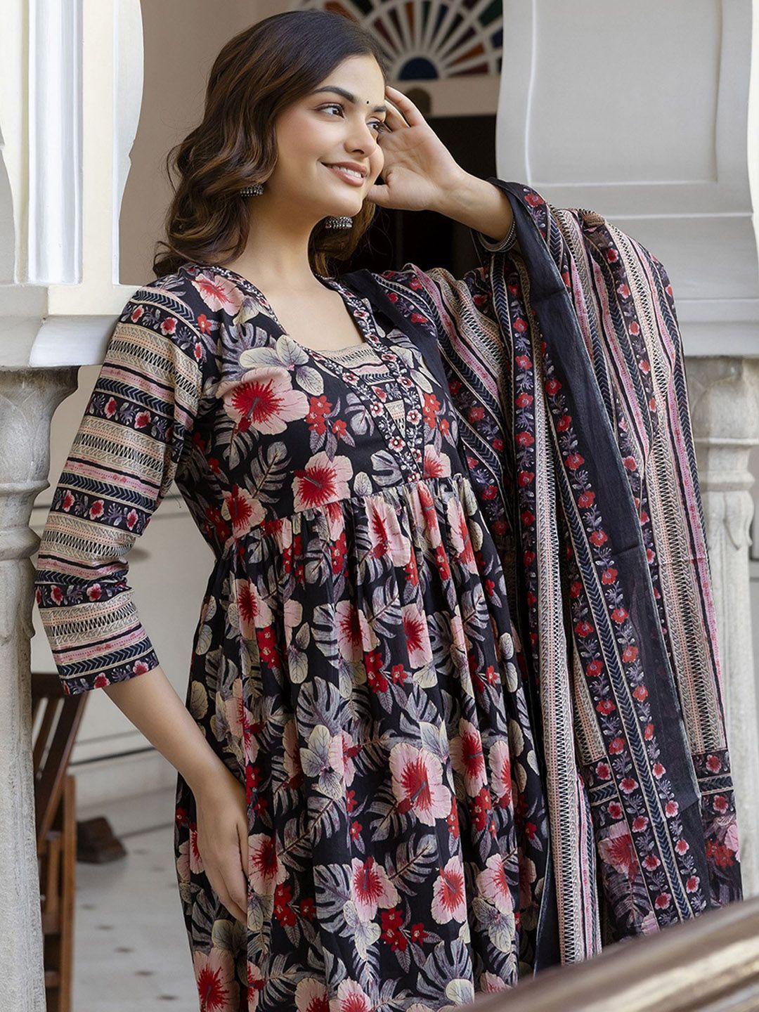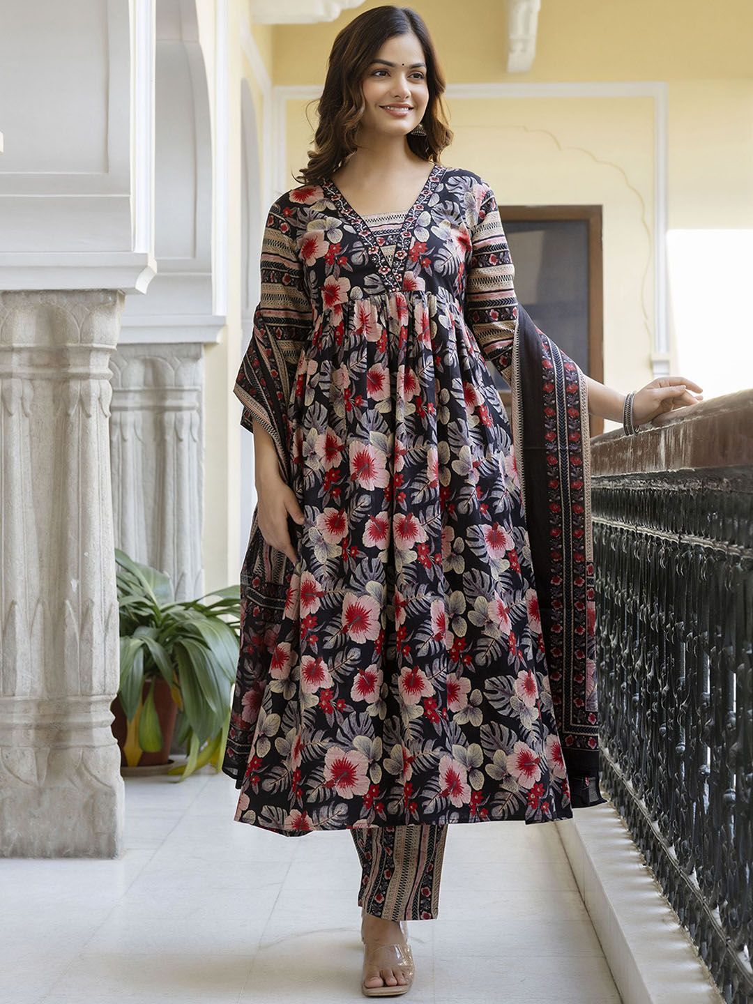 Anouk Floral Printed Pure Cotton Anarkali Kurta With Trousers & Dupatta
