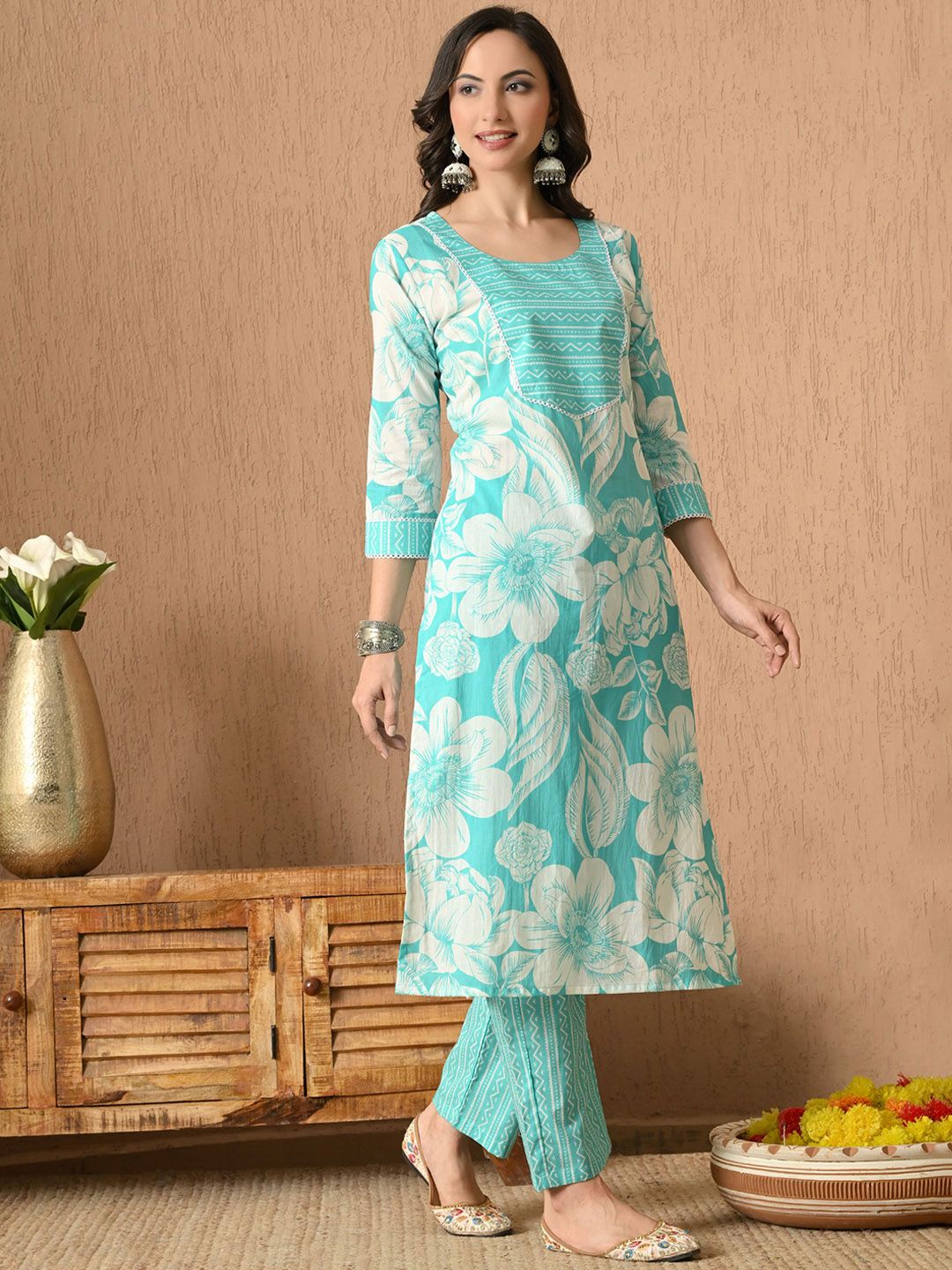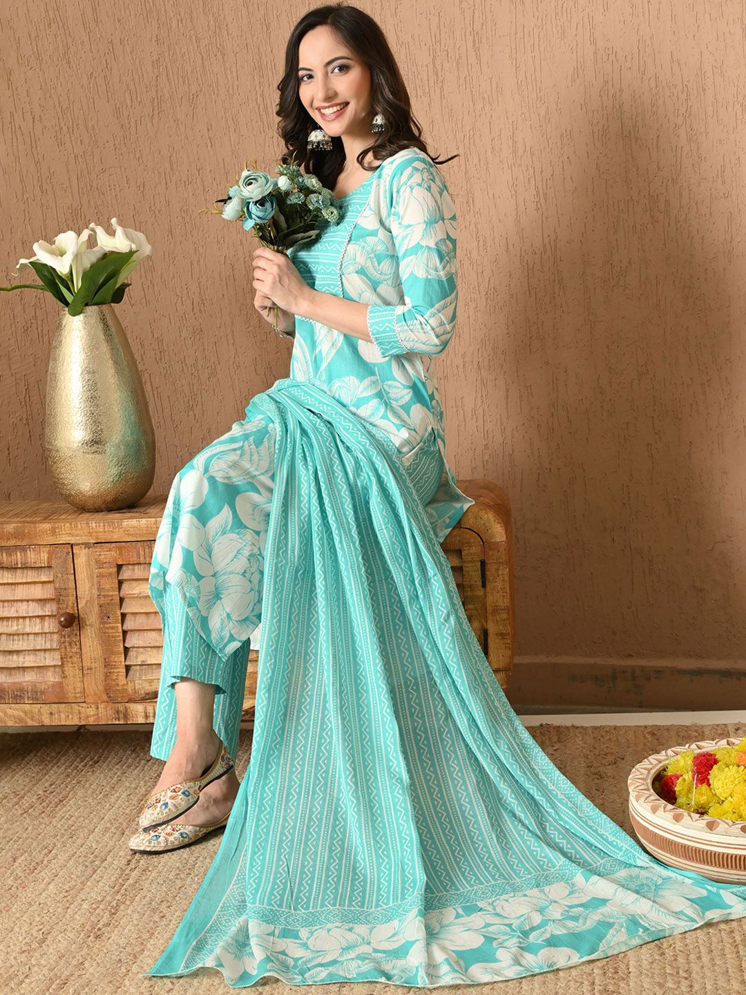 Anouk Floral Printed Round Neck Pure Cotton Straight Kurta with Trousers & Dupatta