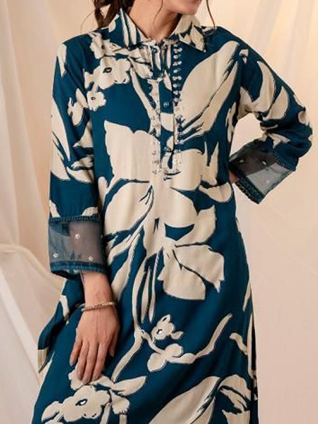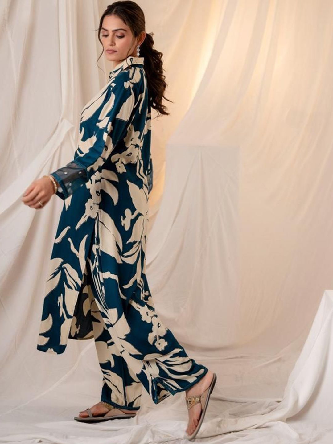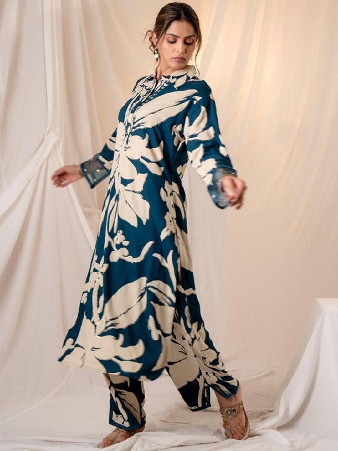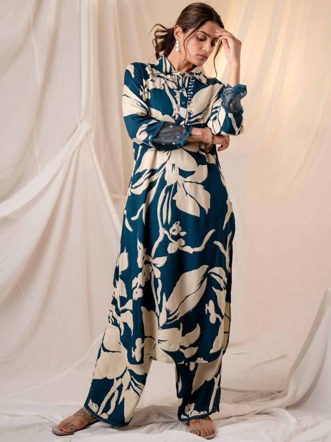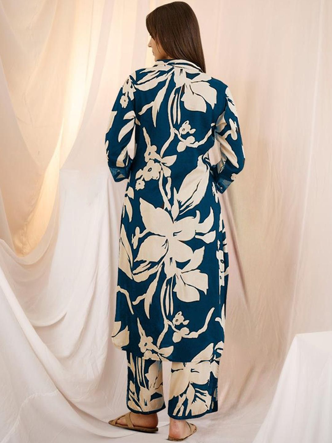 Anouk Floral Printed Shirt Collar Straight Kurta With Trousers