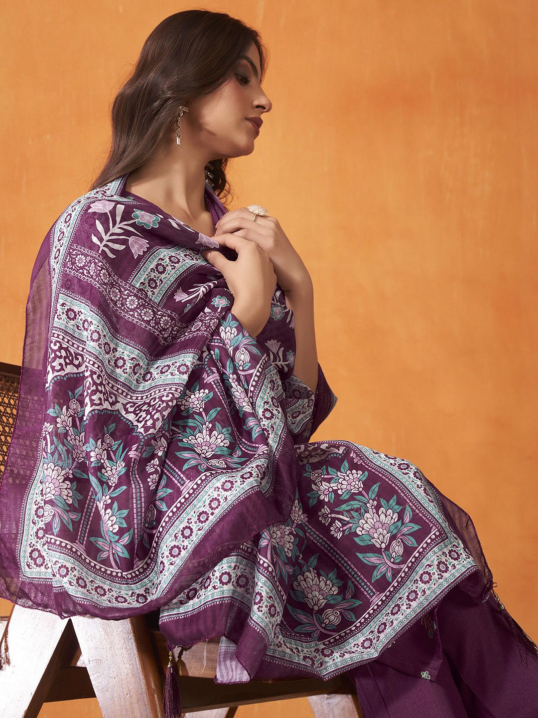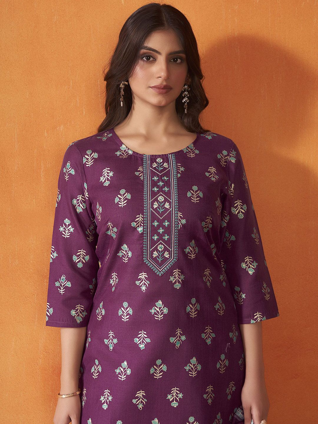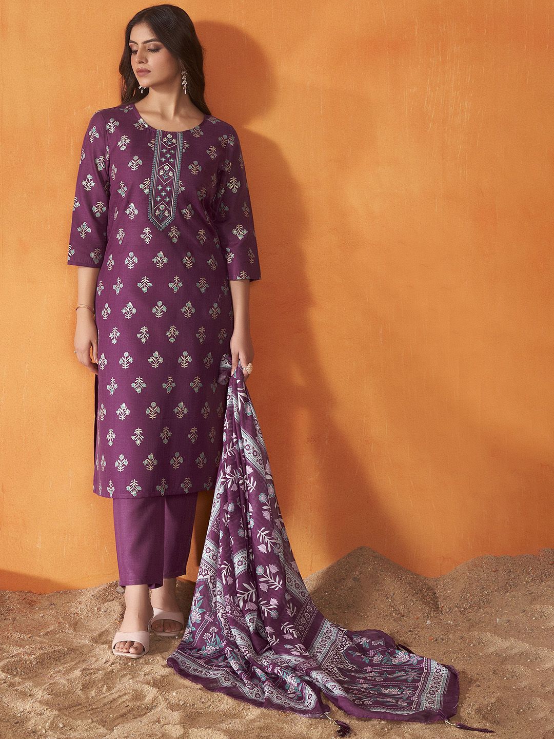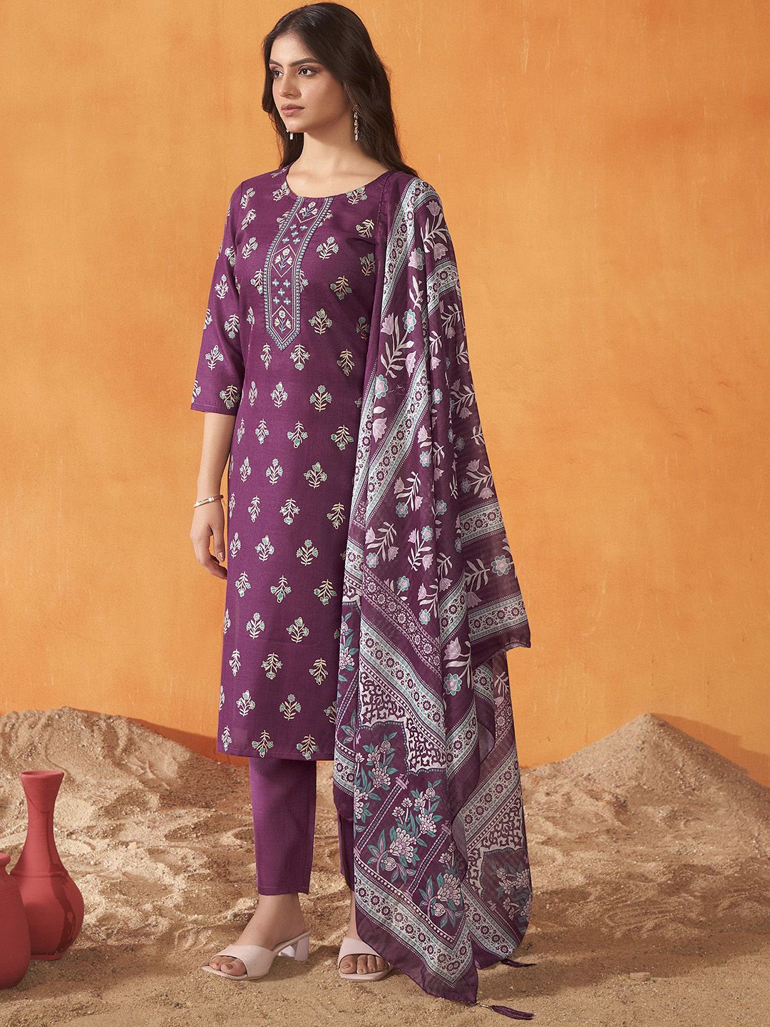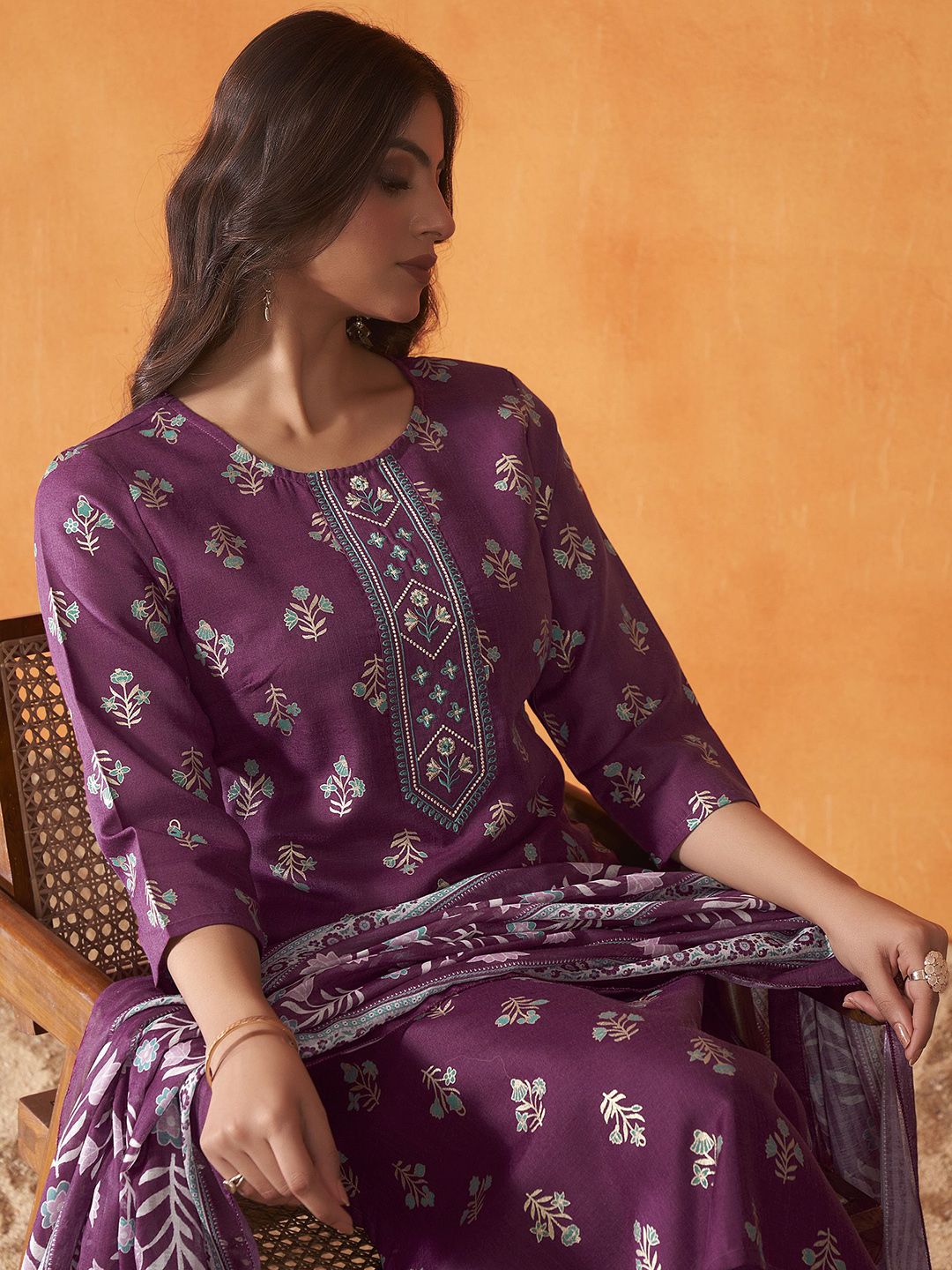 Anouk Floral Printed Straight Thread Work Kurta With Trouser & Dupatta