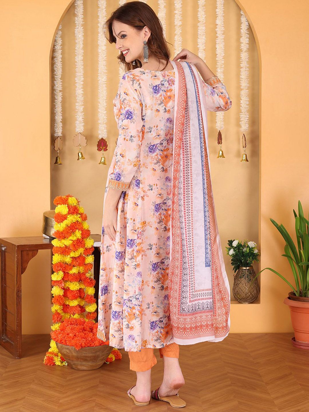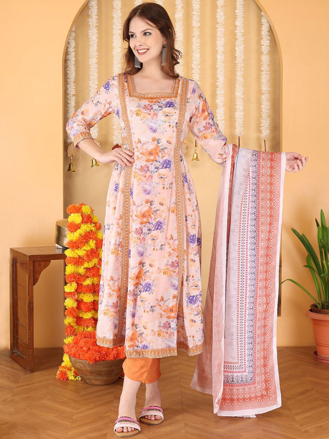 Anouk Floral Printed Thread Work A-Line Straight Kurta With Trousers & Dupatta