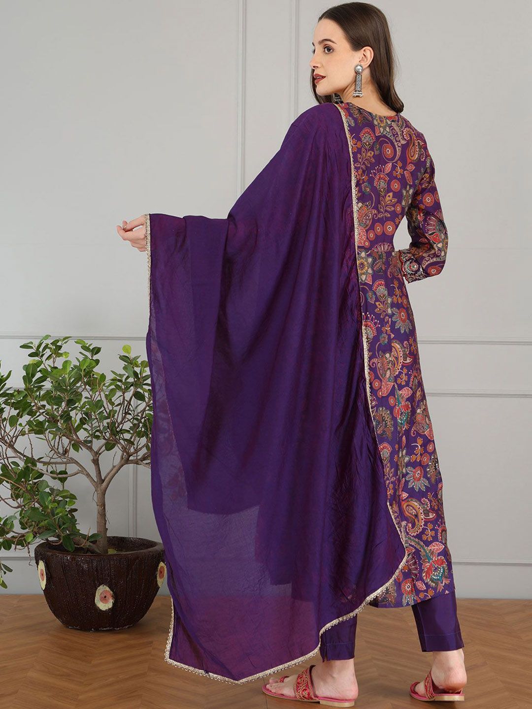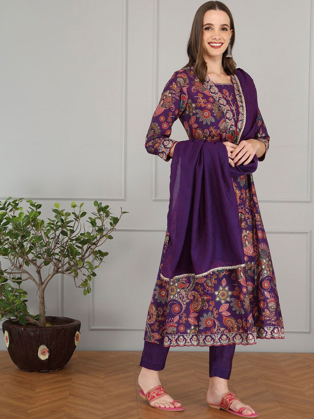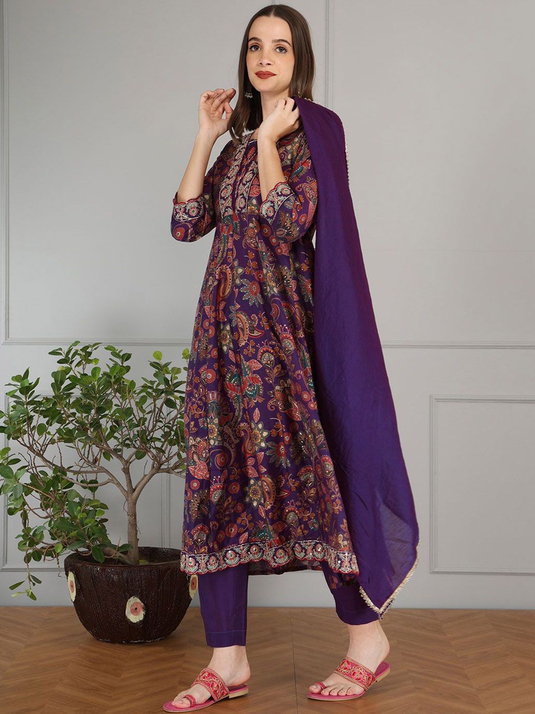 Anouk Floral Printed Thread Work Chanderi Silk A-Line Kurta With Trousers & Dupatta