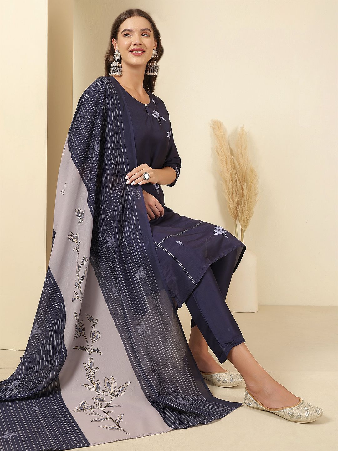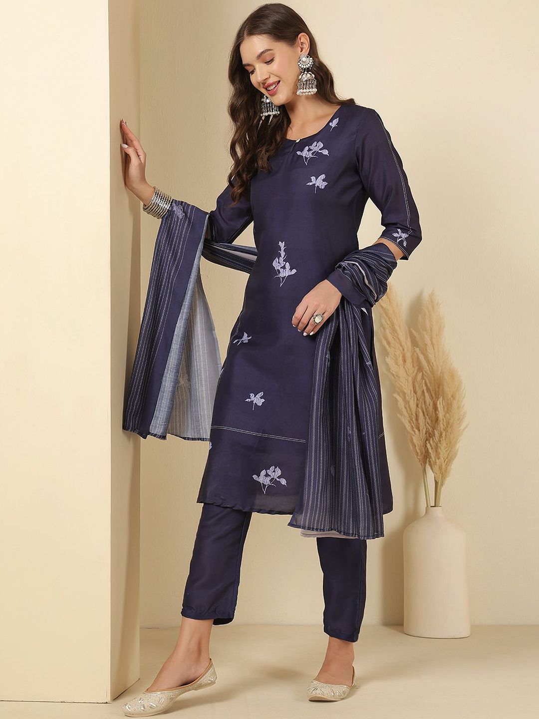Anouk Floral Printed Thread Work Straight Kurta With Trousers And Dupatta