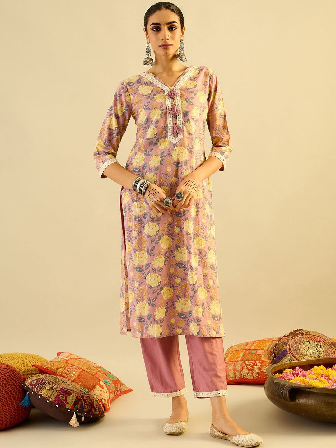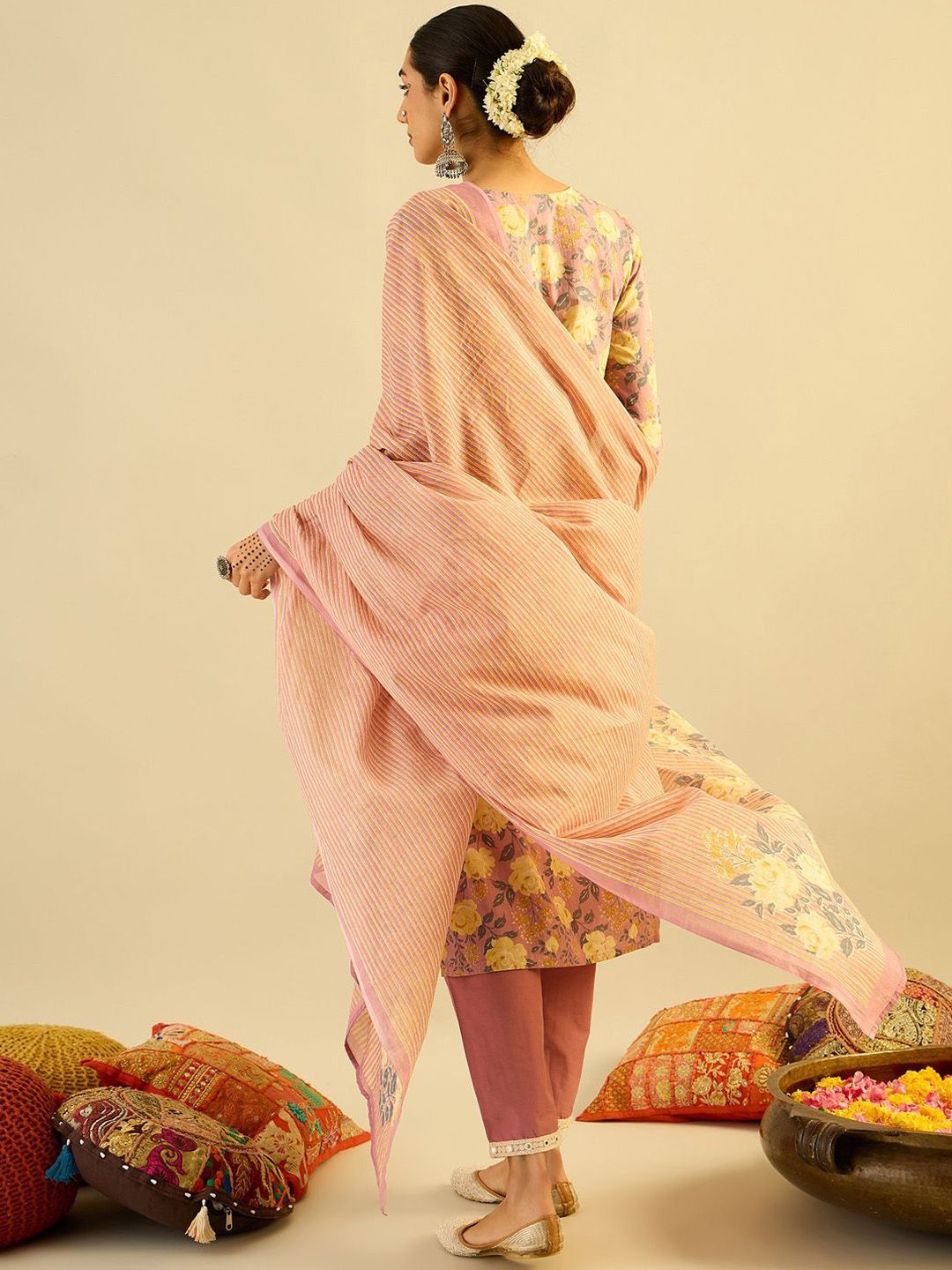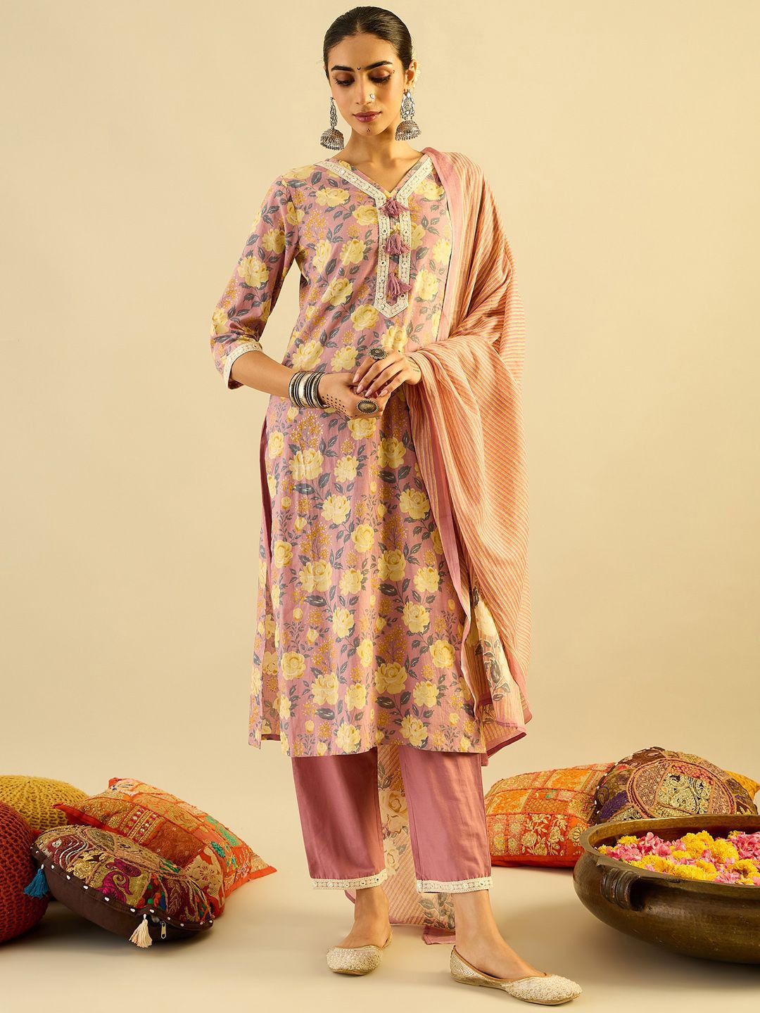 Anouk Floral Printed V-Neck Thread Work Pure Cotton Kurta With Trousers & Dupatta