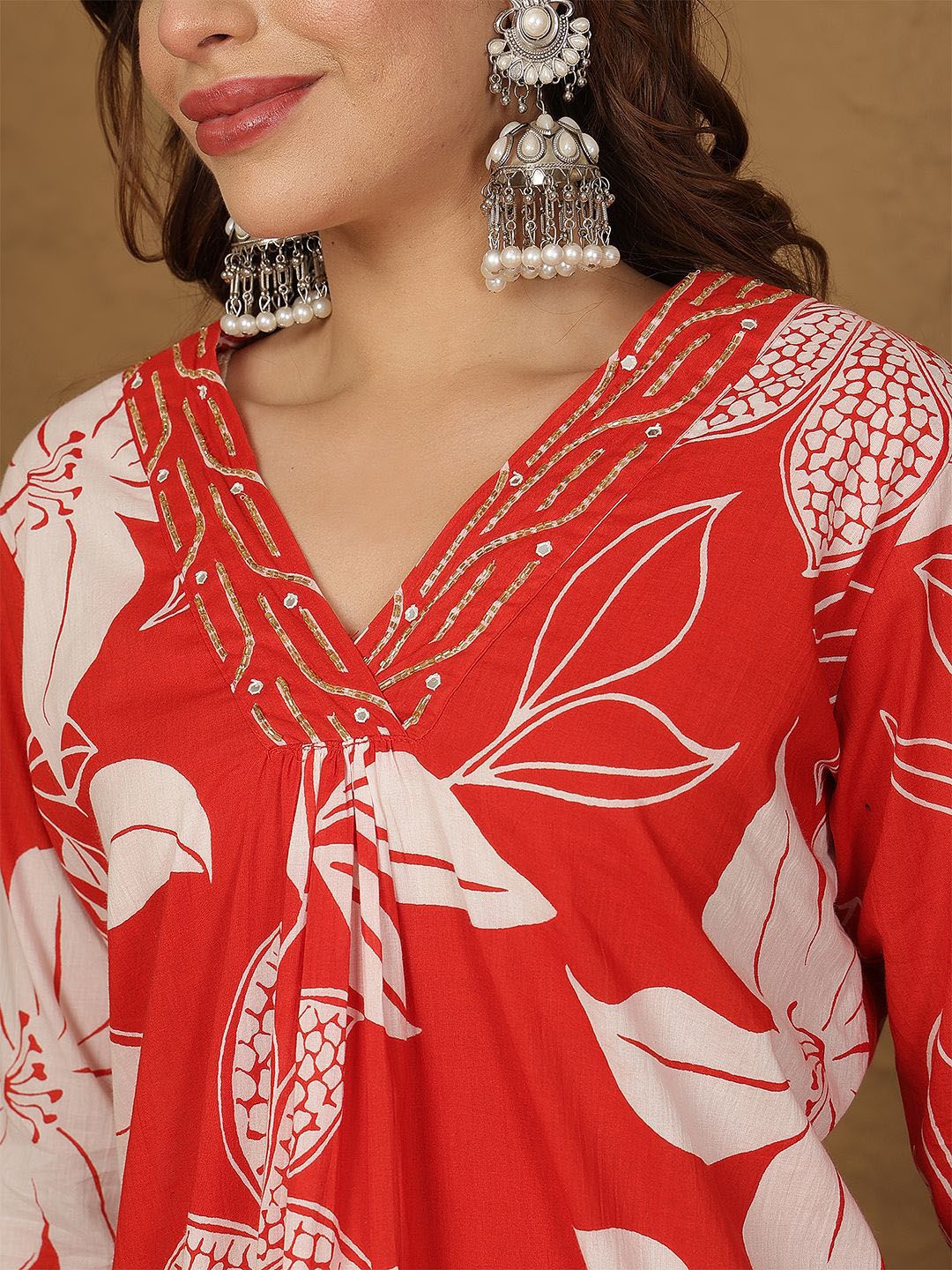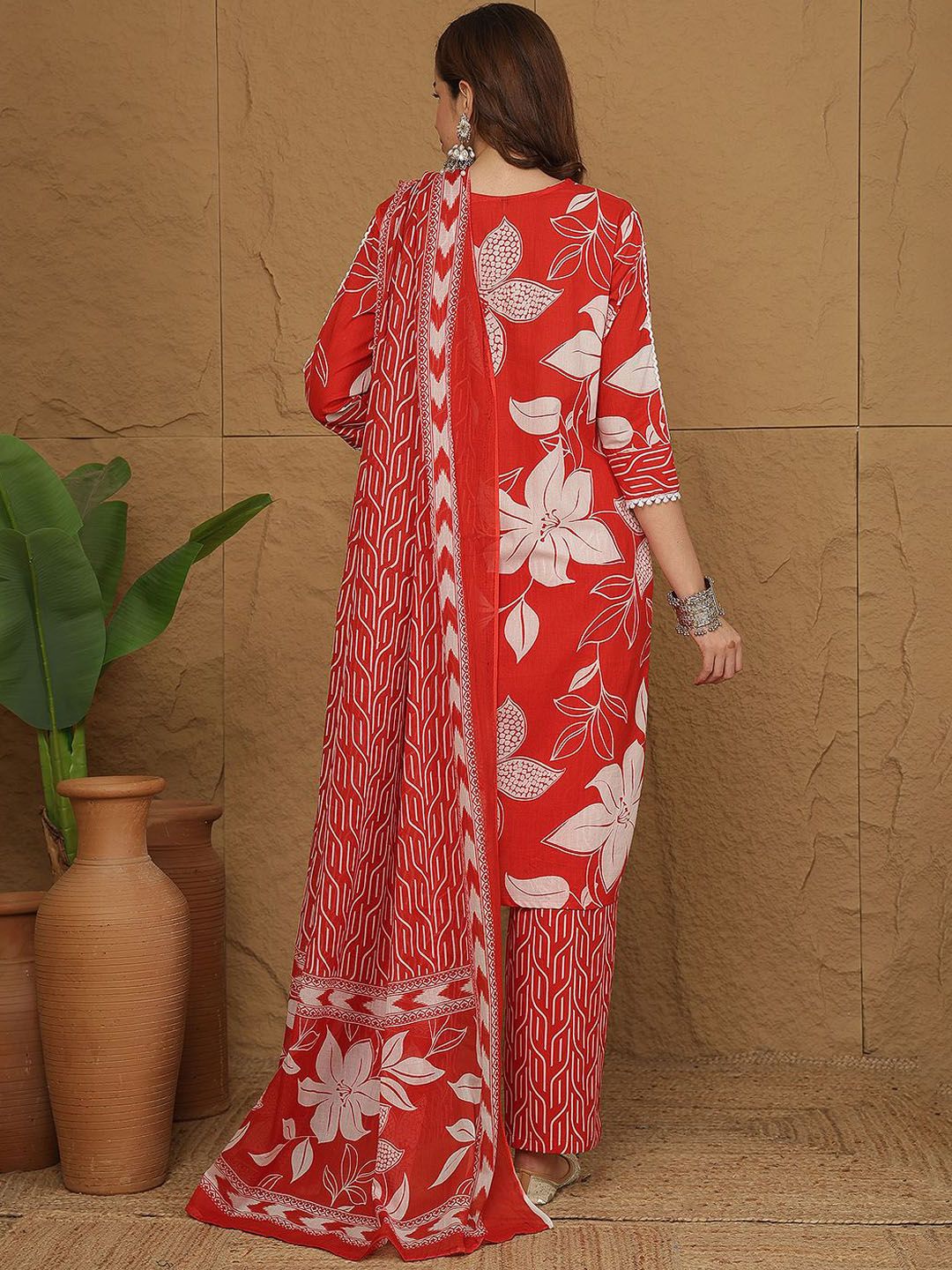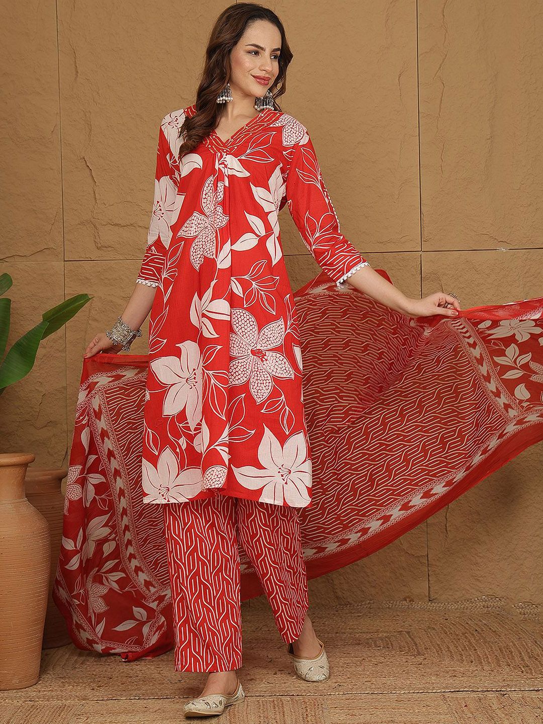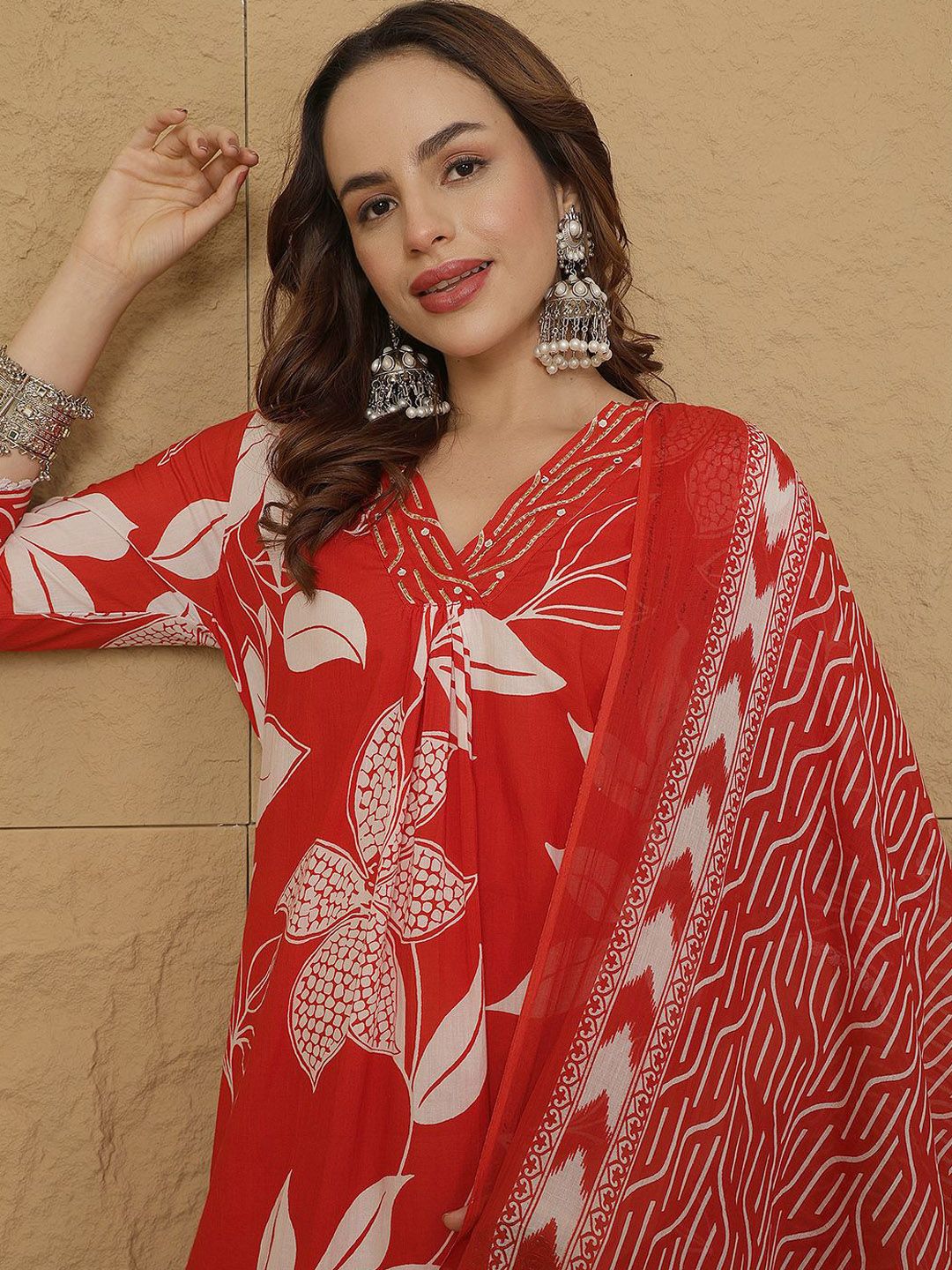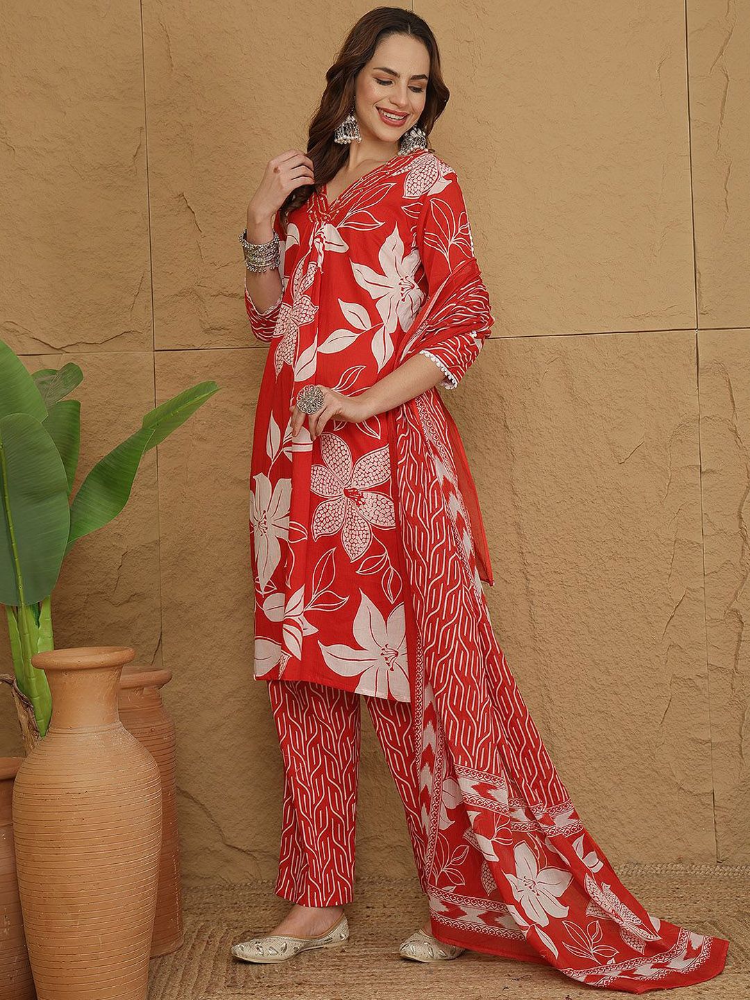 Anouk Floral Printed V-Neck Thread Work Pure Cotton Kurta With Trousers And Dupatta
