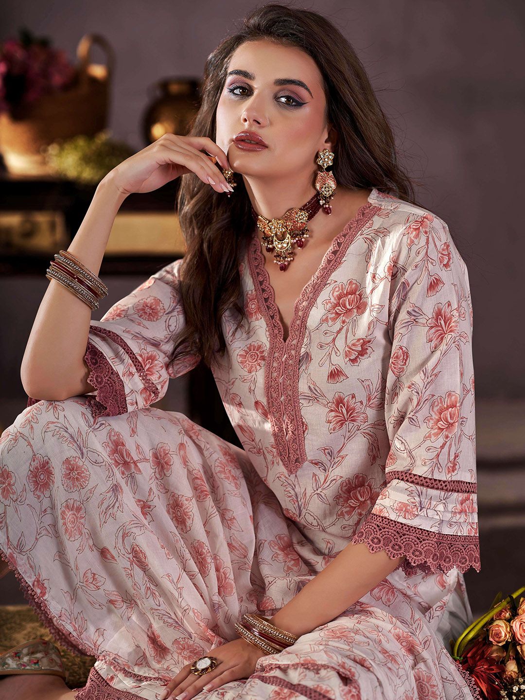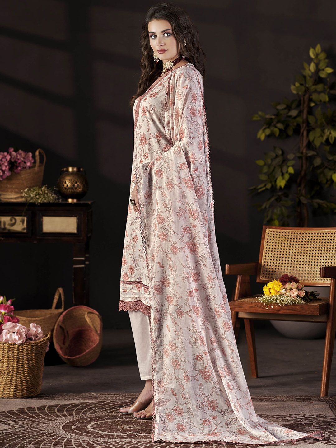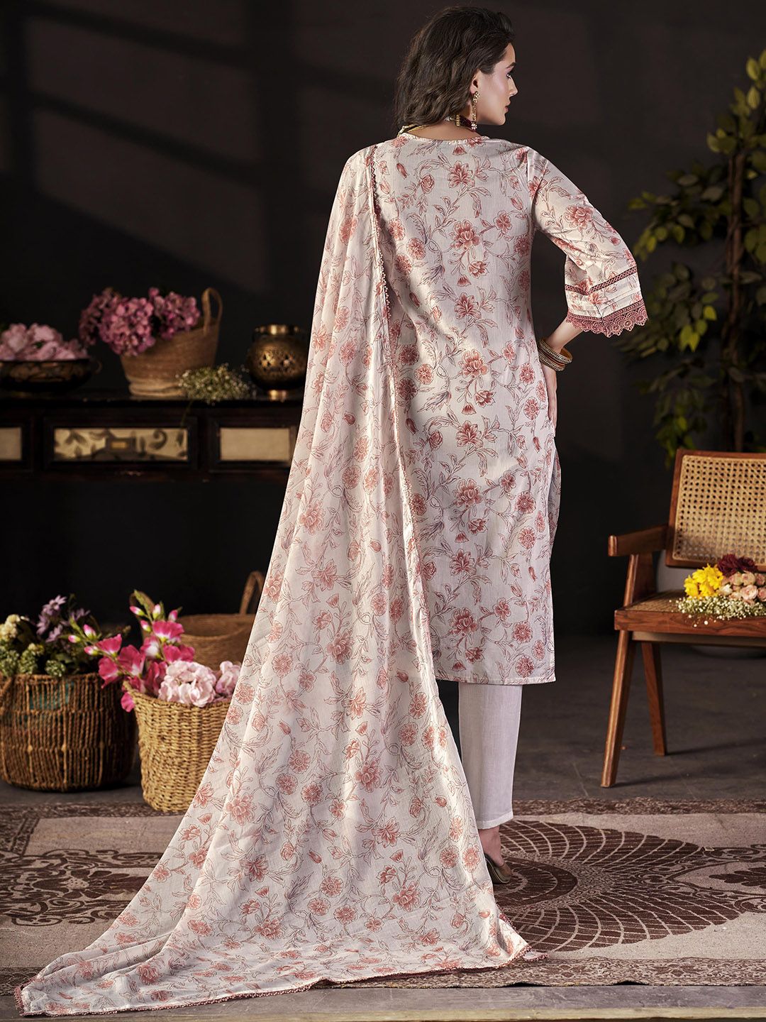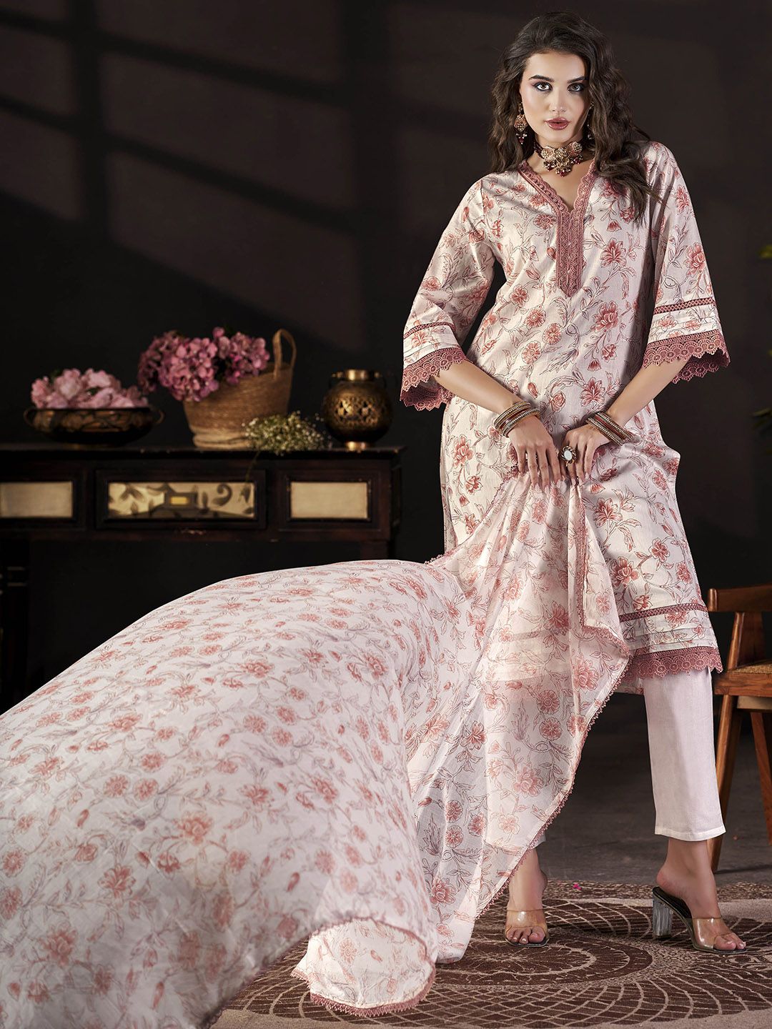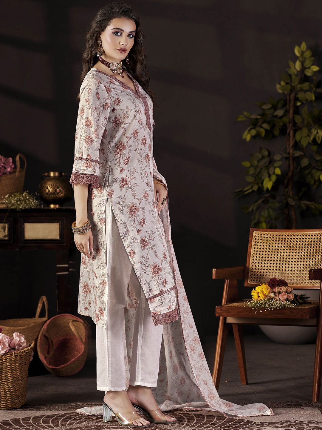 Anouk Floral Printed V-Neck Thread Work Pure Cotton Straight Kurta With Trousers & Dupatta