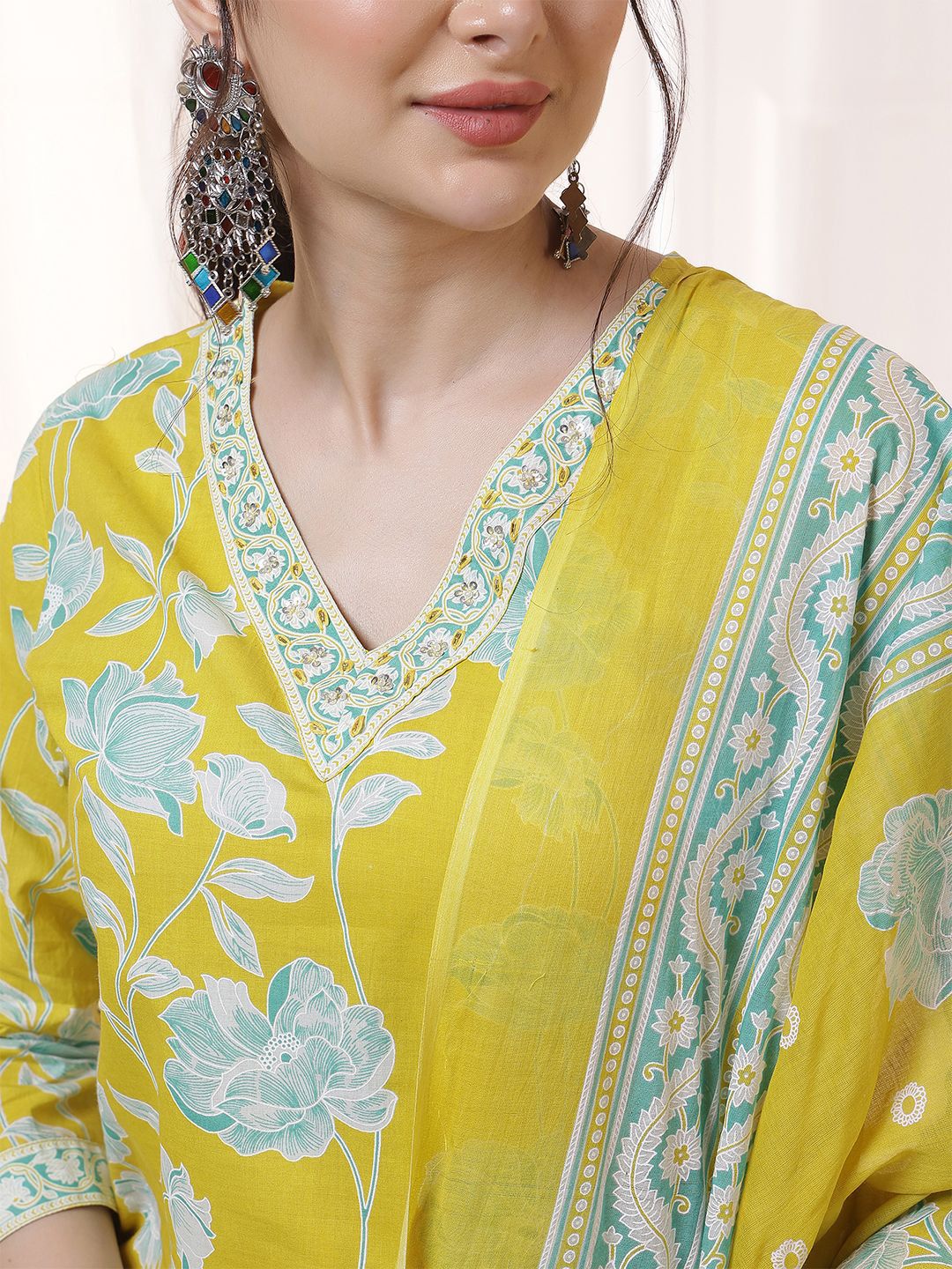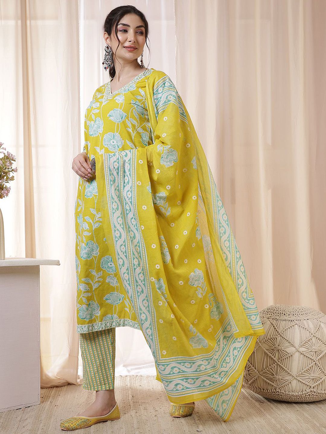 Anouk Floral Printed V-Neck Thread Work Pure Cotton Straight Kurta With Trousers & Dupatta
