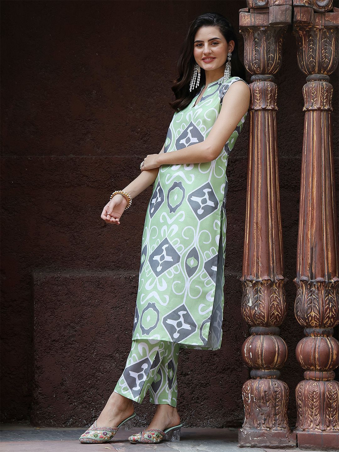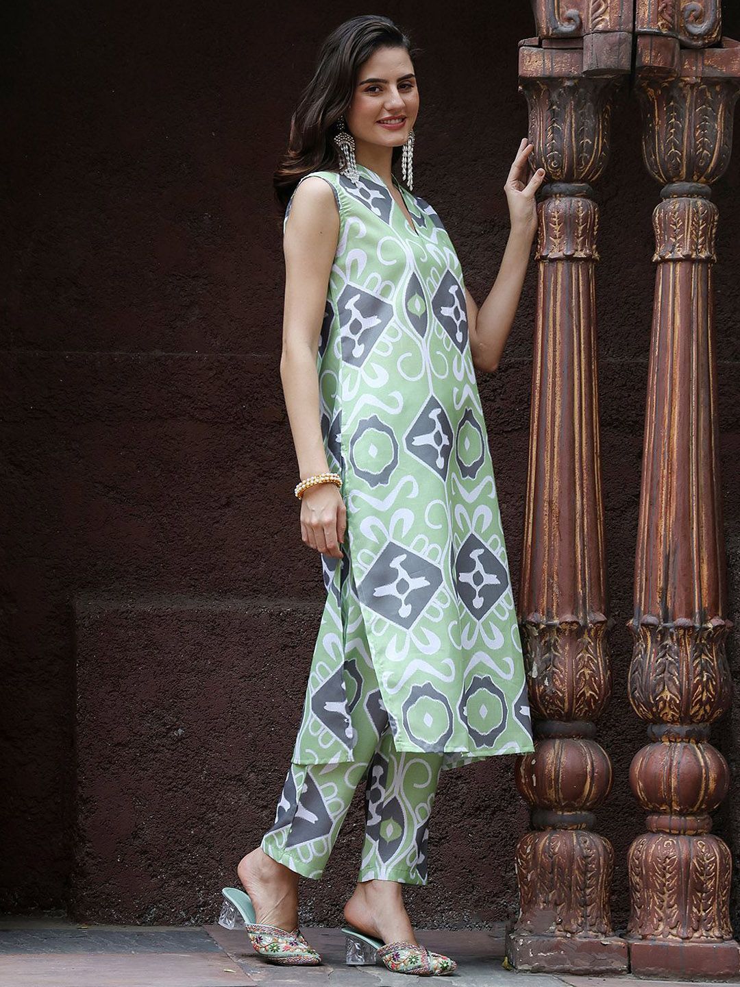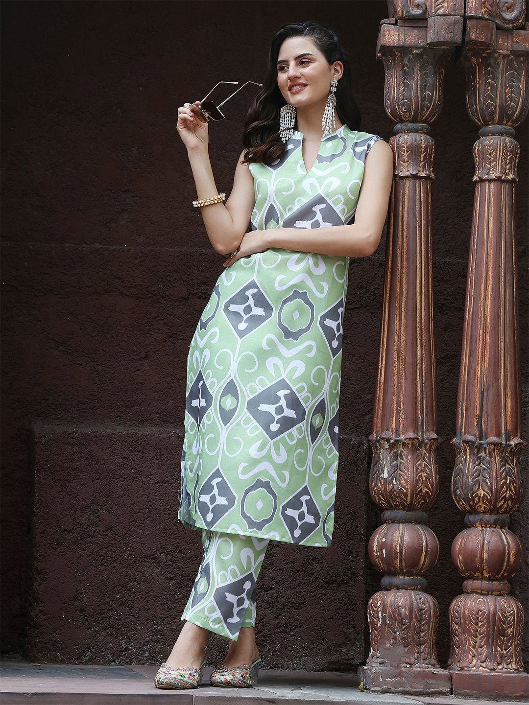 Anouk Geometric Printed Mandarin Collar Straight Kurta With Trousers