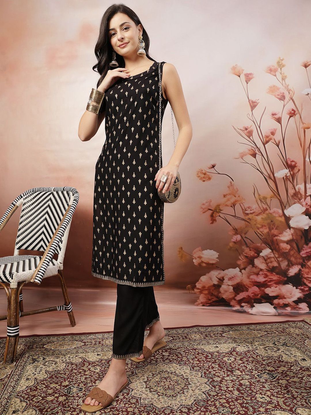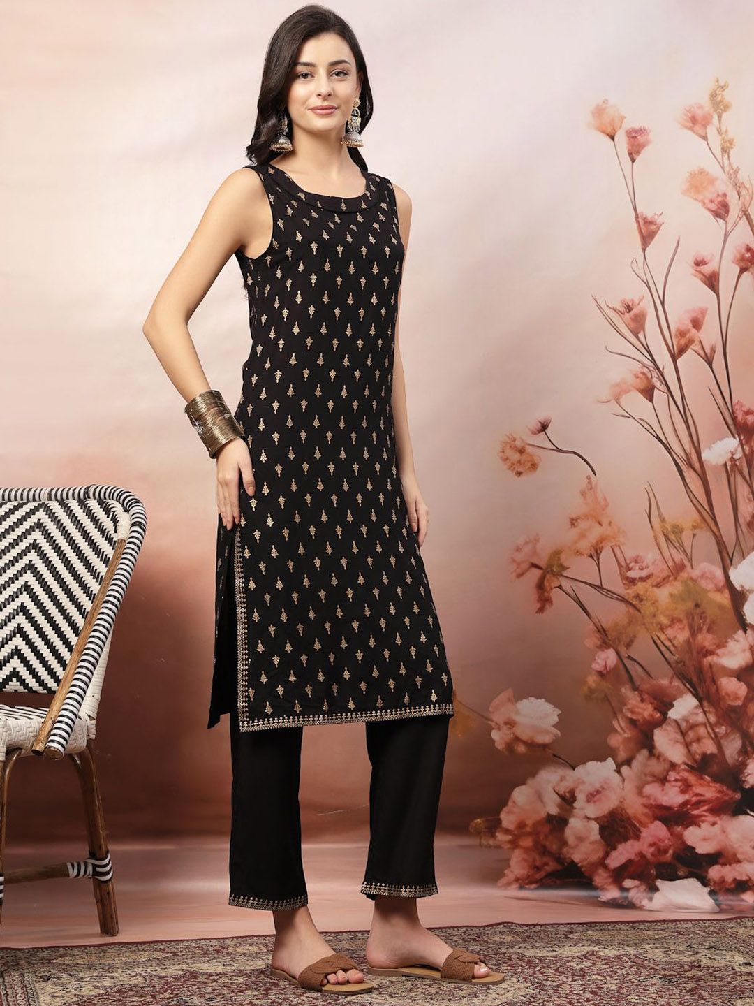 Anouk Rustic Ethnic Motifs Printed Round Neck Pure Cotton Straight Kurta With Trousers