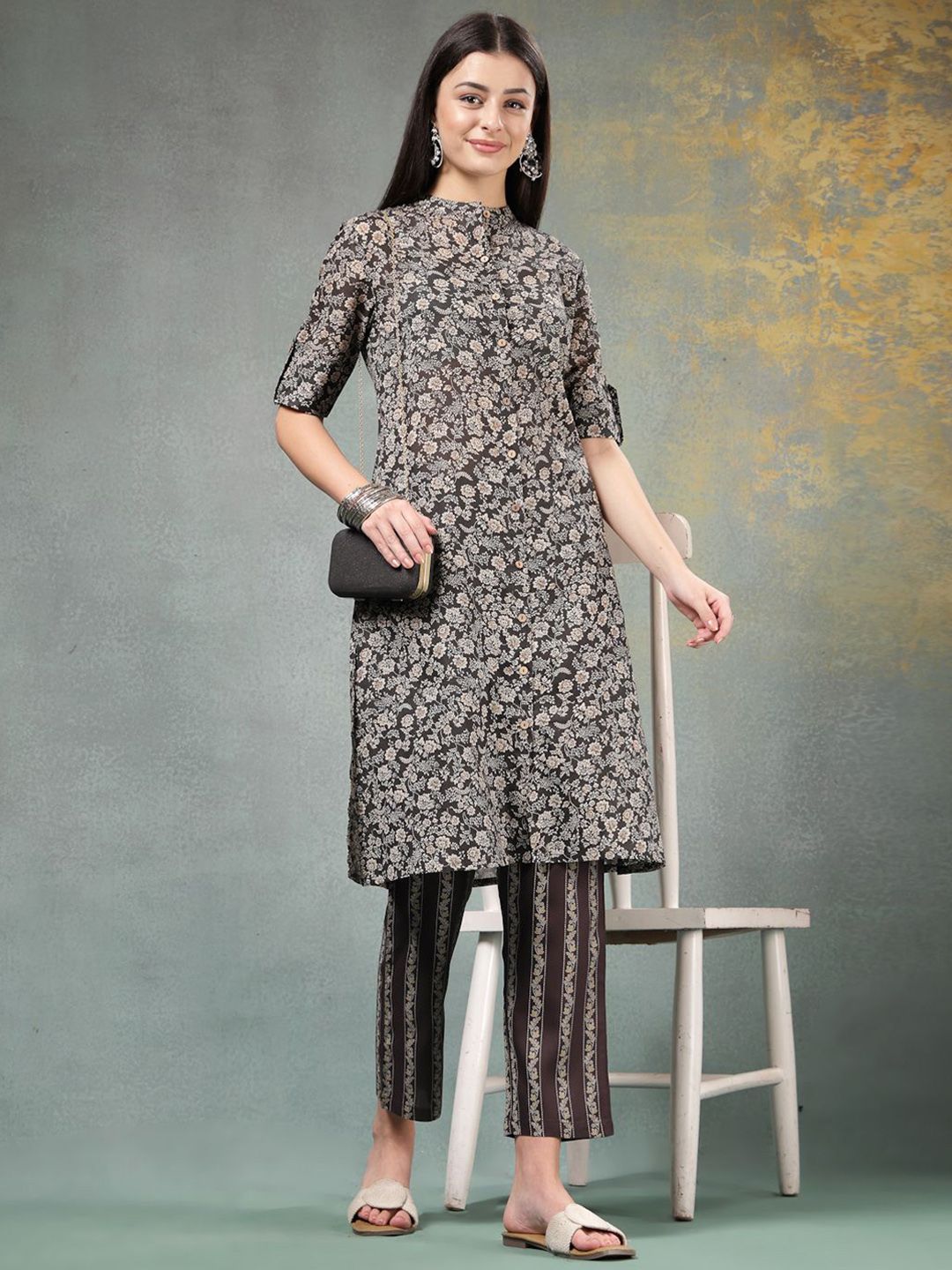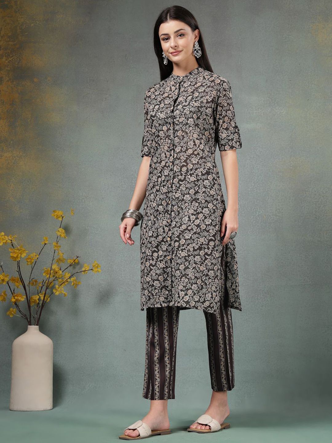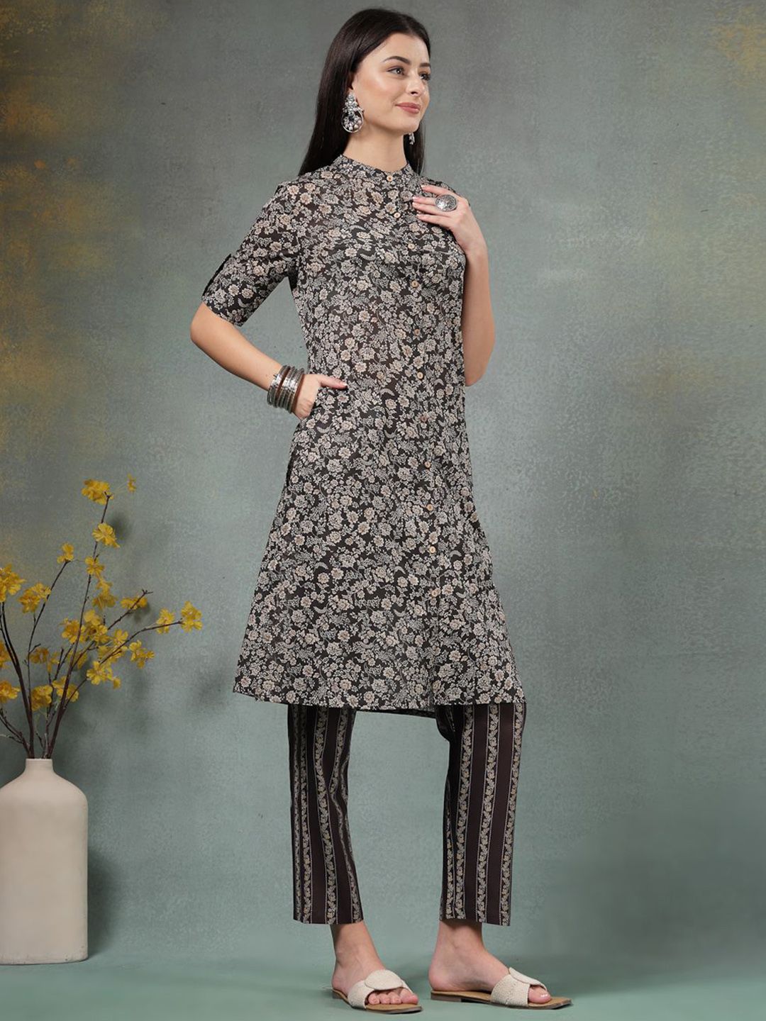 Anouk Rustic Floral Printed Mandarin Collar Pure Cotton Straight Kurta With Trousers