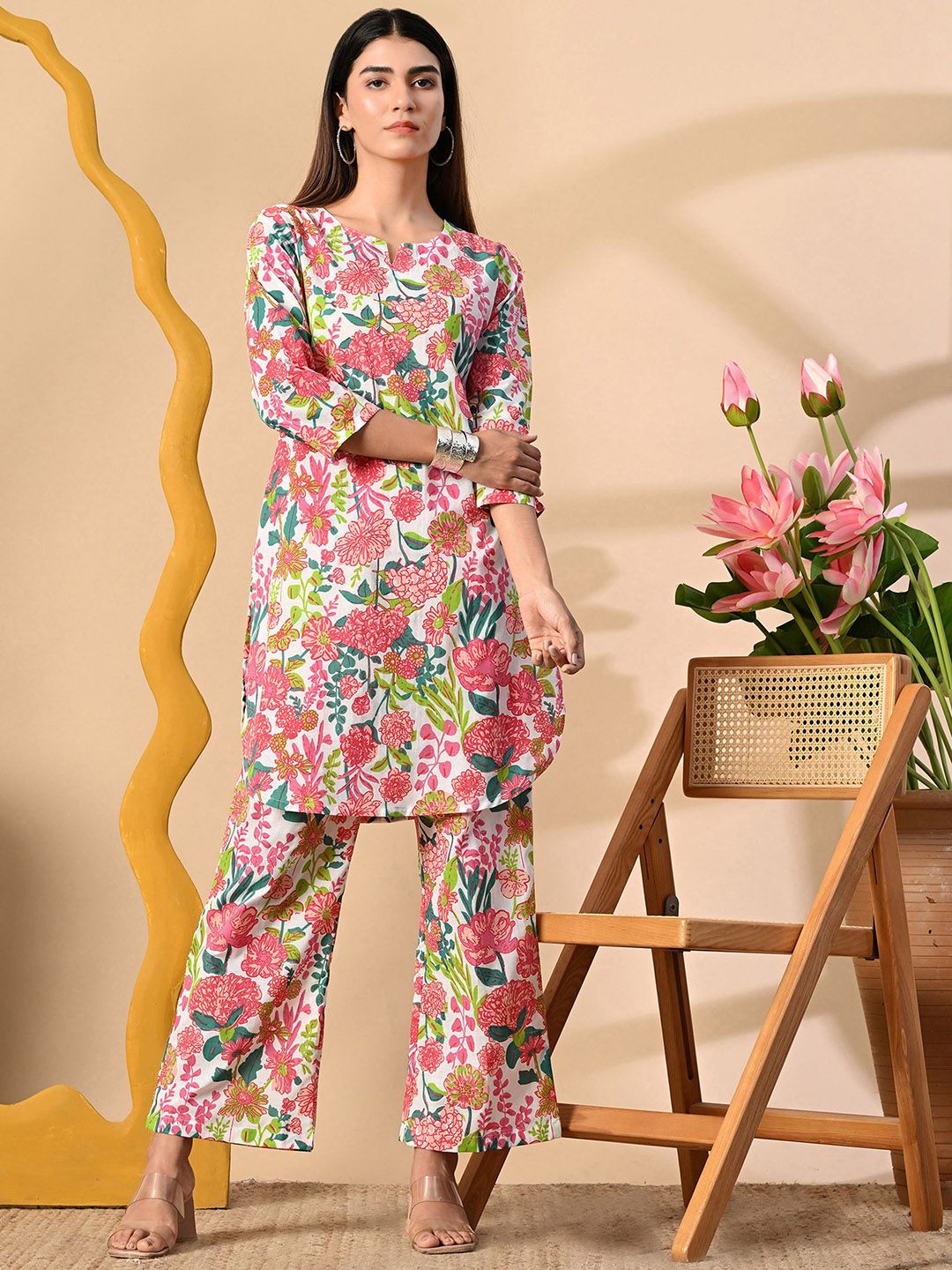 Anouk Rustic Floral Printed Notch Neck Pure Cotton Straight Kurta with Trouser