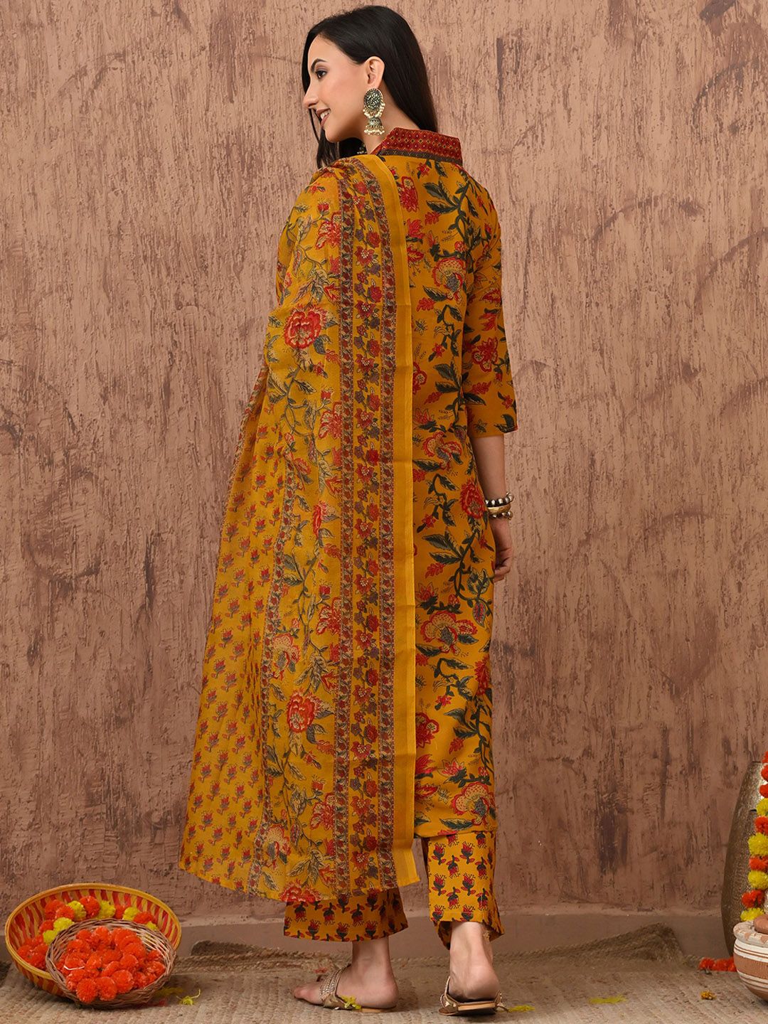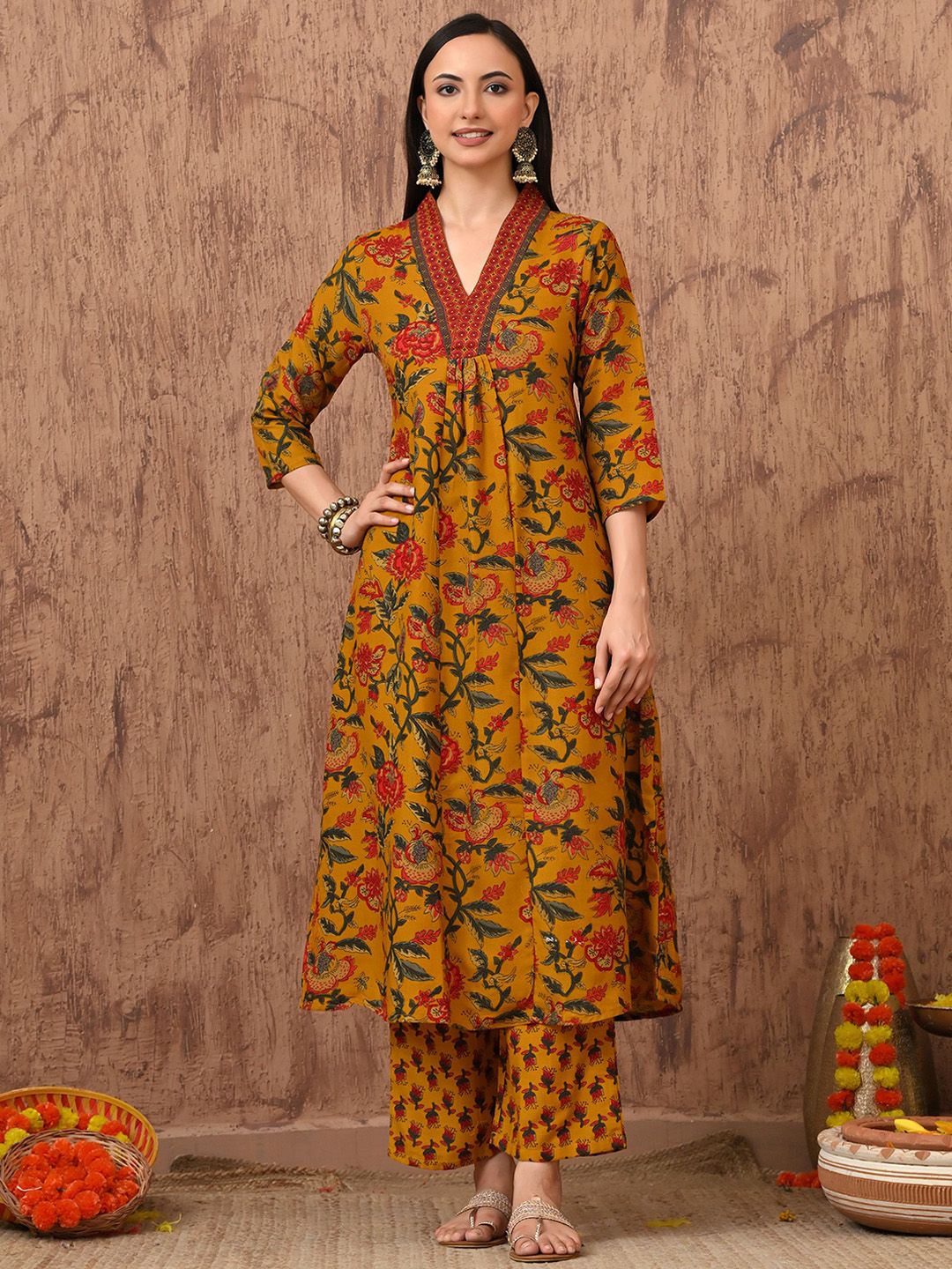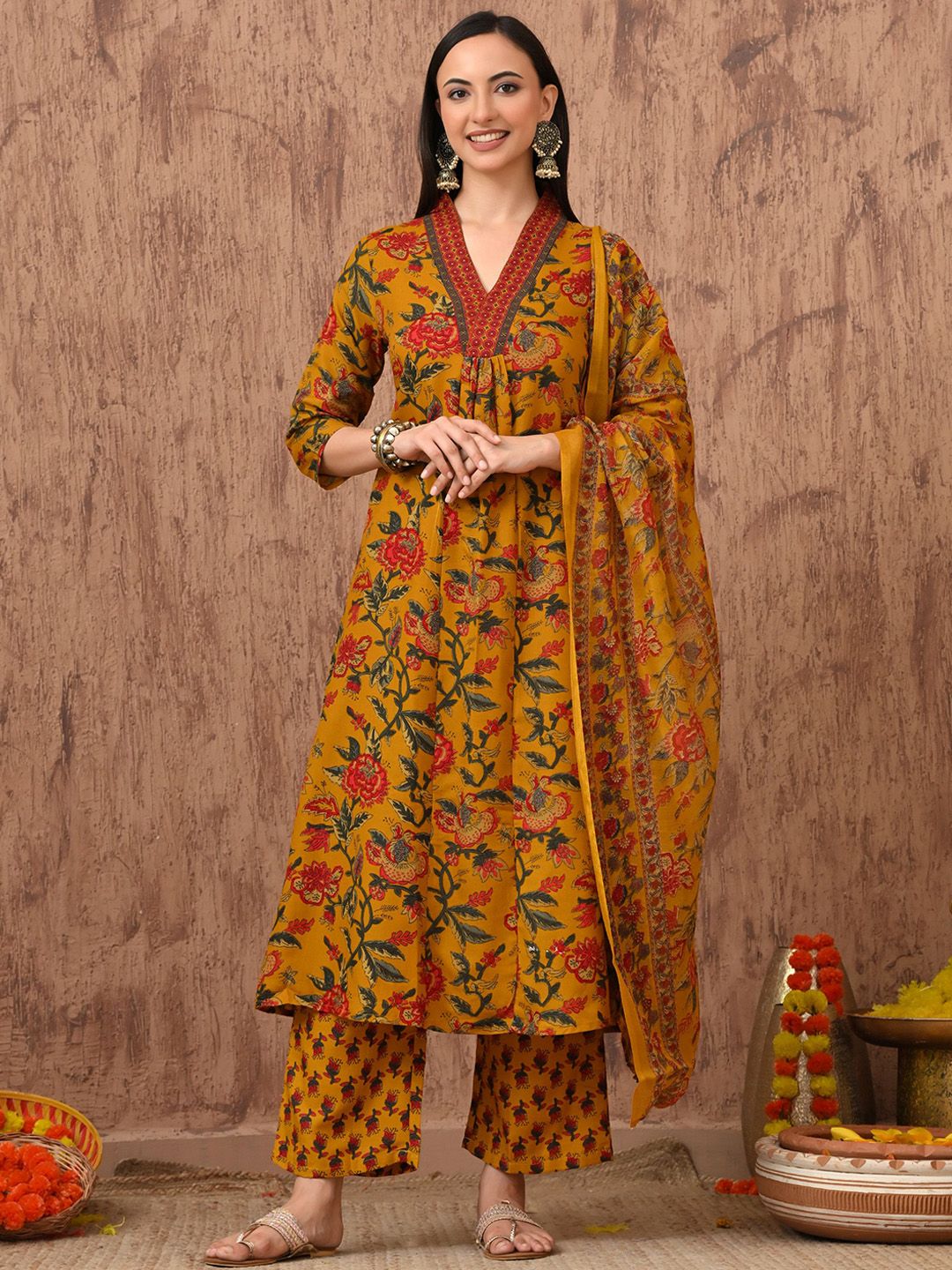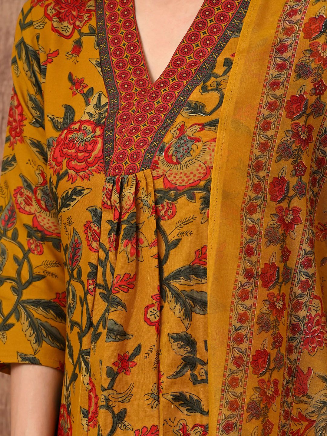 Anouk Rustic Floral Printed Pleated V-Neck A-Line Kurta With Trousers & Dupatta