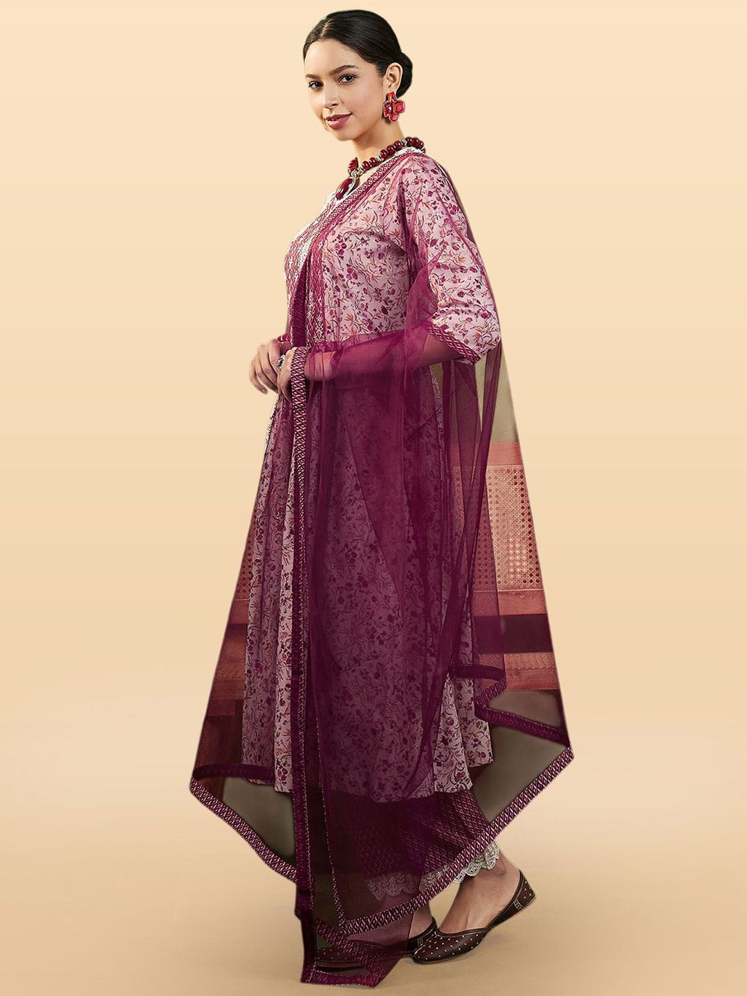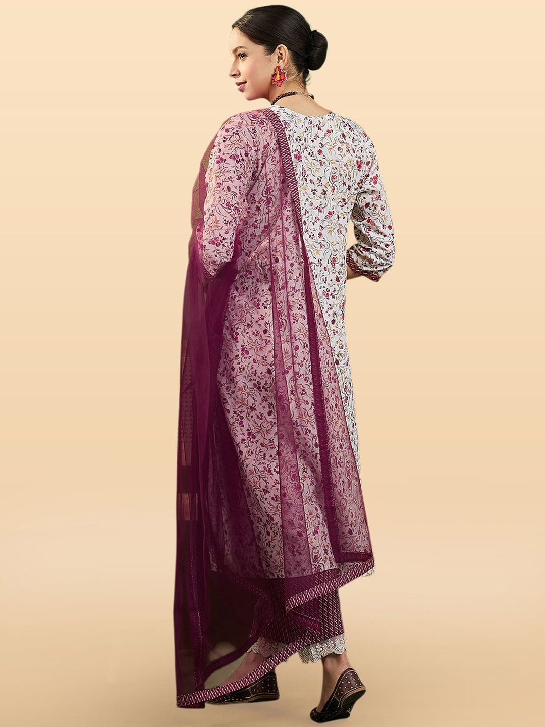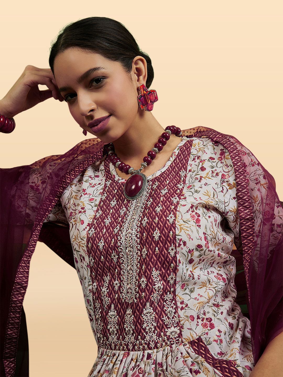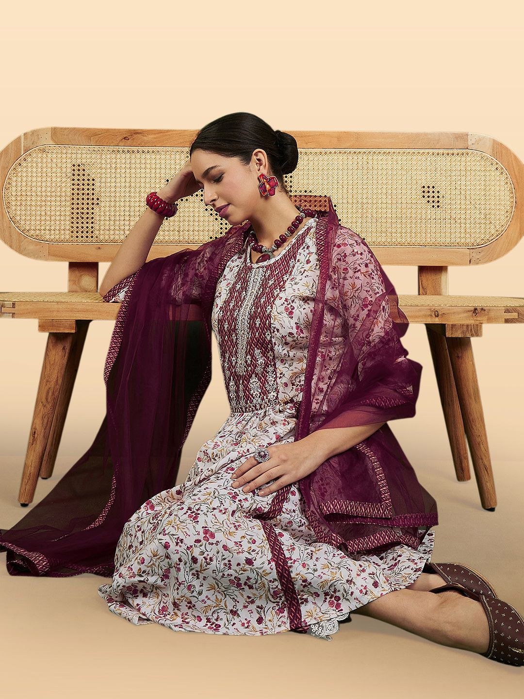 Anouk Rustic Floral Printed Thread Work Cotton A-Line Kurta & Trousers With Dupatta